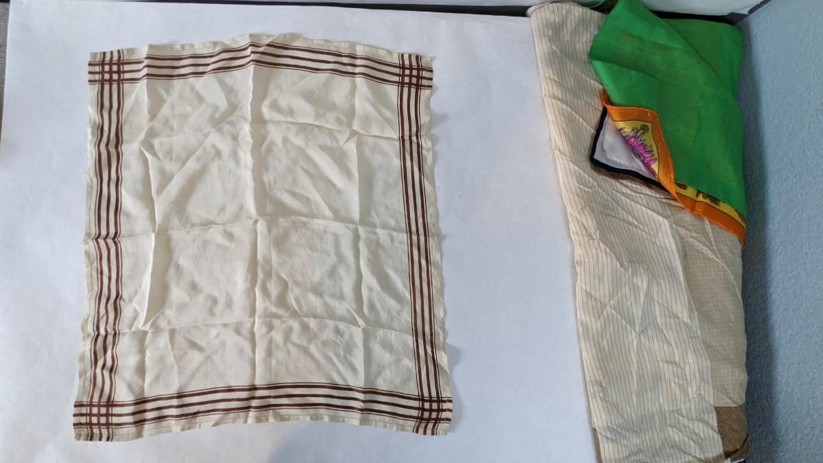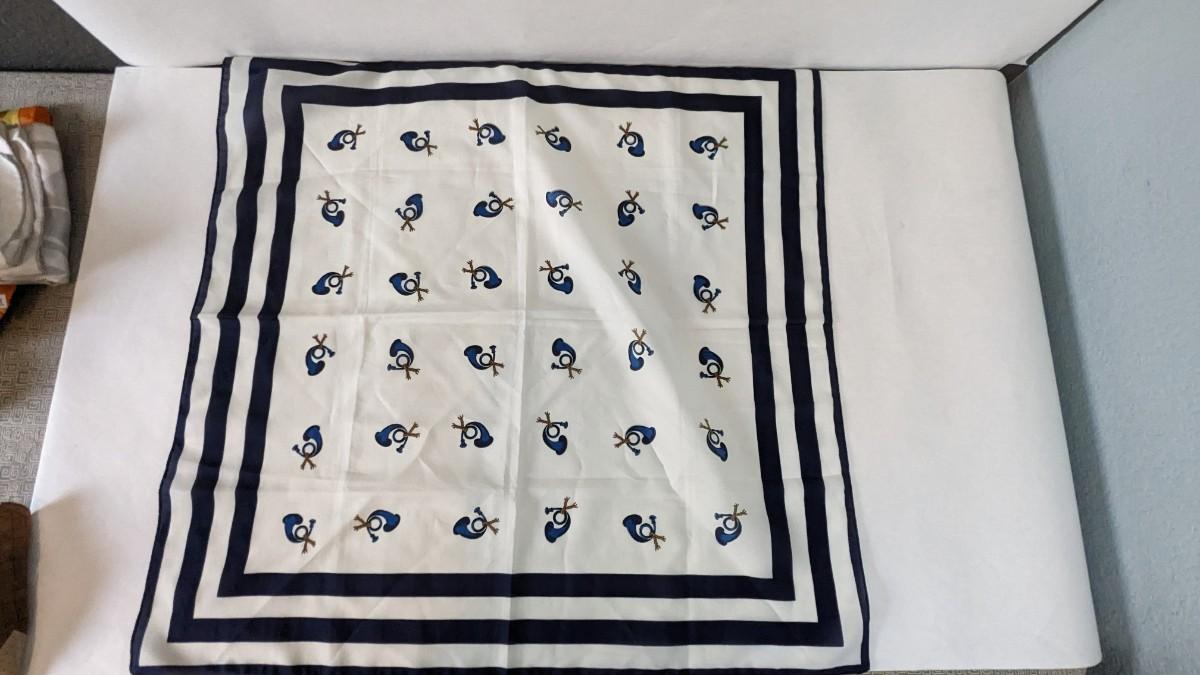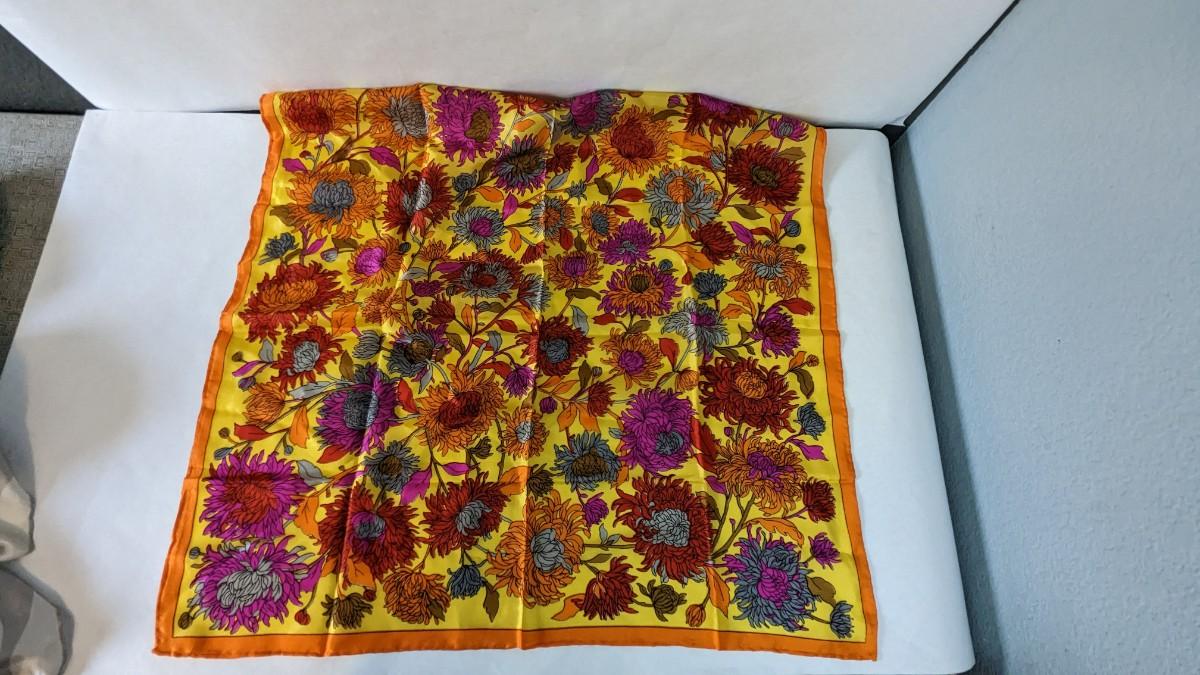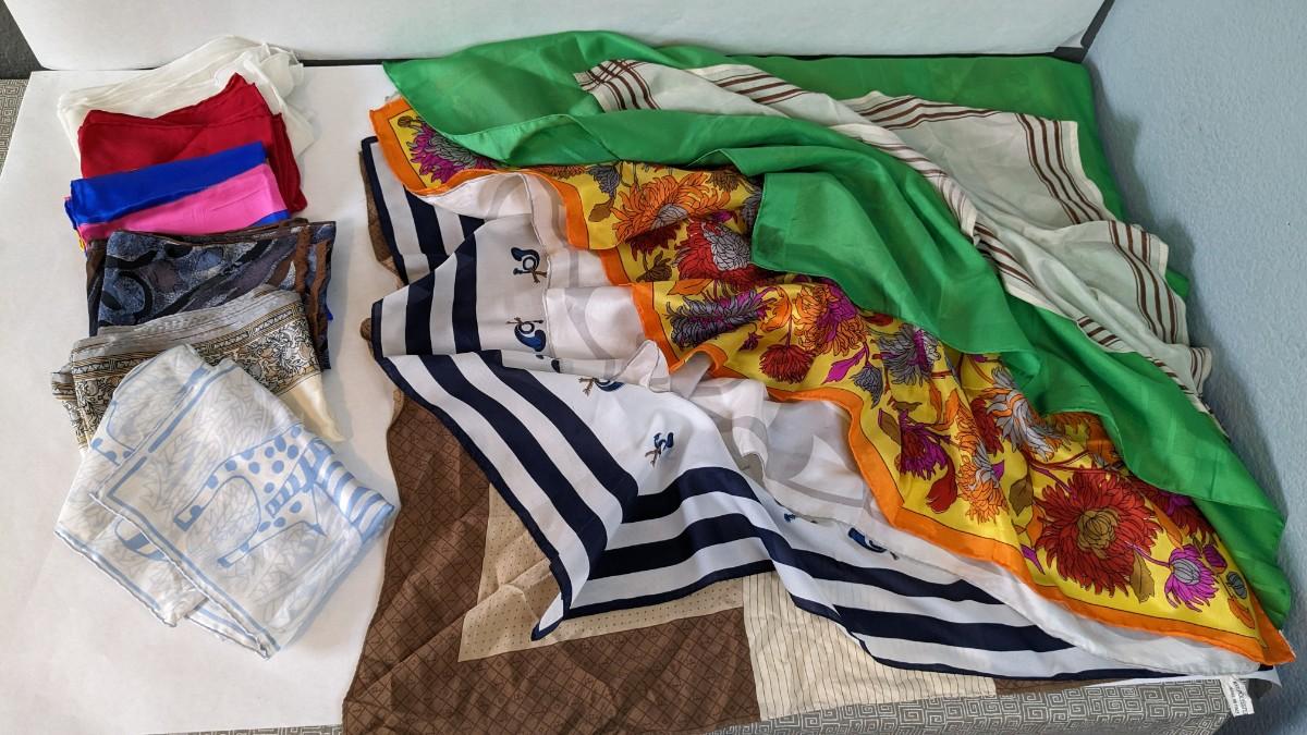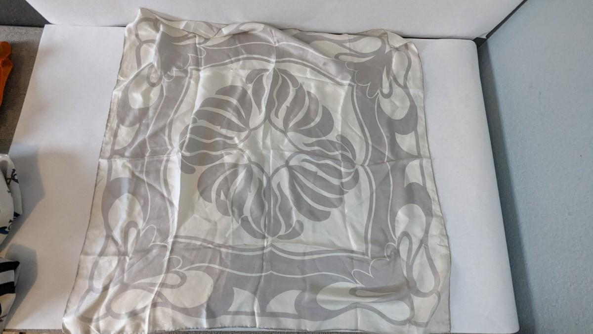 A great little assortment of nearly new 90's silk and chiffon scarves. Includes paisley Oscar De La Renta, please note a very muted spot in photos- this is the only piece with wear. Vera blue and white animals. Bill Blass jewel tone animal print. A STUNNING Lady Heritage bold jewel tone.Including extra long cream chiffon piece and red piece.Sizes range from 61" long to 43.25". Again, all but ODLR are in excellent condition showing only fold lines from storage.