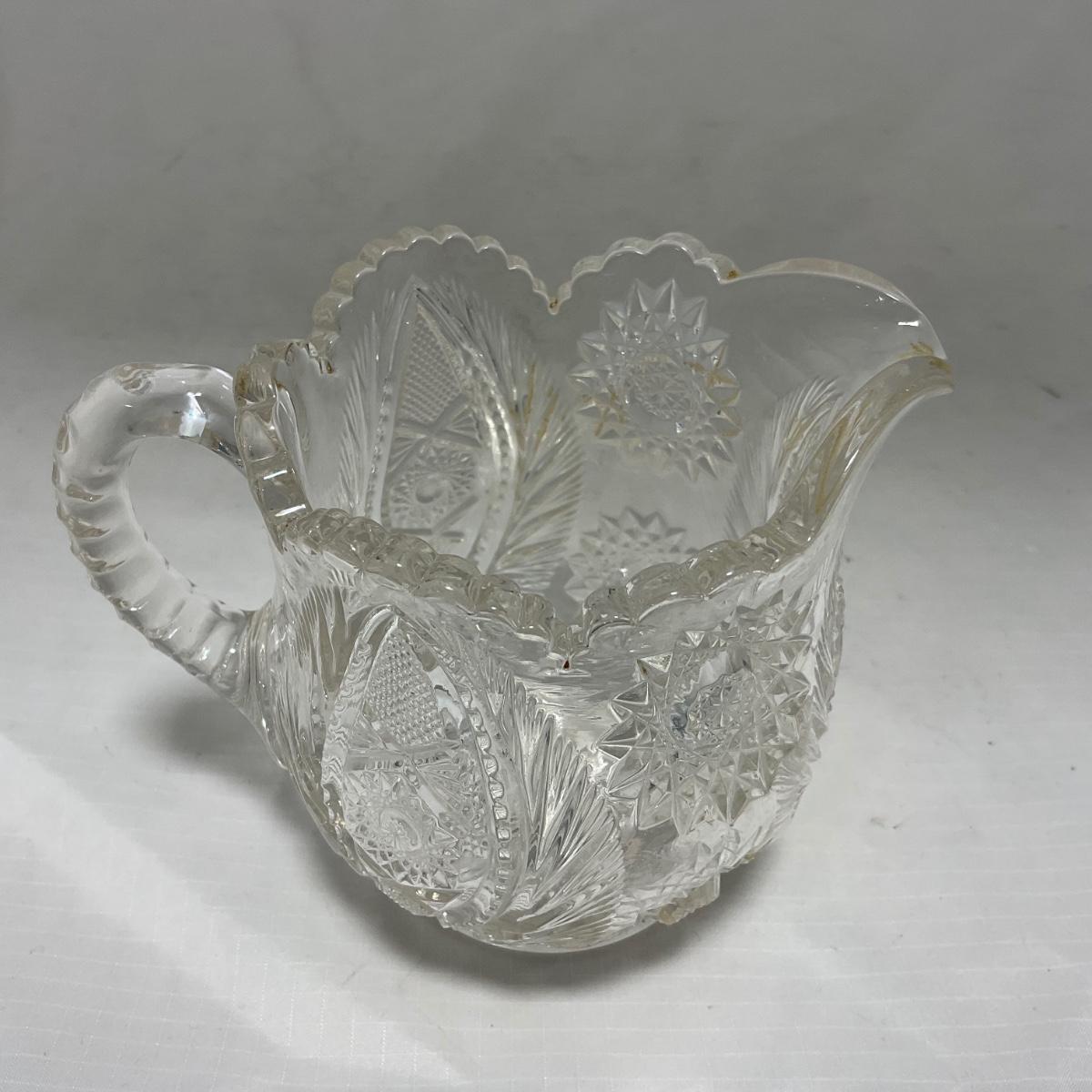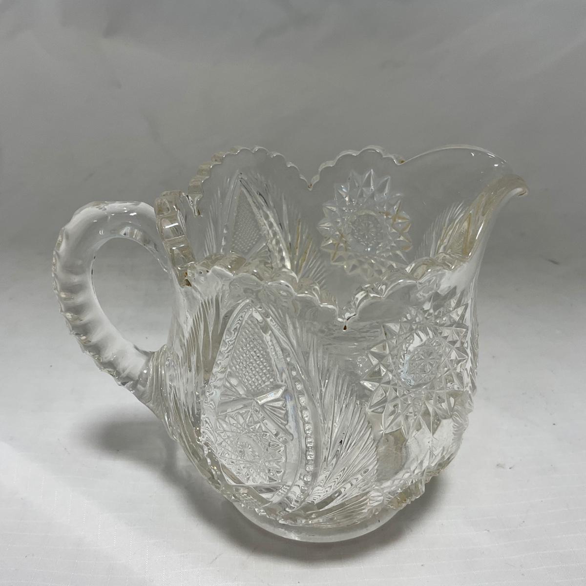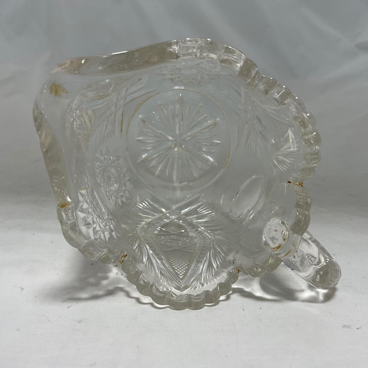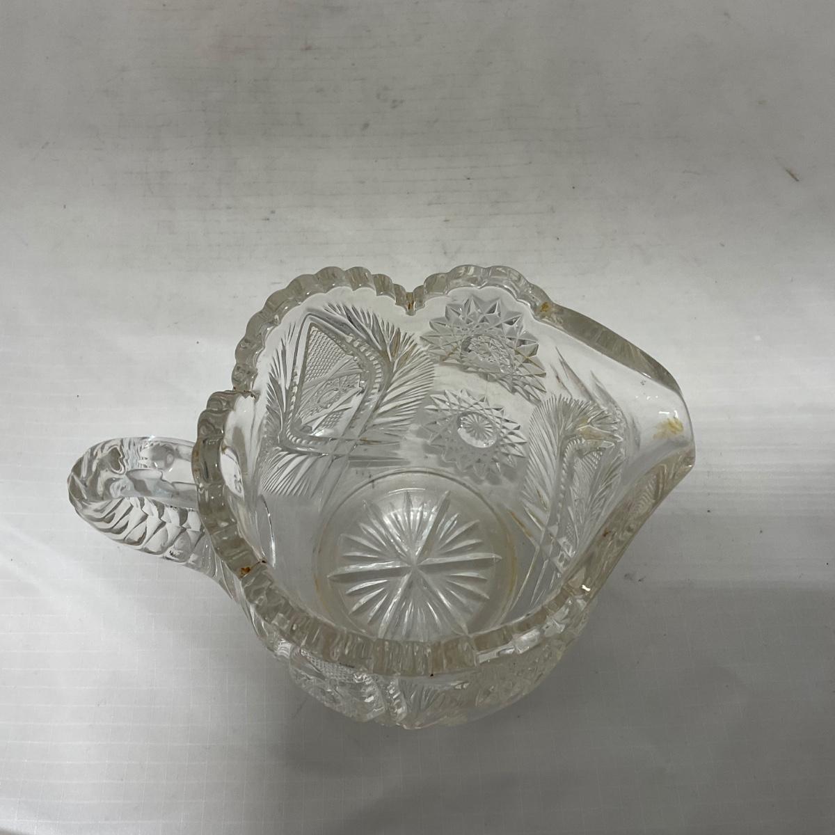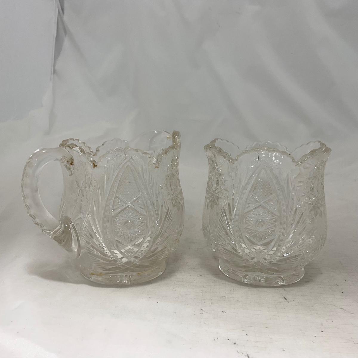 One clear cut glass sugar and creamer set with beautifully cut designs. Please see photos for details and condition. ::: Shipping is available on this lot. If you require shipping you must let us know at the close of the auction. We will coordinate with you after the item has been won. Shipping fees will include insurance up to or exceeding the value of all items being mailed. If you have any questions regarding this lot please contact the auctioneer either via this website, by direct email or by phone. PICK UP TIMES and other important information can be found in the TERMS and DESCRIPTION of the auction. Please take a look for pertinent information. Thanks!