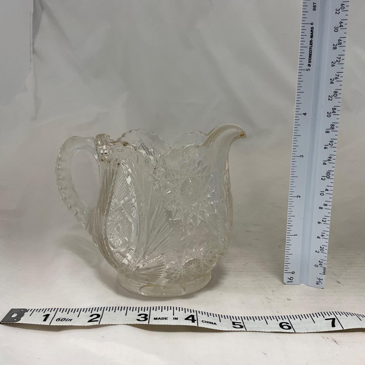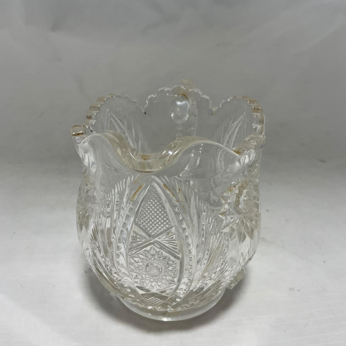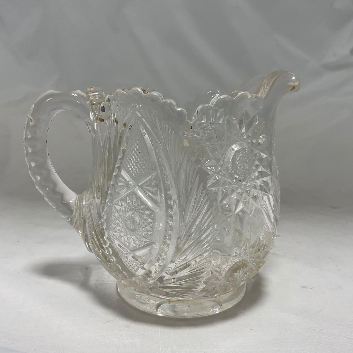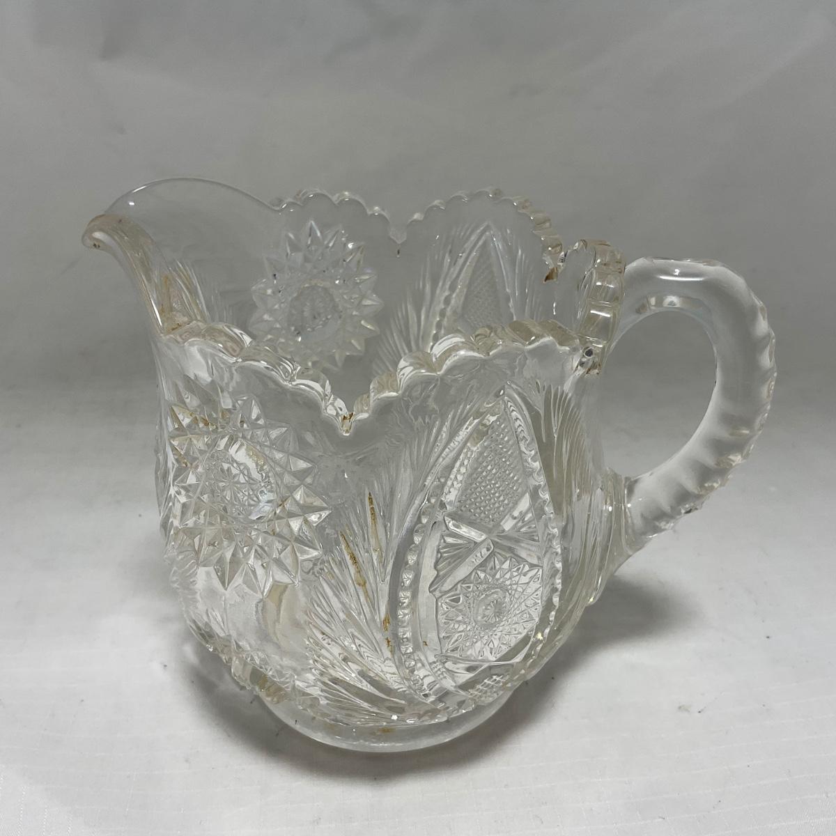 One clear cut glass sugar and creamer set with beautifully cut designs. Please see photos for details and condition. ::: Shipping is available on this lot. If you require shipping you must let us know at the close of the auction. We will coordinate with you after the item has been won. Shipping fees will include insurance up to or exceeding the value of all items being mailed. If you have any questions regarding this lot please contact the auctioneer either via this website, by direct email or by phone. PICK UP TIMES and other important information can be found in the TERMS and DESCRIPTION of the auction. Please take a look for pertinent information. Thanks!