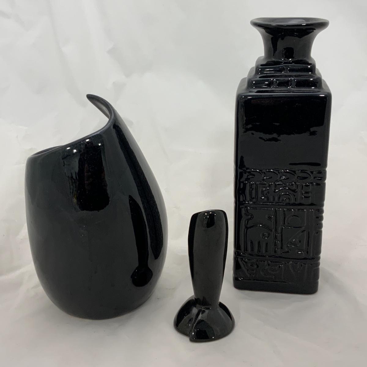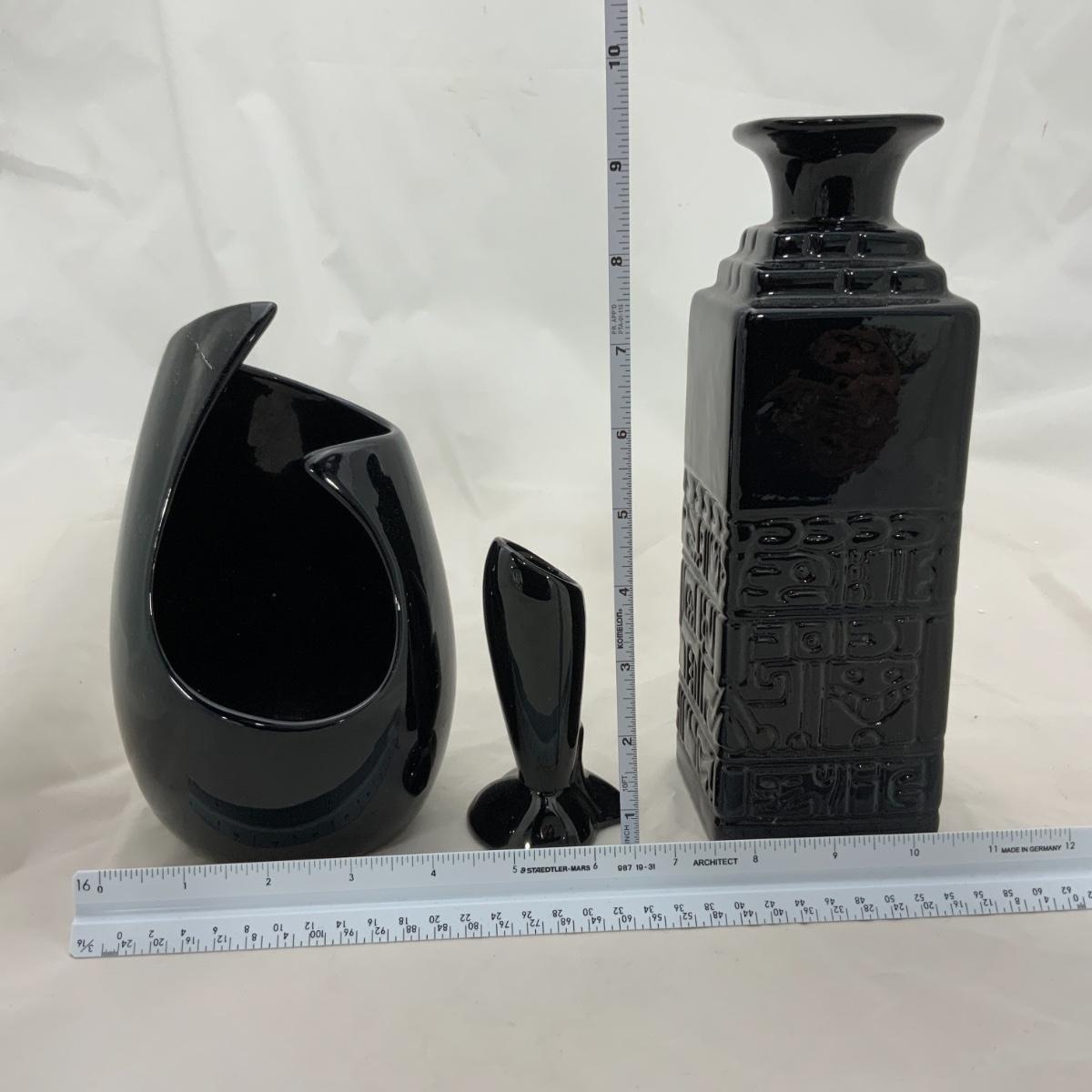 From the Estate of Peter and Alice Radovanovich: Three Black Frankoma Pottery Pieces. Two Vases and a candle holder. The candle holder has been repaired previously. Please see photos for details and condition. ::: Shipping is NOT available on this lot. If you have any questions regarding this lot please contact the auctioneer either via this website, by direct email or by phone. PICK UP TIMES and other important information can be found in the TERMS and DESCRIPTION of the auction. Please take a look for pertinent information. Thanks!