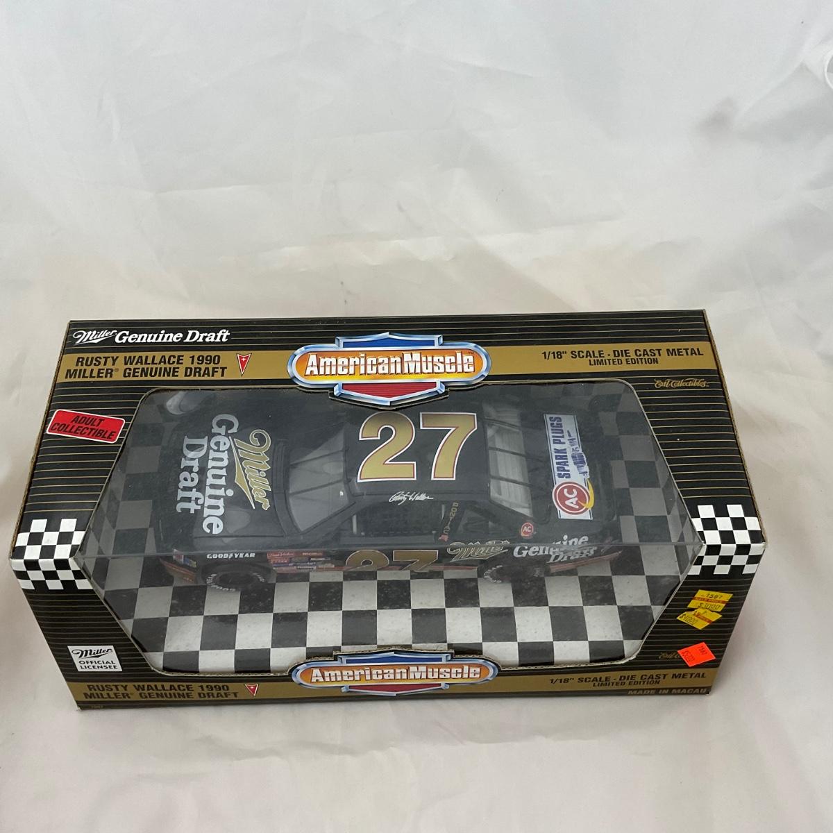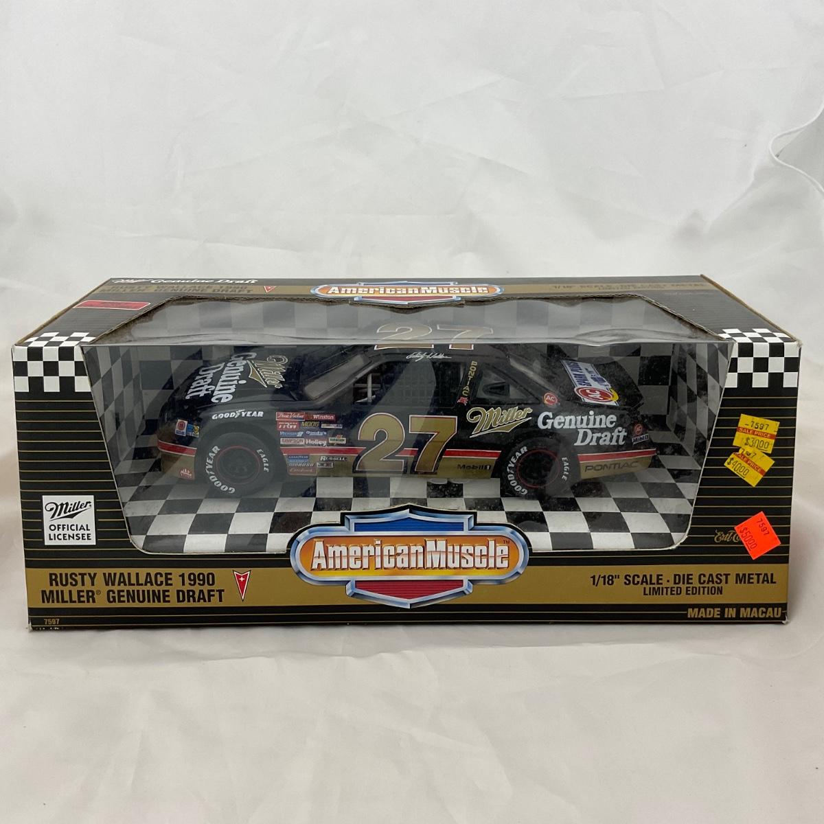 One NASCAR die cast 1:18 scale 1990 Miller Genuine Draft Pontiac in box. Driver Rusty Wallace. Please see photos for details and condition. ::: Shipping is available on this lot. If you require shipping you must let us know at the close of the auction. We will coordinate with you after the item has been won. Shipping fees will include insurance up to or exceeding the value of all items being mailed. If you have any questions regarding this lot please contact the auctioneer either via this website, by direct email or by phone. PICK UP TIMES and other important information can be found in the TERMS and DESCRIPTION of the auction. Please take a look for pertinent information. Thanks!