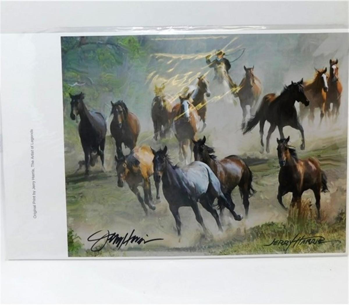 91 Original Print by the Late Jerry Harris Signed & Embossed Cowboy and Mustangs