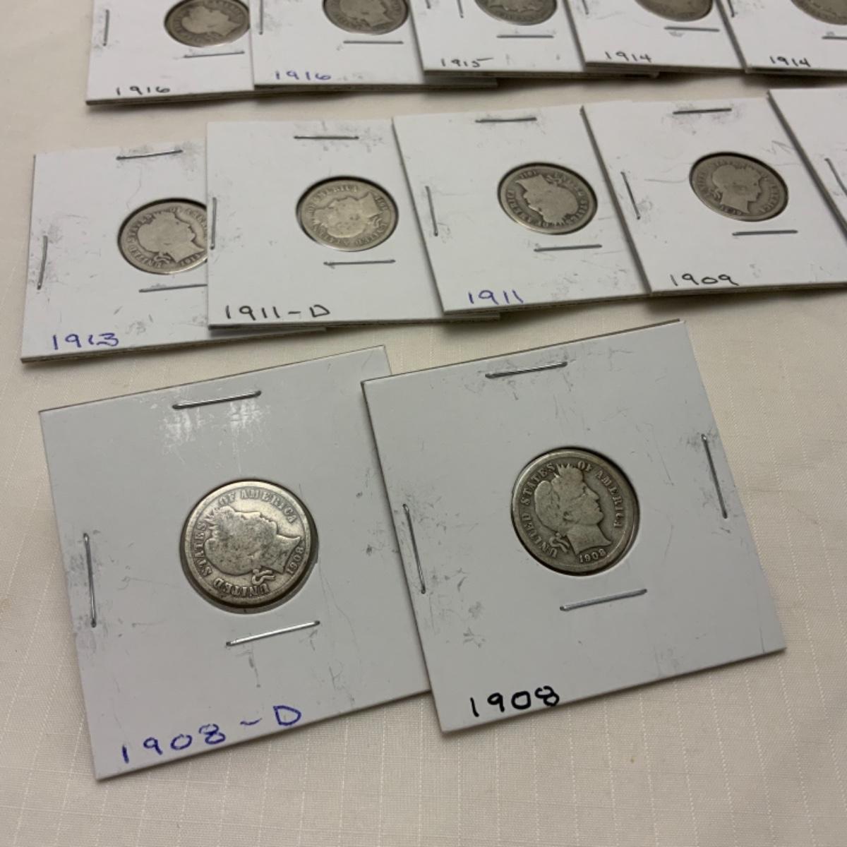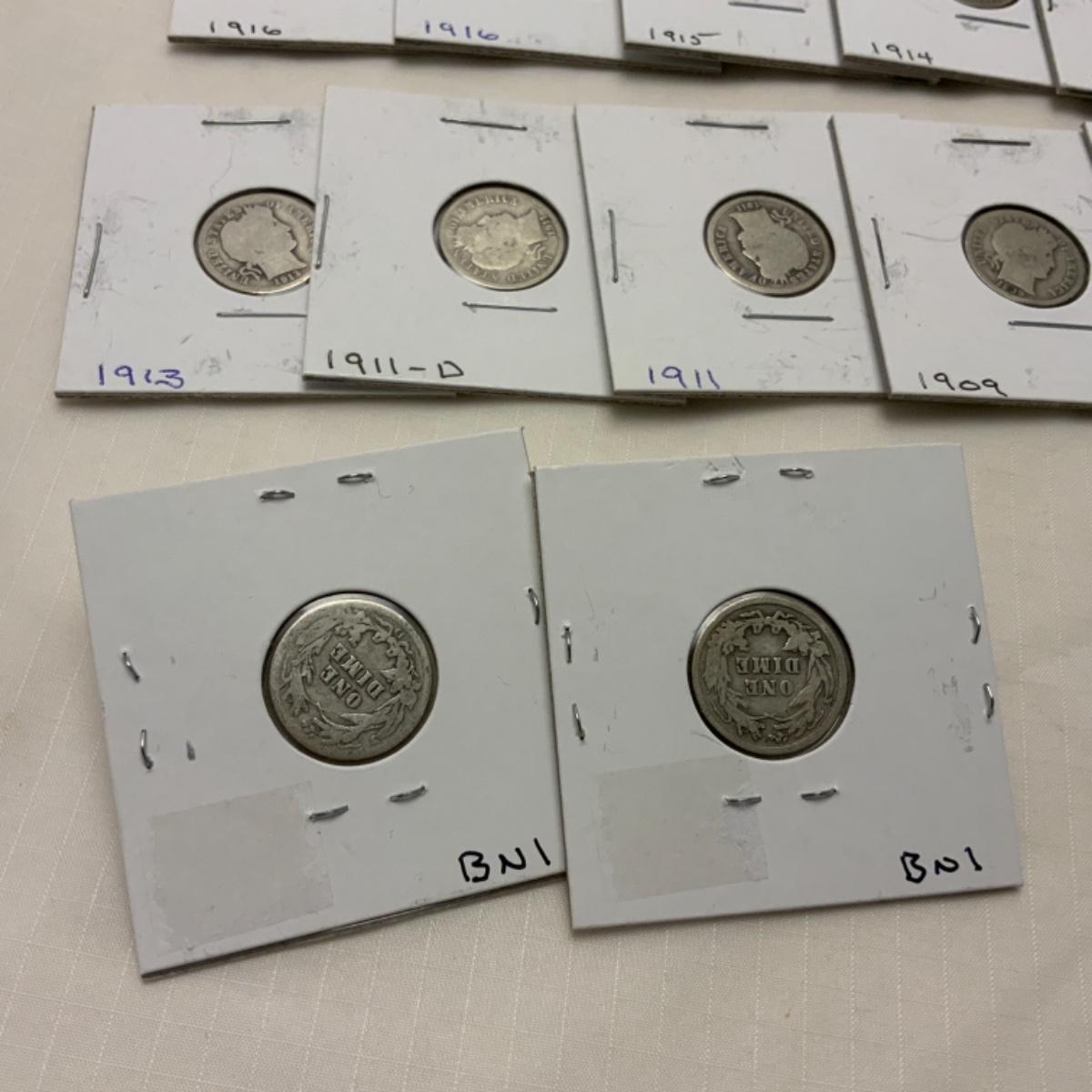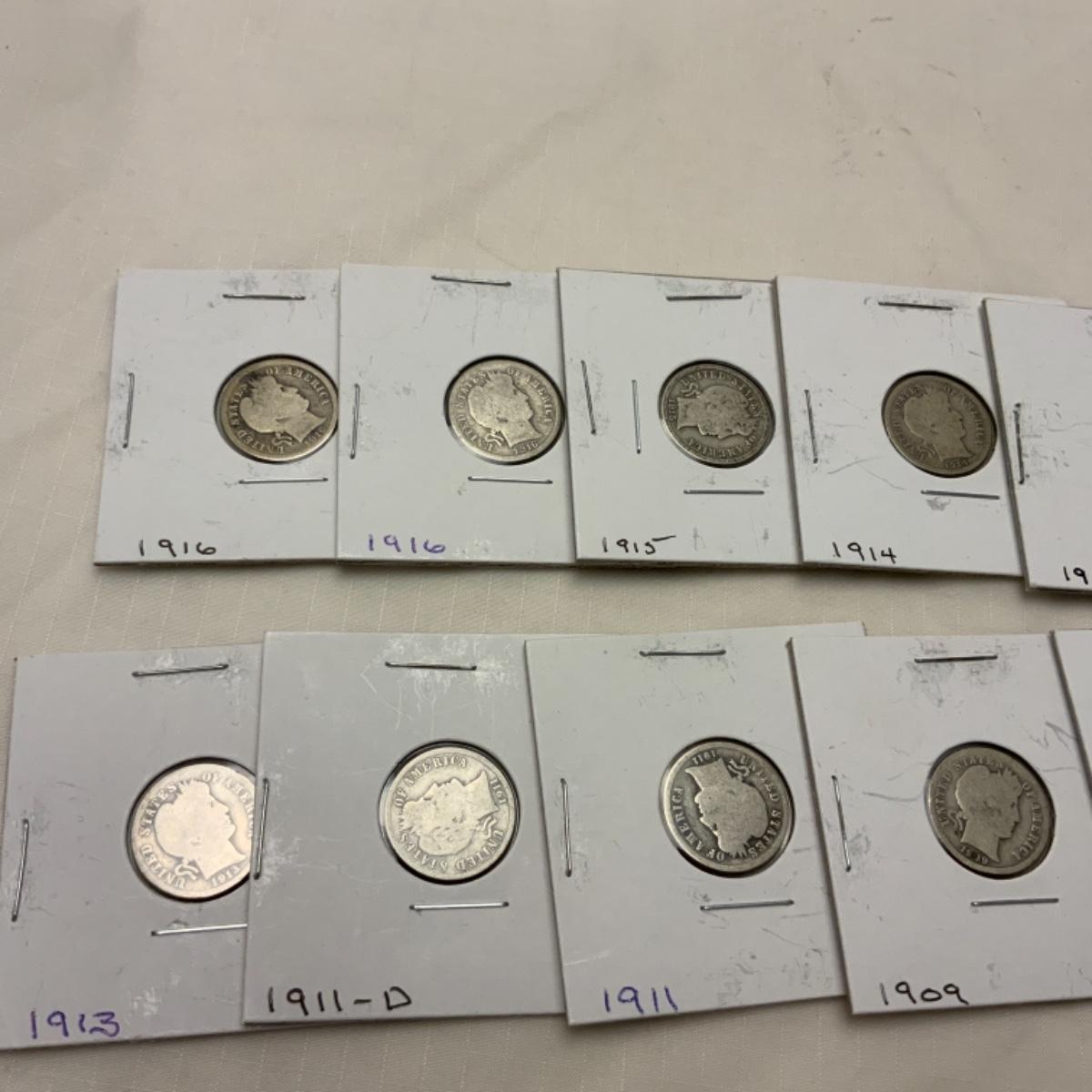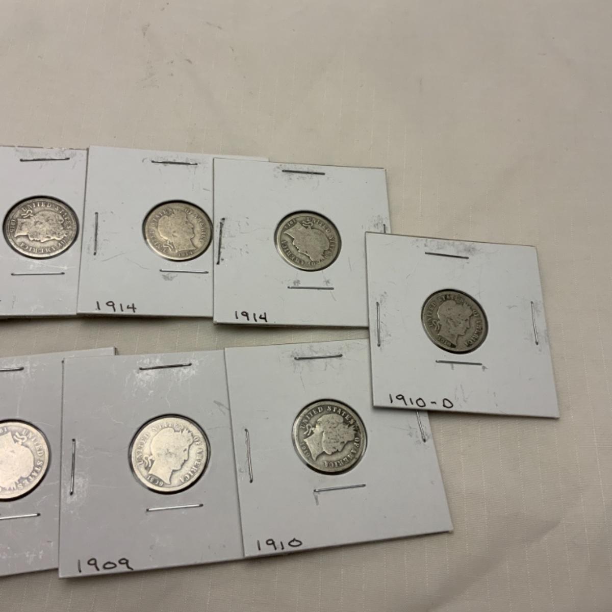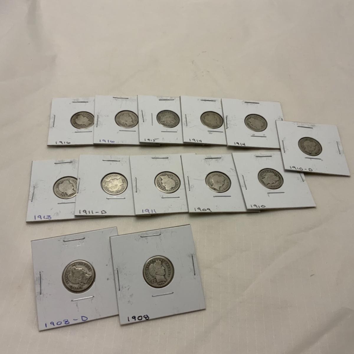 Thirteen Barber Dimes dated 1908-1916. Various Mint Marks, all 90% Silver. Some duplicate dates. Average circulated to better. Please see photos for details and condition. ::: Shipping is available on this lot. If you require shipping you must let us know at the close of the auction. We will coordinate with you after the item has been won. Shipping fees will include insurance up to or exceeding the value of all items being mailed. If you have any questions regarding this lot please contact the auctioneer either via this website, by direct email or by phone. PICK UP TIMES and other important information can be found in the TERMS and DESCRIPTION of the auction. Please take a look for pertinent information. Thanks!