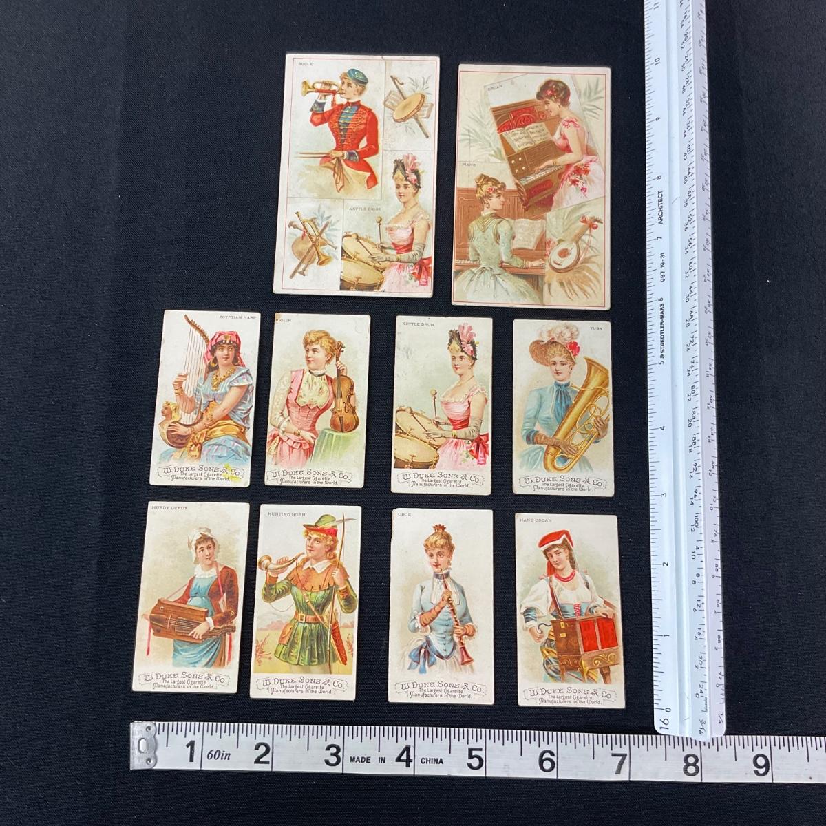 Ten assorted Dukes and Honest Long cut tobacco cards from the musical instrument series. These cards have some wear and damage but otherwise appear to be in great shape. Please see photos for details and condition. Any condition statement is given as a courtesy to a client, is an opinion, and should not be treated as a statement of fact. Reference to condition written, oral or within a condition report shall not be regarded as a full account of condition and may not include all defects, alterations, or restorations. Absence of a condition report does not imply a lot is flawless or lacking imperfections or damage. Katherine’s Auction & Appraisal Service shall have no responsibility for any error or omission. Returns shall not be accepted on the basis of condition. ::: Shipping is available on this lot. If you require shipping you must let us know at the close of the auction. We will coordinate with you after the item has been won. Shipping fees will include insurance up to or exceeding the value of all items being mailed. If you have any questions regarding this lot please contact the auctioneer either via this website, by direct email or by phone. PICK UP TIMES and other important information can be found in the TERMS and DESCRIPTION of the auction. Please take a look for pertinent information. Thanks!