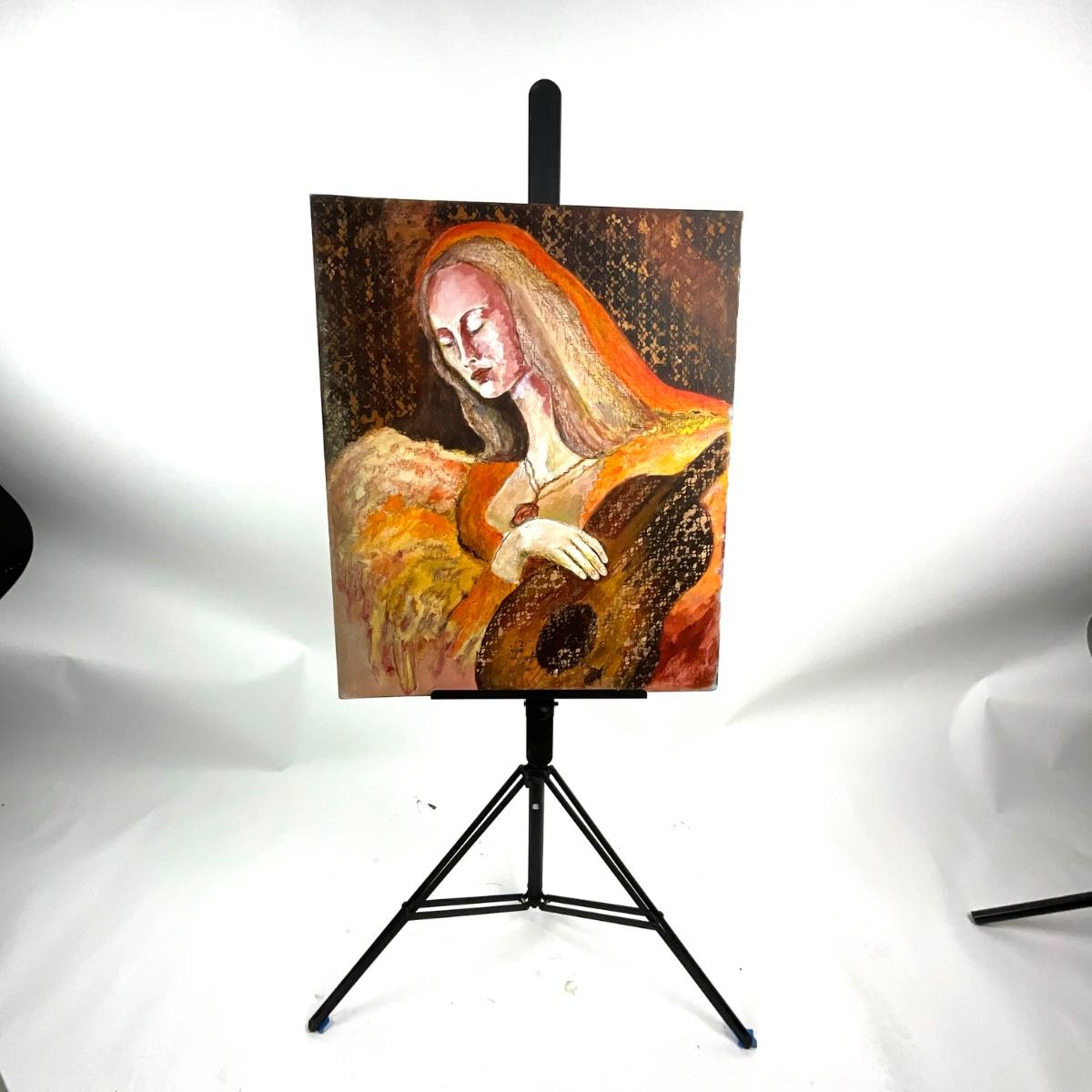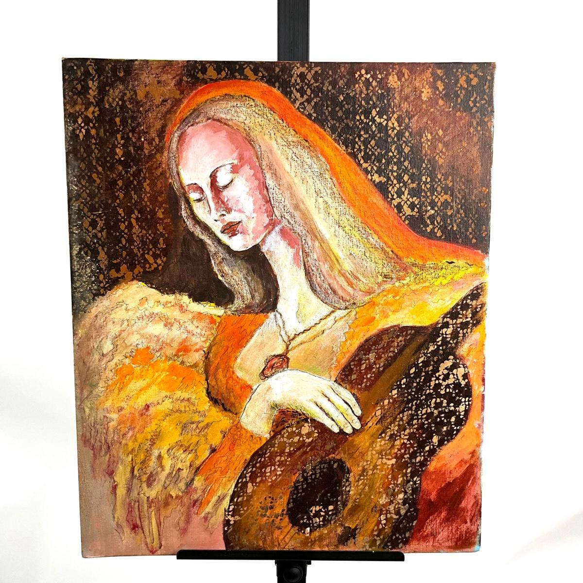 910 Vintage Original Oil on Board of Woman with Guitar