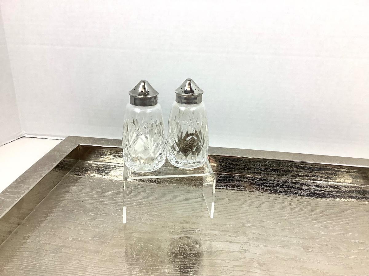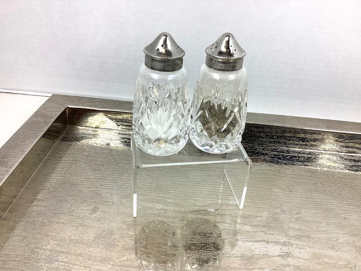 The crystal salt and pepper shakers are in the "Lismore" pattern by Waterford, they measure 3.75" x 1.5".