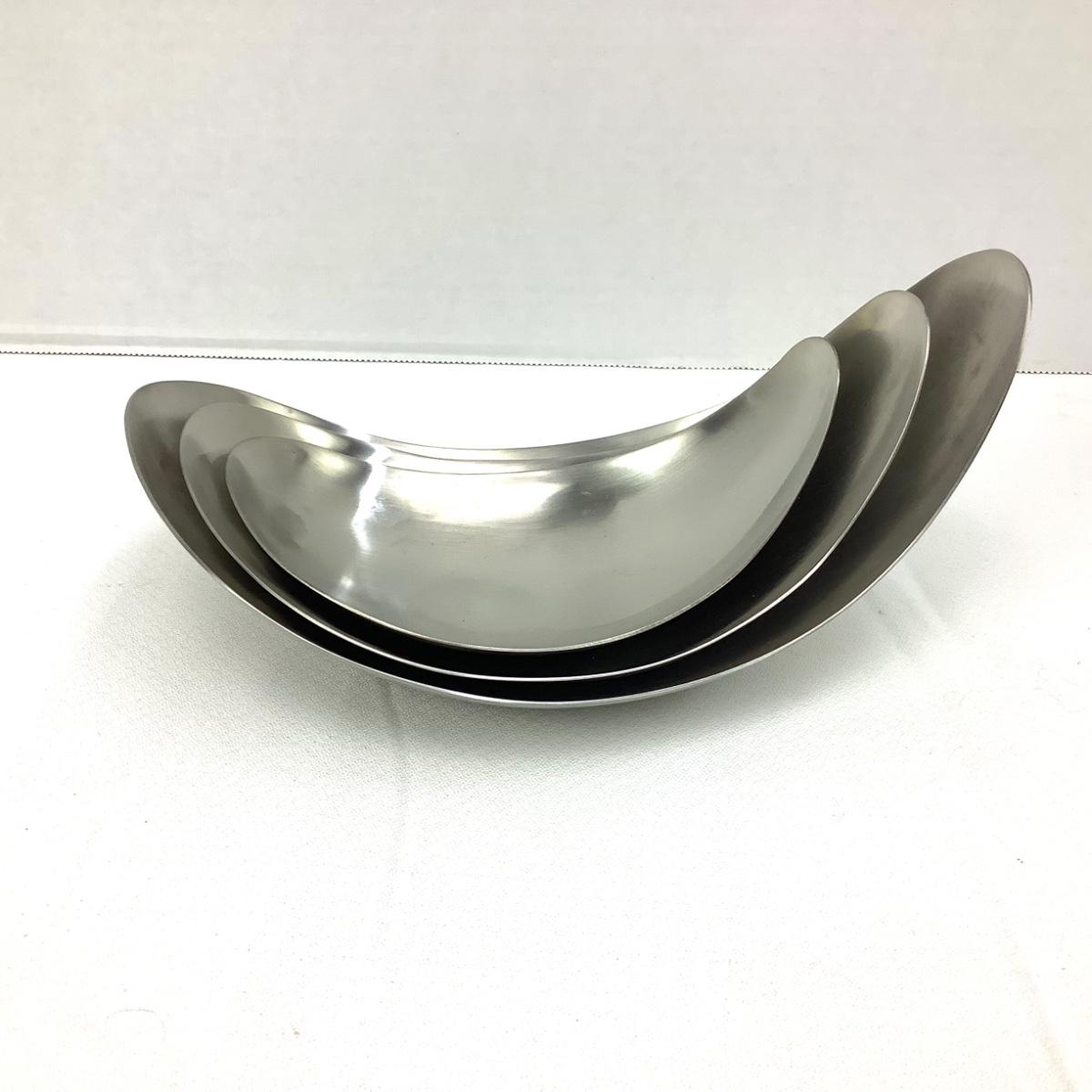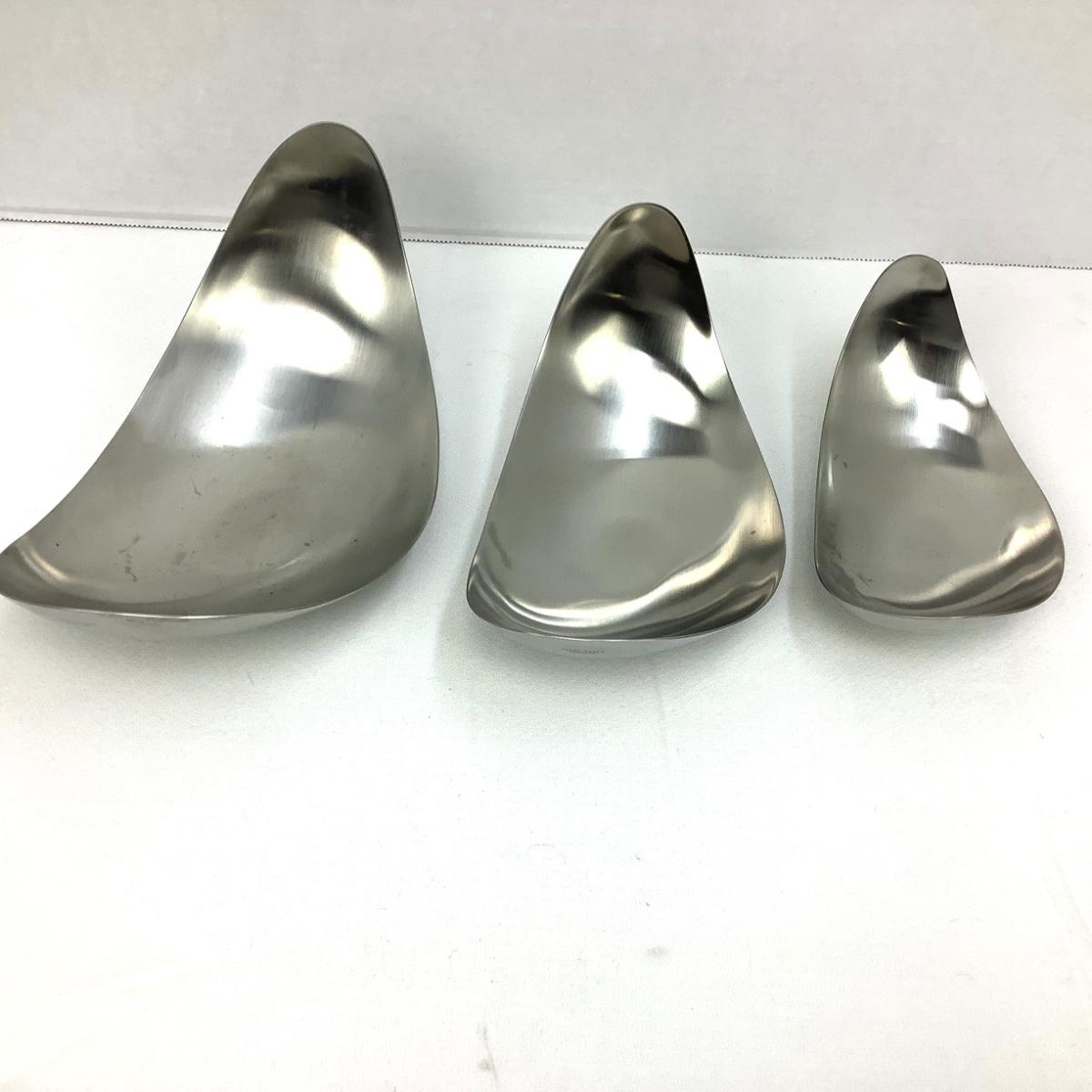 The lot contains a set of 3 stainless steel leaf bowls and they measure: