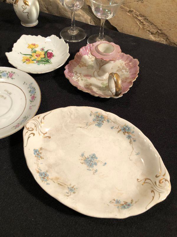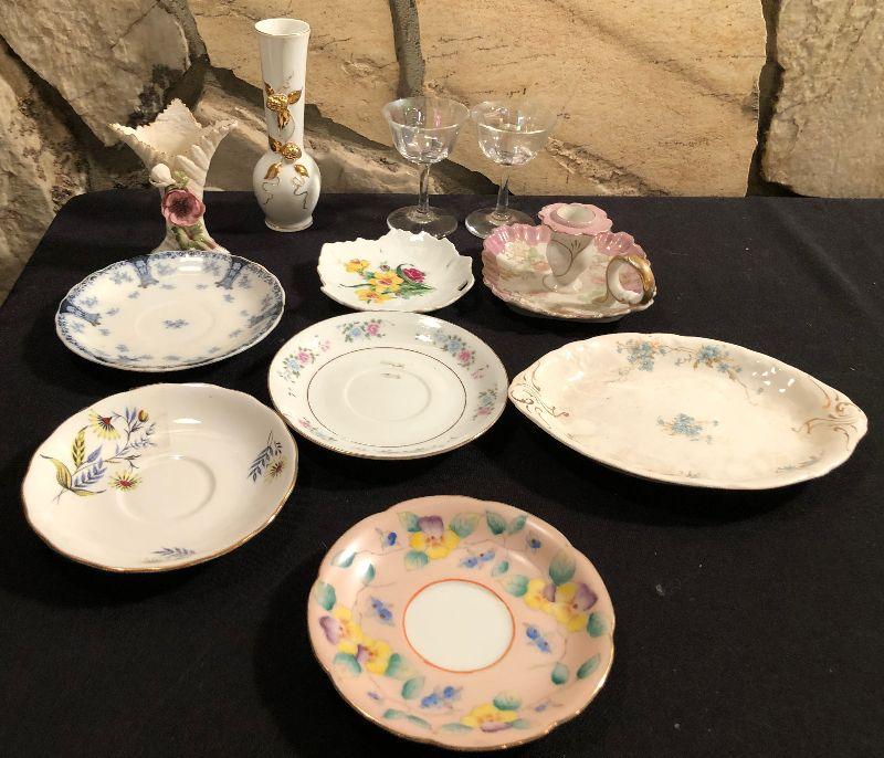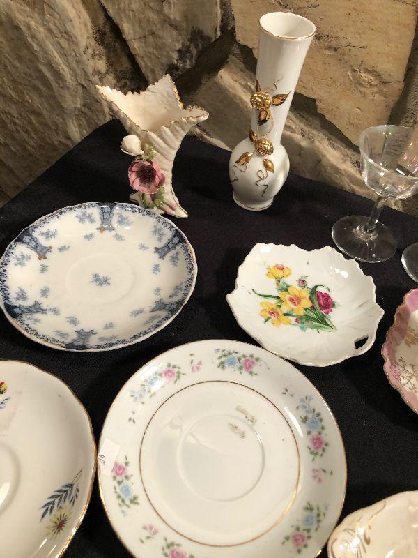 #917 Misc. Mixed Glass and Porcelain Saucers, vases, Glasses