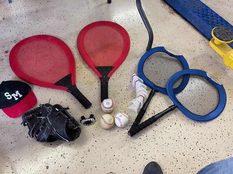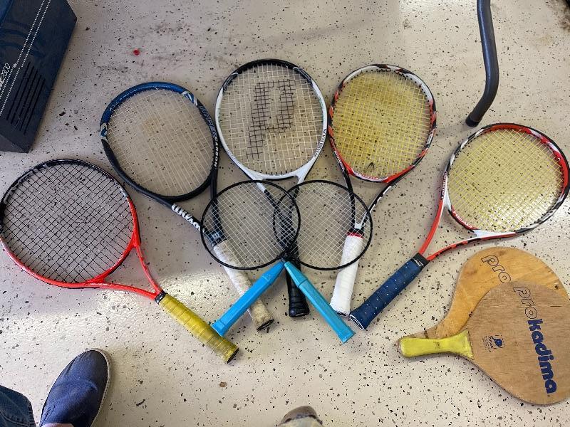 Tennis racket brands-Head, Prince, Wilson. Badminton birdies also included. Qty (3) baseball and leather glove, mouth piece see pics