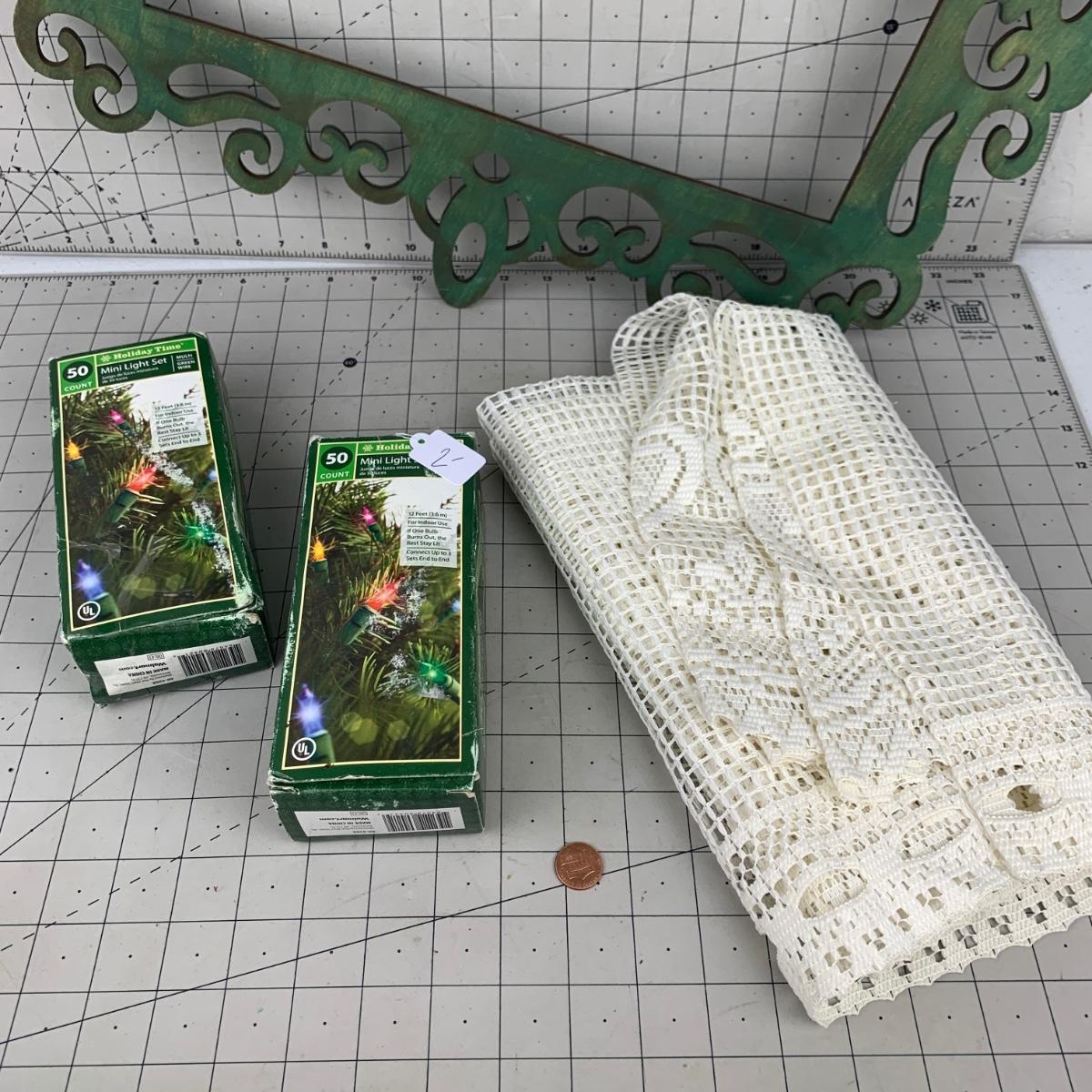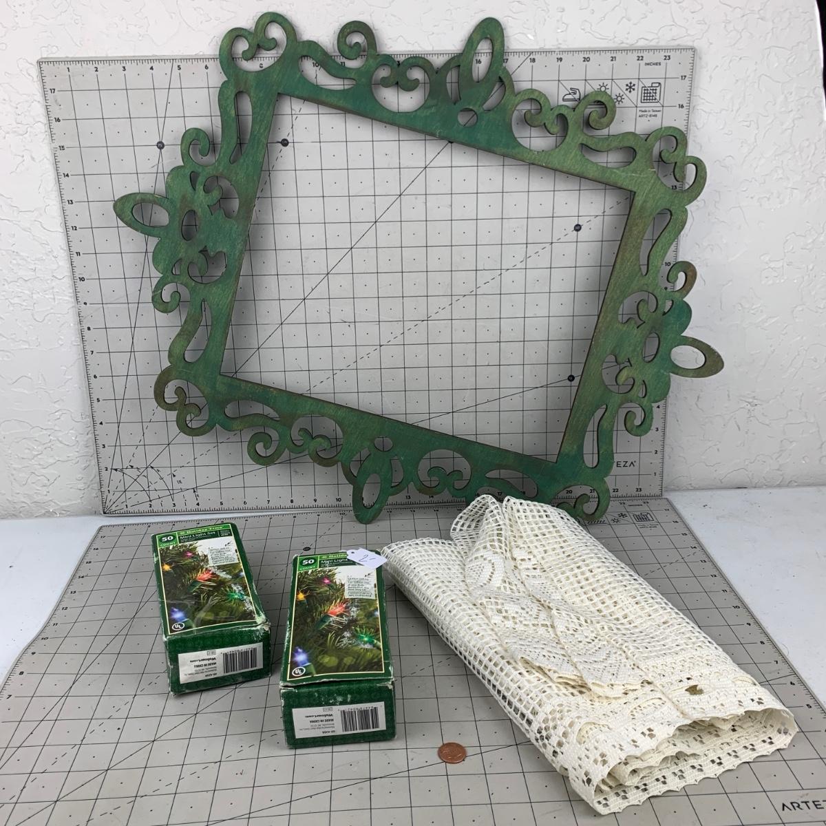 #92 Mini Christmas Lights, Green Frame & Vintage Table Runner
