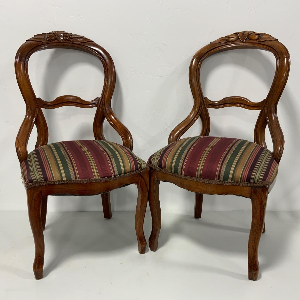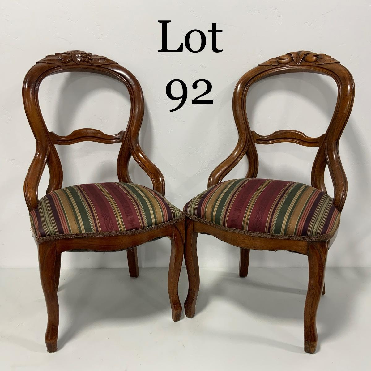 Attractive pair of Walnut Carved Side Chairs, circa 1860. Stunning workmanship. Chairs measure 36” tall, and the seat measures 19” x 18”. Please see photos for details and condition. ::: Shipping is NOT available on this lot. If you have any questions regarding this lot please contact the auctioneer either via this website, by direct email or by phone. PICK UP TIMES and other important information can be found in the TERMS and DESCRIPTION of the auction. Please take a look for pertinent information. Thanks!