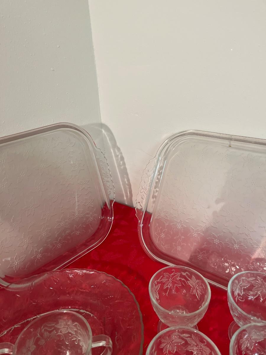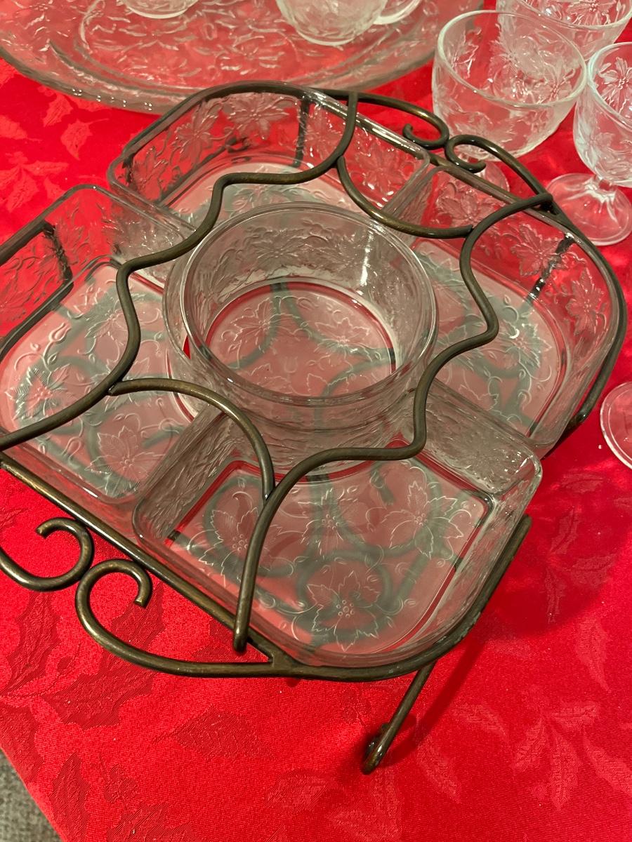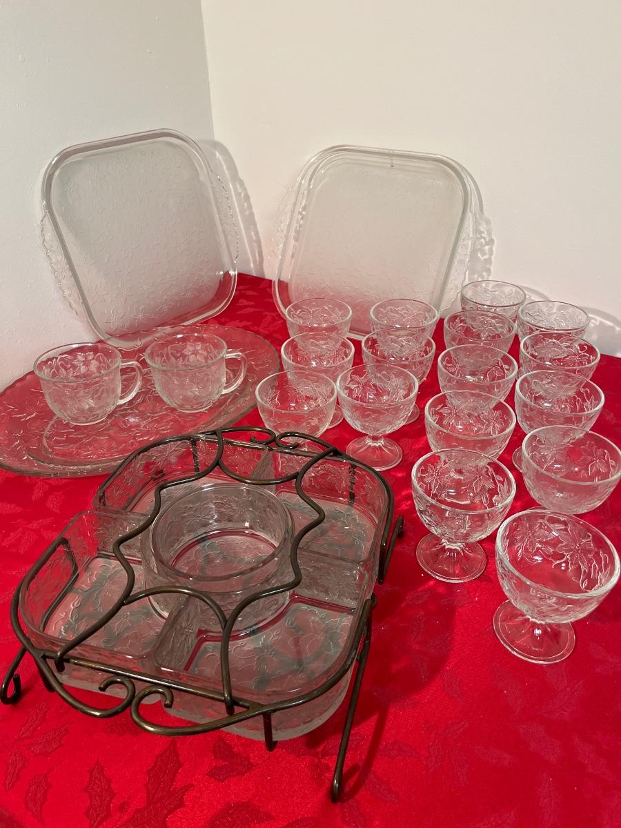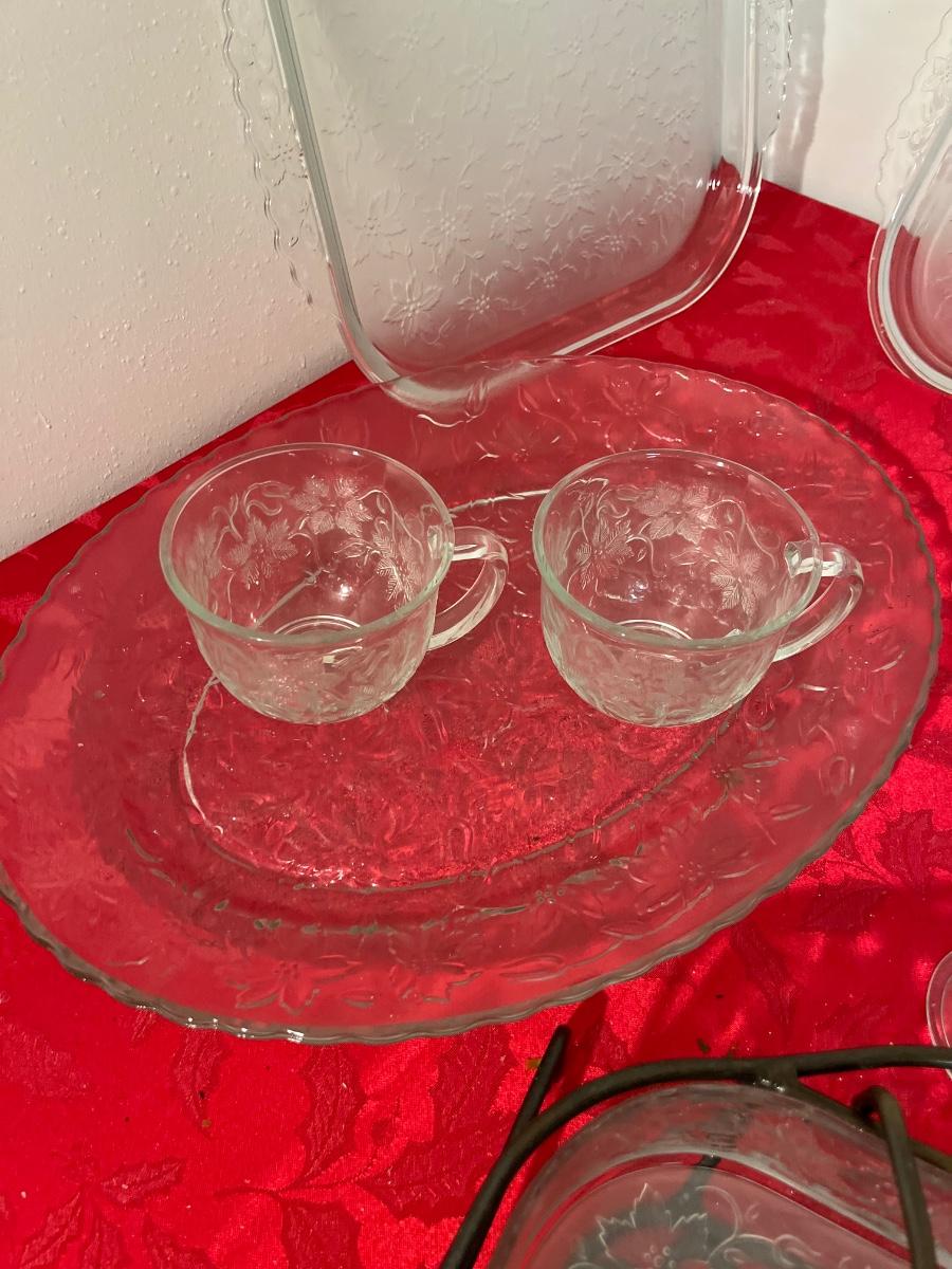 Over platter, 2 square trays, divided dish w/rack, 12 dessert cups, 2 mugs