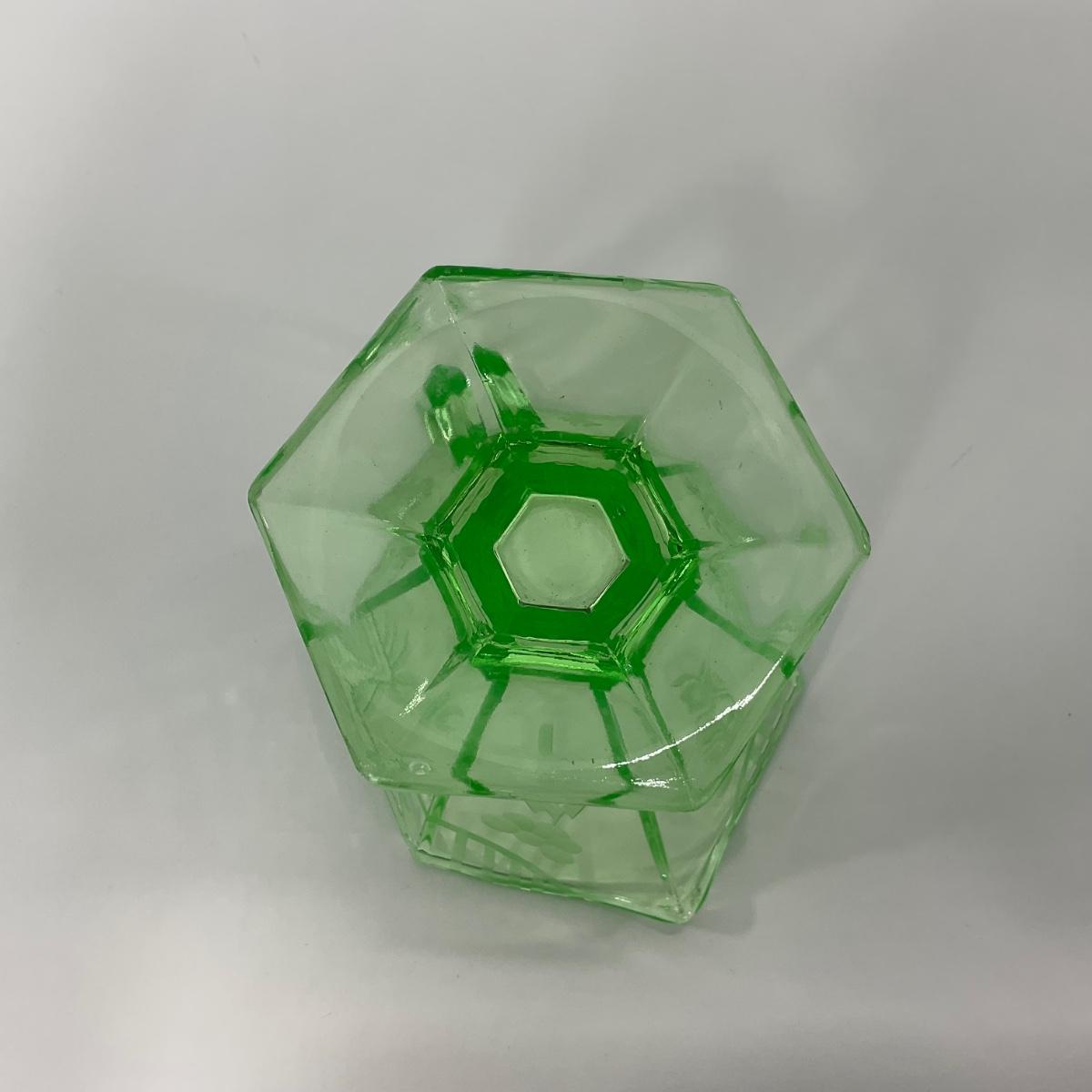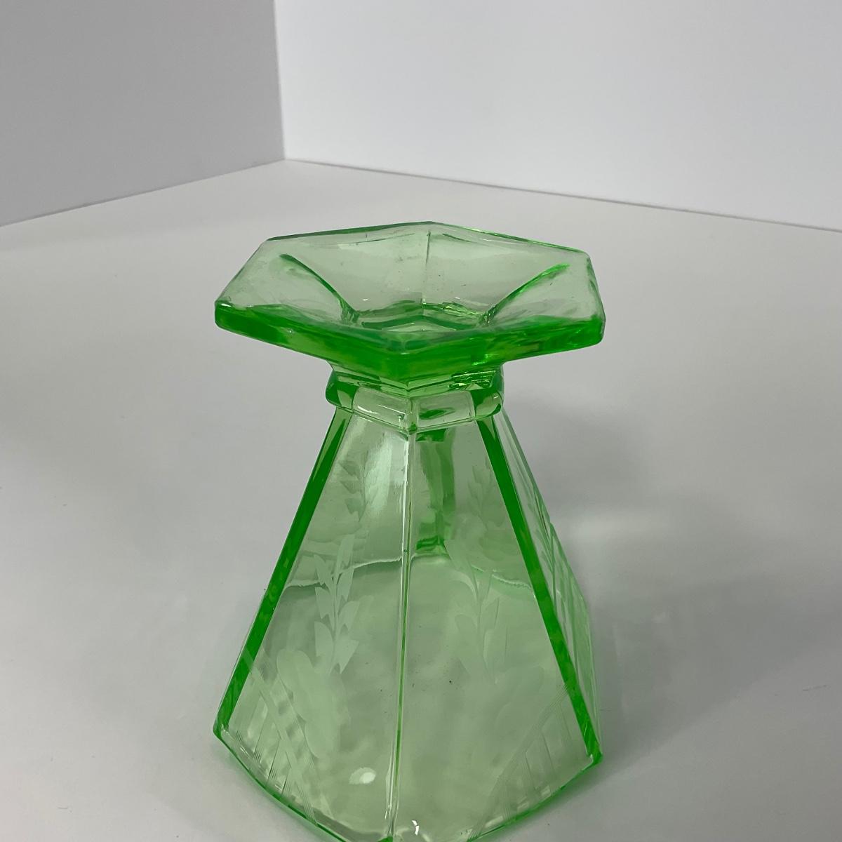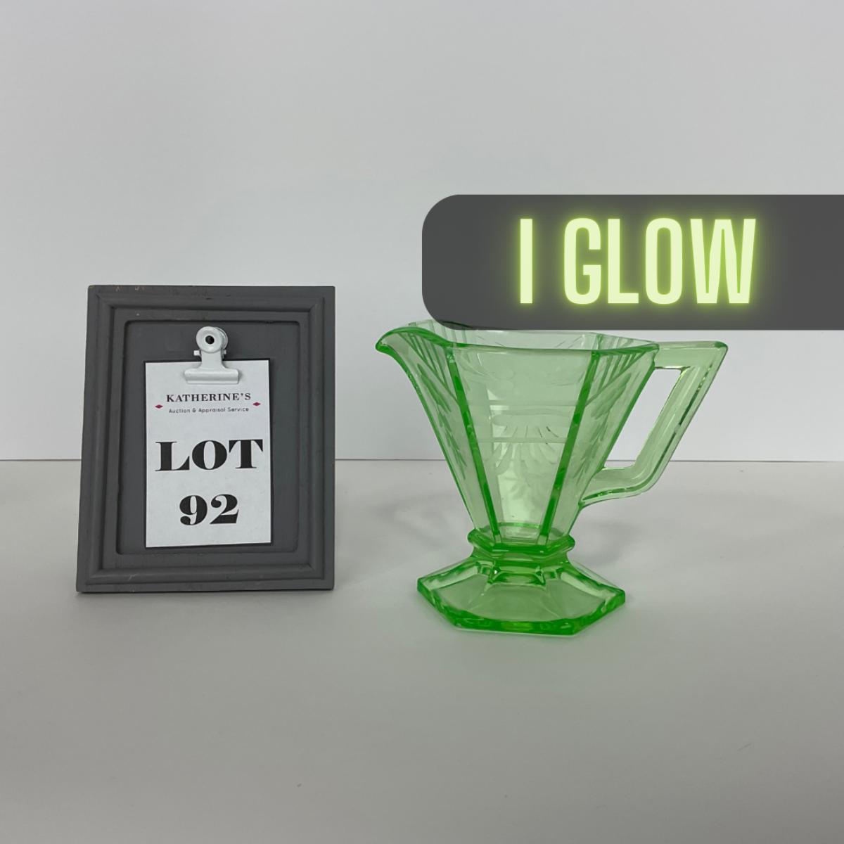 One etched green depression glass creamer, does have some chips and imperfections. I am Uranium glass so I DO GLOW under blacklight. Please see photos for details and condition. ::: Shipping is available on this lot. If you require shipping you must let us know at the close of the auction. We will coordinate with you after the item has been won. Shipping fees will include insurance up to or exceeding the value of all items being mailed. If you have any questions regarding this lot please contact the auctioneer either via this website, by direct email or by phone. PICK UP TIMES and other important information can be found in the TERMS and DESCRIPTION of the auction. Please take a look for pertinent information. Thanks!