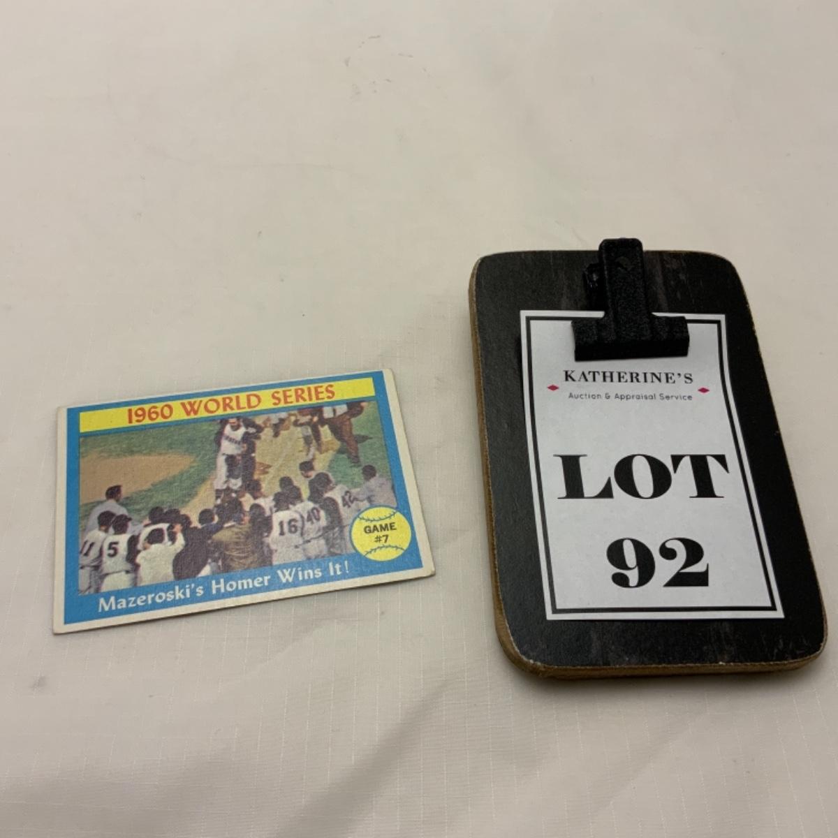 An awesome moment in Sports History when Bill Mazeroski had a Walk Off Home run in the 7th game of the series to beat the New York Yankees. You can feel the excitement in the photograph captured on the front of the card. Card is in great condition and comes from the original owner. Please see photos for details and condition. ::: Shipping is available on this lot. If you require shipping you must let us know at the close of the auction. We will coordinate with you after the item has been won. Shipping fees will include insurance up to or exceeding the value of all items being mailed. If you have any questions regarding this lot please contact the auctioneer either via this website, by direct email or by phone. PICK UP TIMES and other important information can be found in the TERMS and DESCRIPTION of the auction. Please take a look for pertinent information. Thanks!