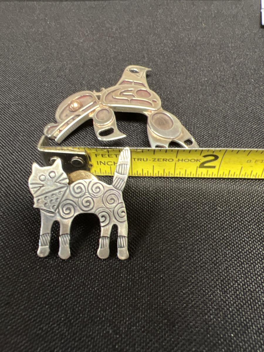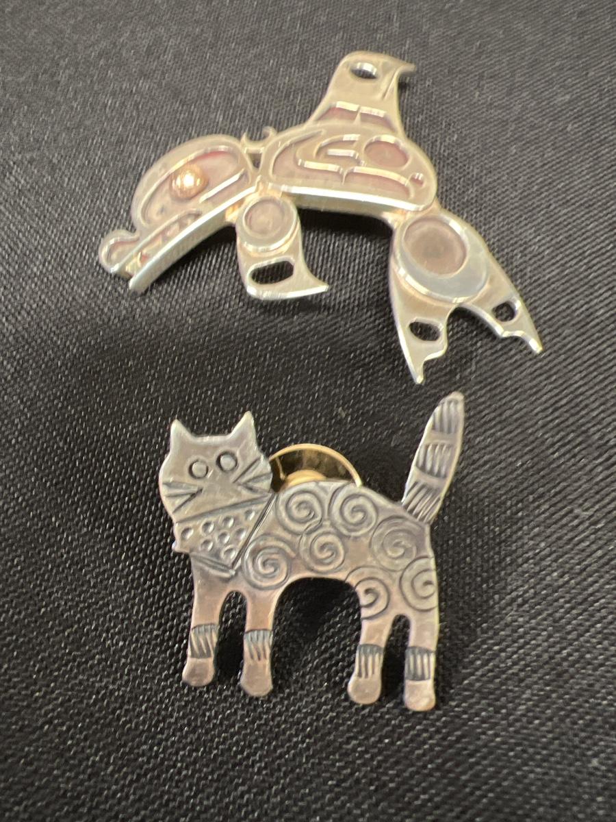 Lot includes a cat pin marked 925, cat earrings also marked 925, gold colored mouse pin, ceramic cat pin, two metal cat buttons and a silver colored dolphin-shaped pendant. All sales are final. No returns or refunds. Please bid accordingly.