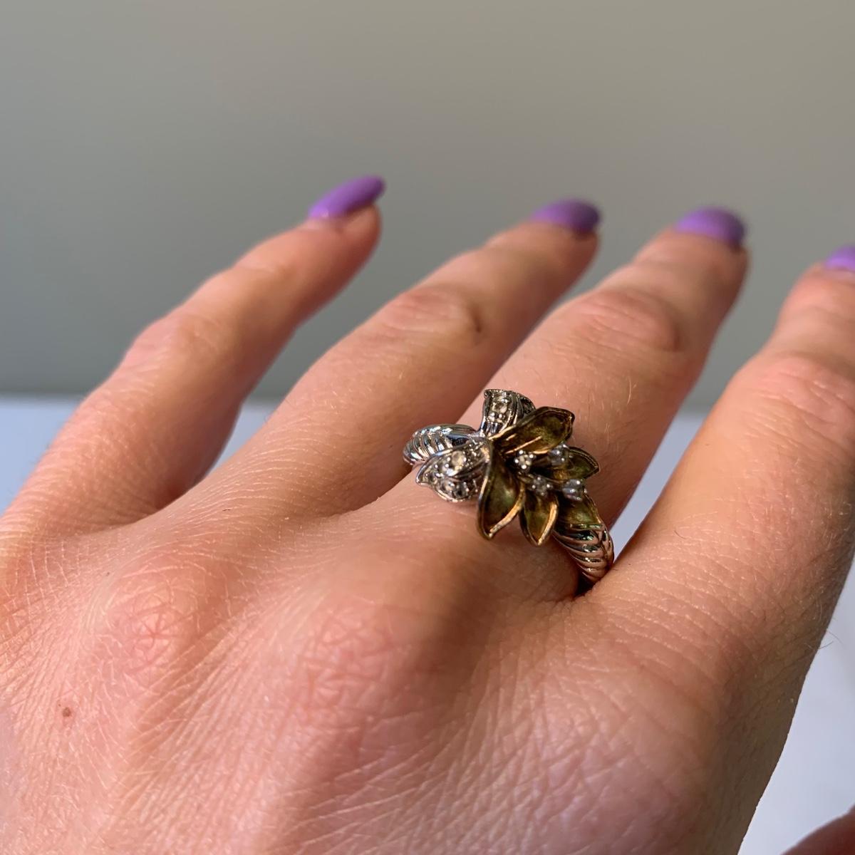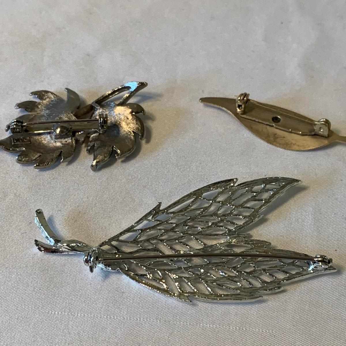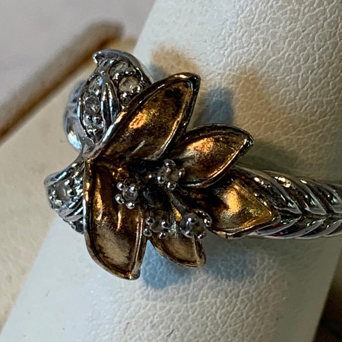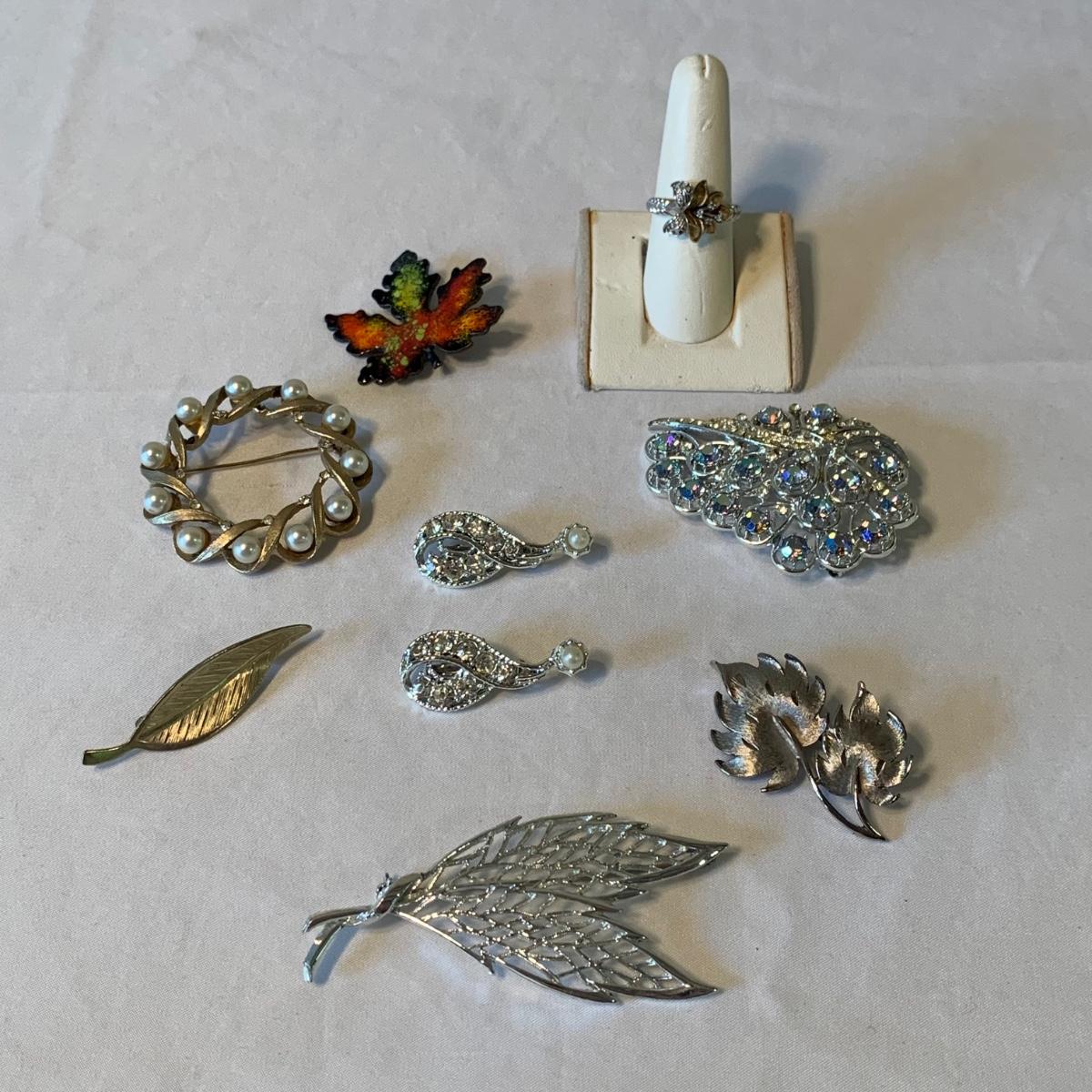 This lot features a beautiful and unique floral ring and eight fashion pins. The ring is marked 925. It appears to be size 8.