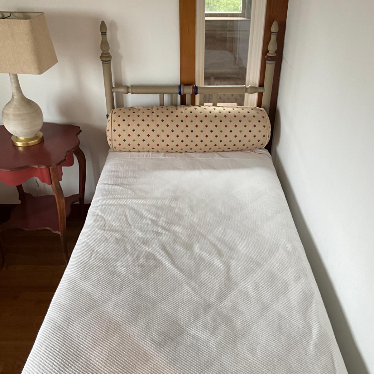925 Pair of Vintage Hand-Painted Brass Twin Beds With Matching Bolster Pillows & Boxspring Covers