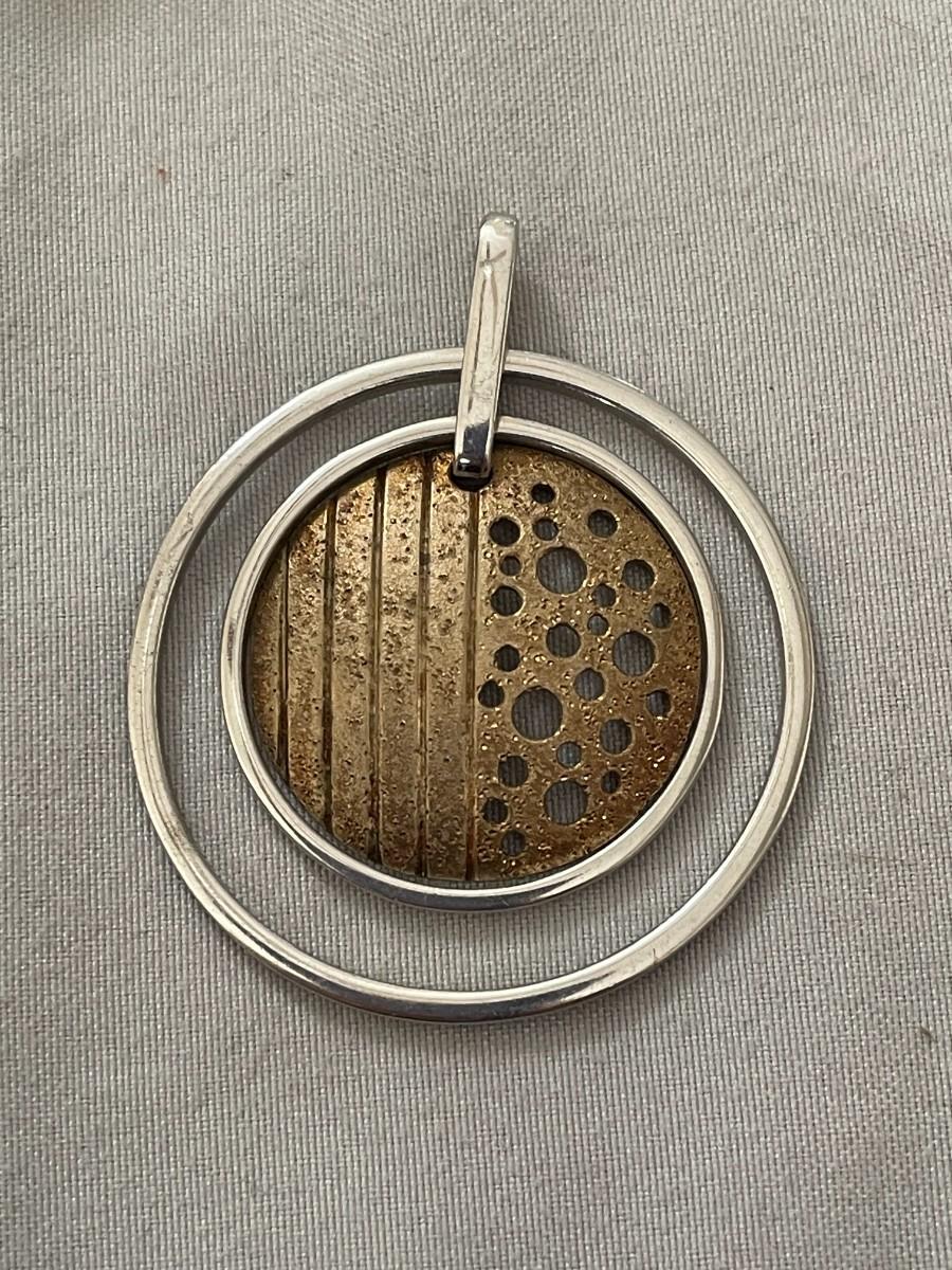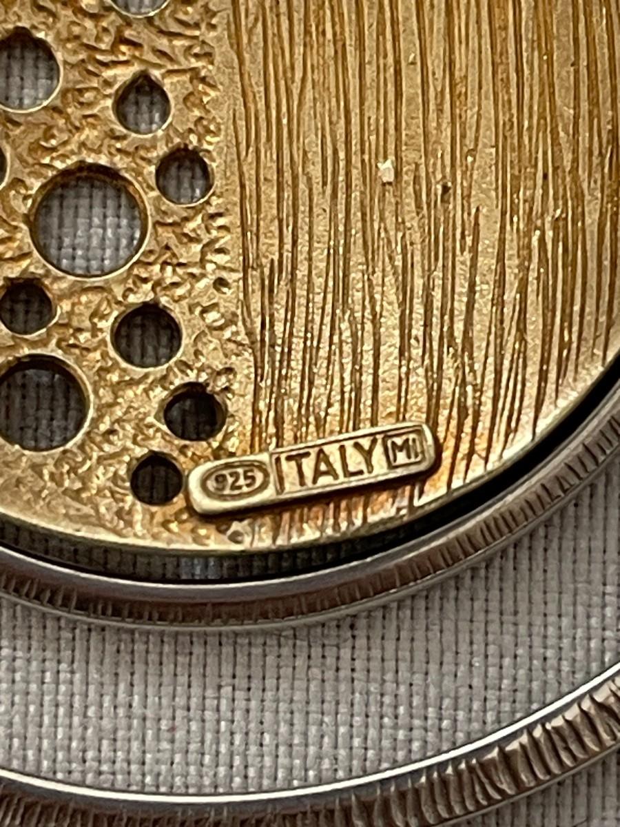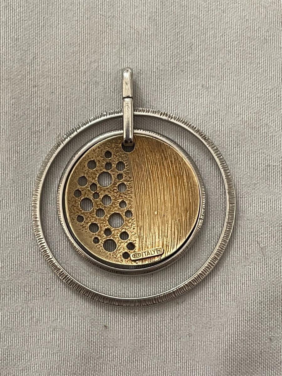 This pendant is marked on the gold center 925 Italy and the outside diameter is 1.5 inches.