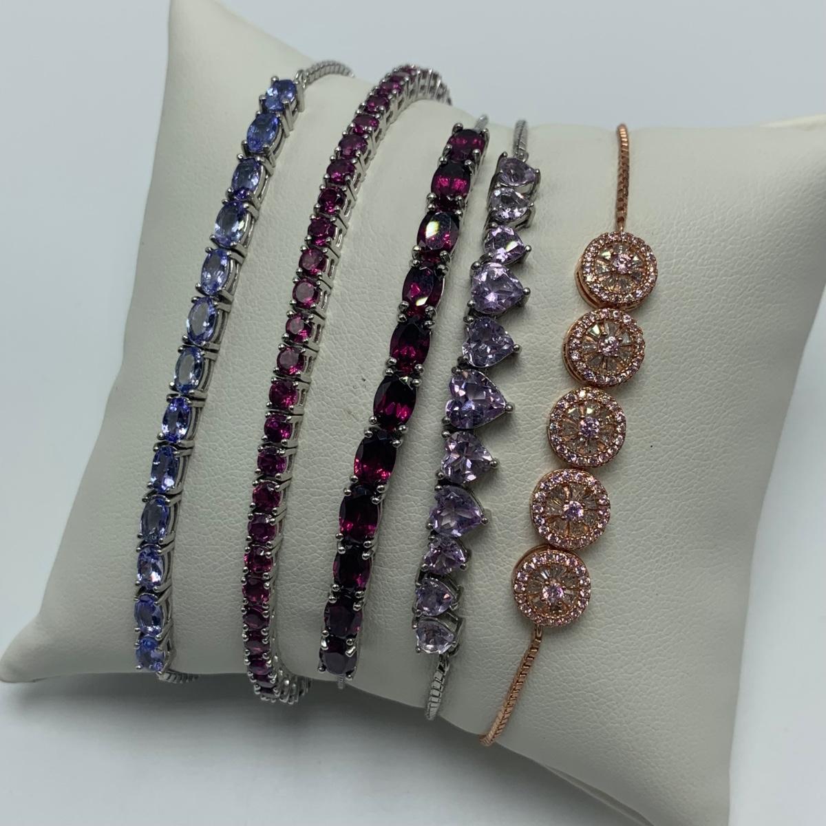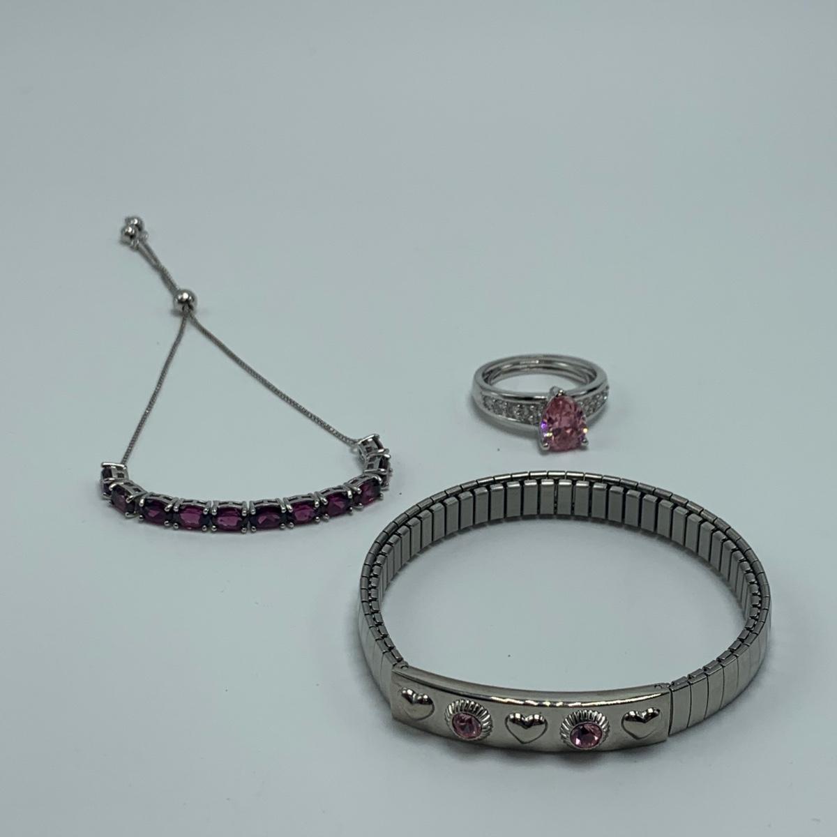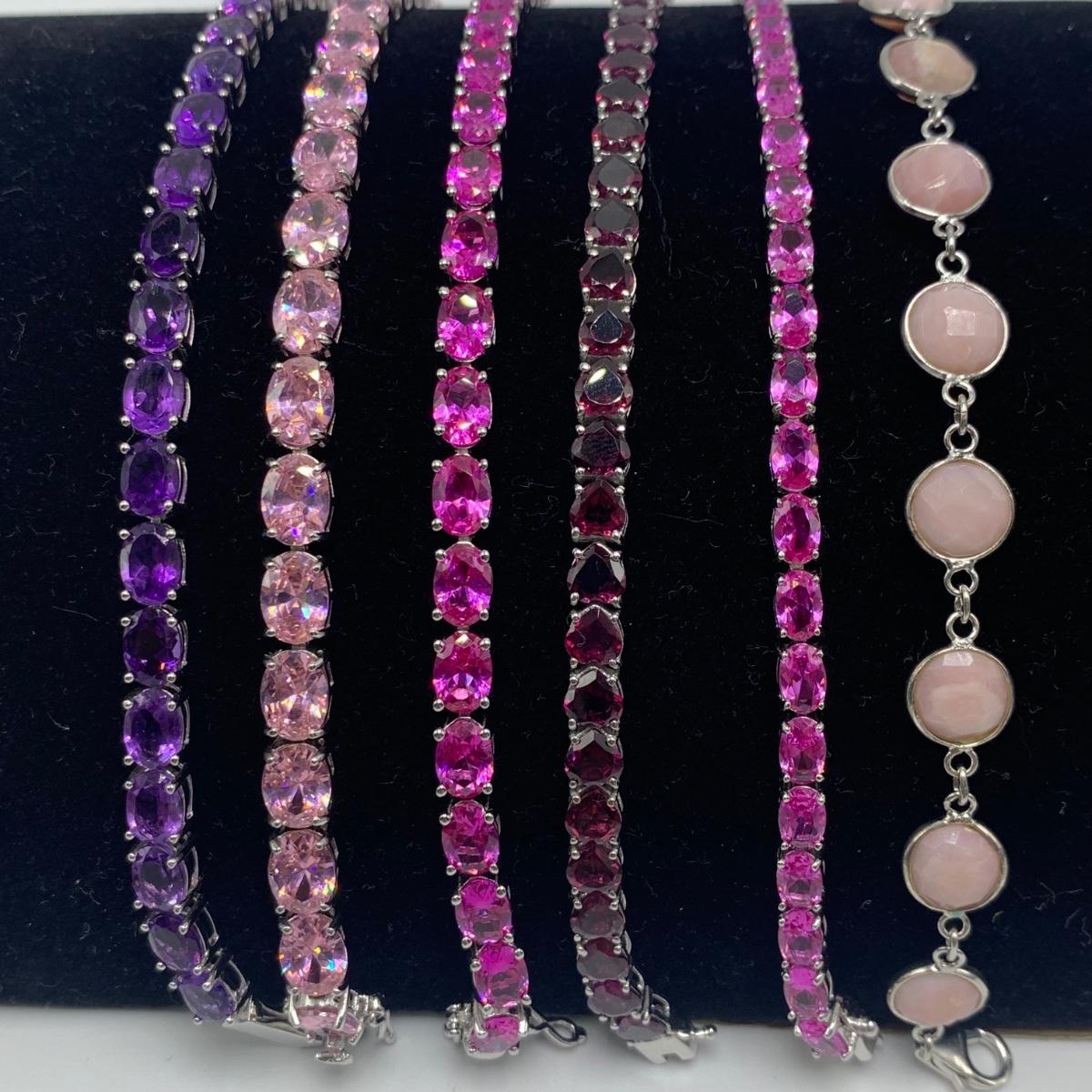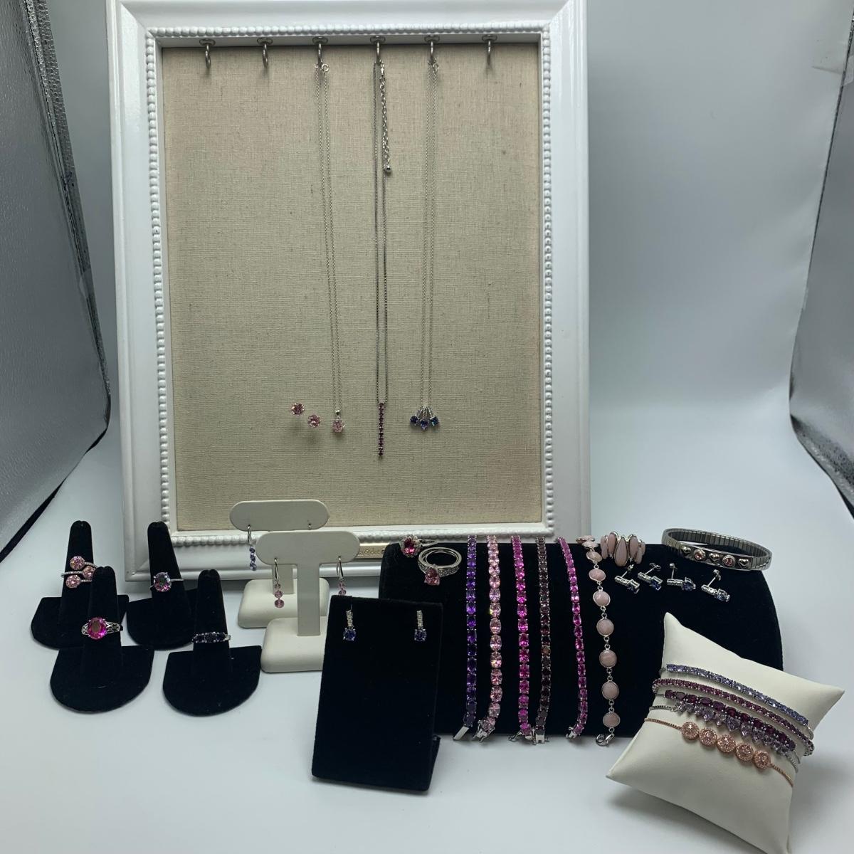 A collection of rings, bracelets, necklaces, and earrings with pink and purple colored gemstones set in Sterling Silver. There are six fixed length bracelets, five adjustable bracelets, and an elasticized bracelet, as well as seven rings, three necklaces with pendants, and six pairs of earrings for pierced ears. The necklace with the light pink pendant matches one of the pairs of stud earrings. One necklace has three pendants that match three of the earrings; it is designed to switch out the pendant you want to wear. The necklace chains are 18” and one is adjustable to be longer. One ring is size adjustable. Almost all items are stamped “˜925’. Three are not (two bracelets and one ring) and these items are shown in the last photograph. See all images for examples of known markings/brands.