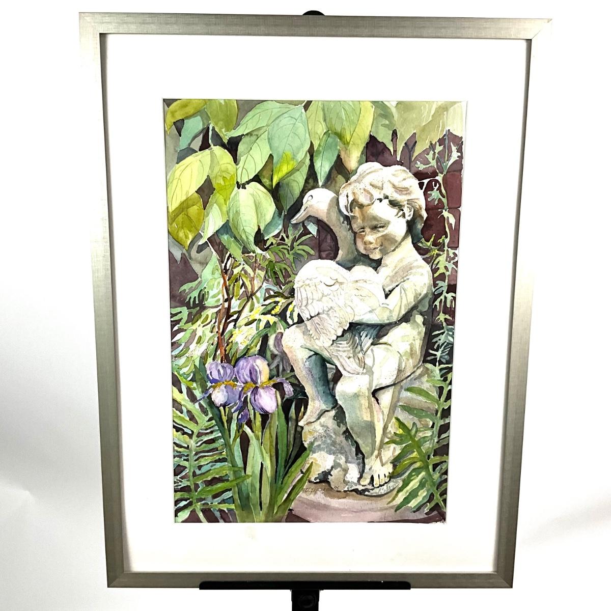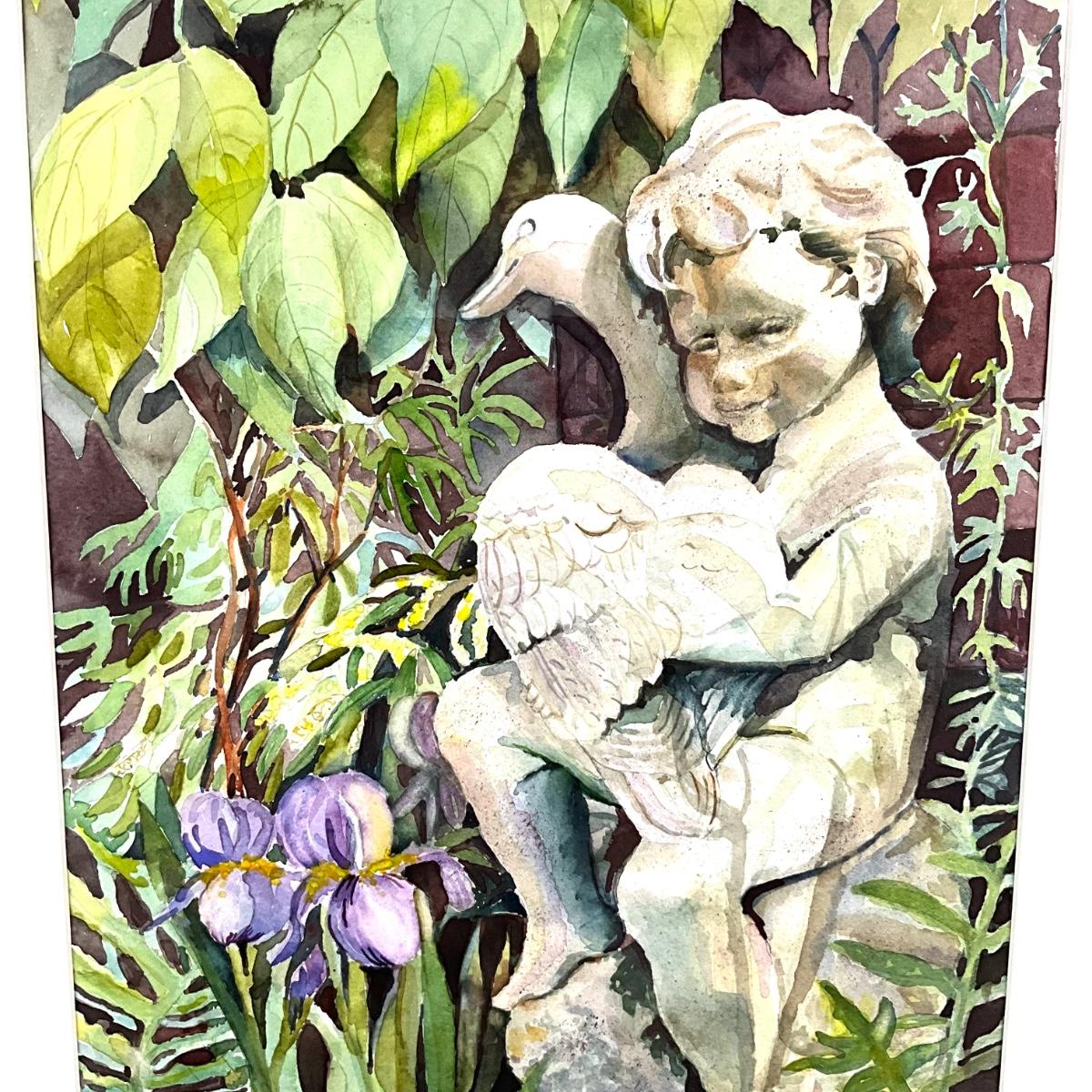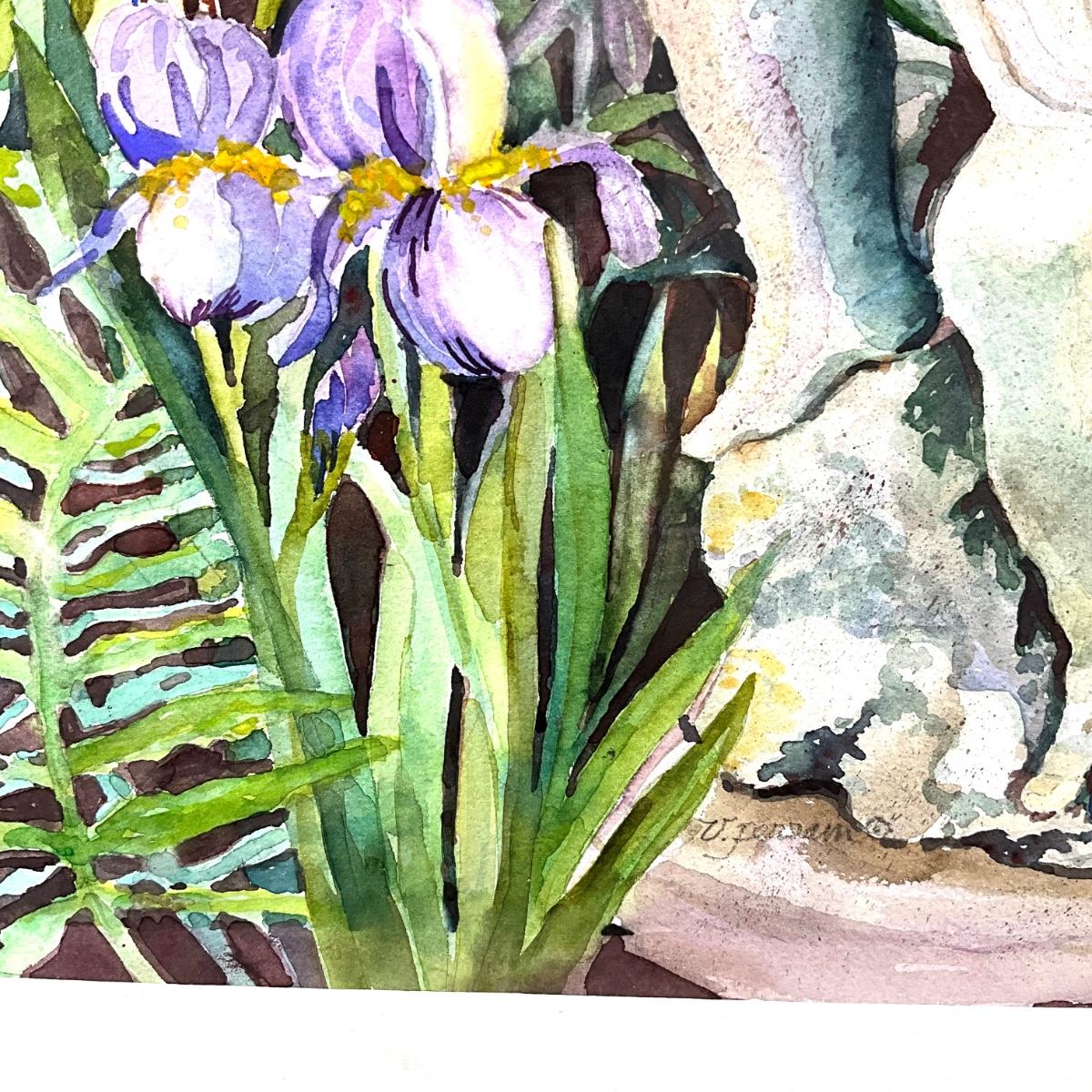 925 Original Garden Statue with Iris Watercolor by Virginia Perram