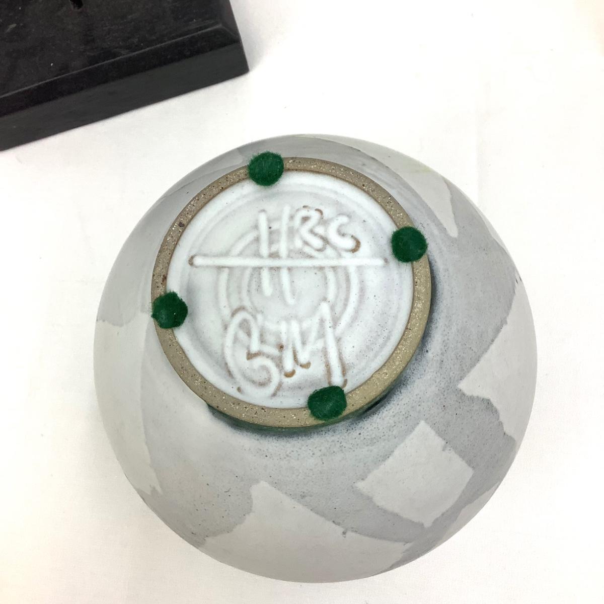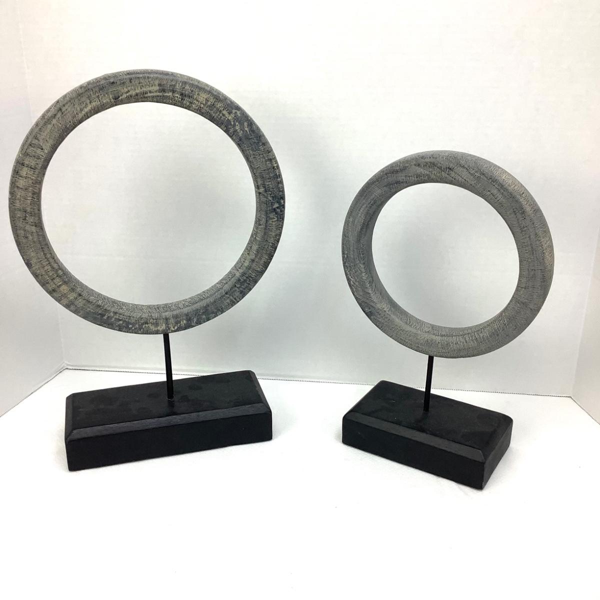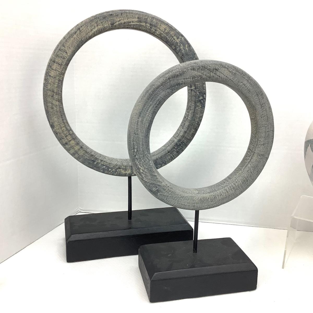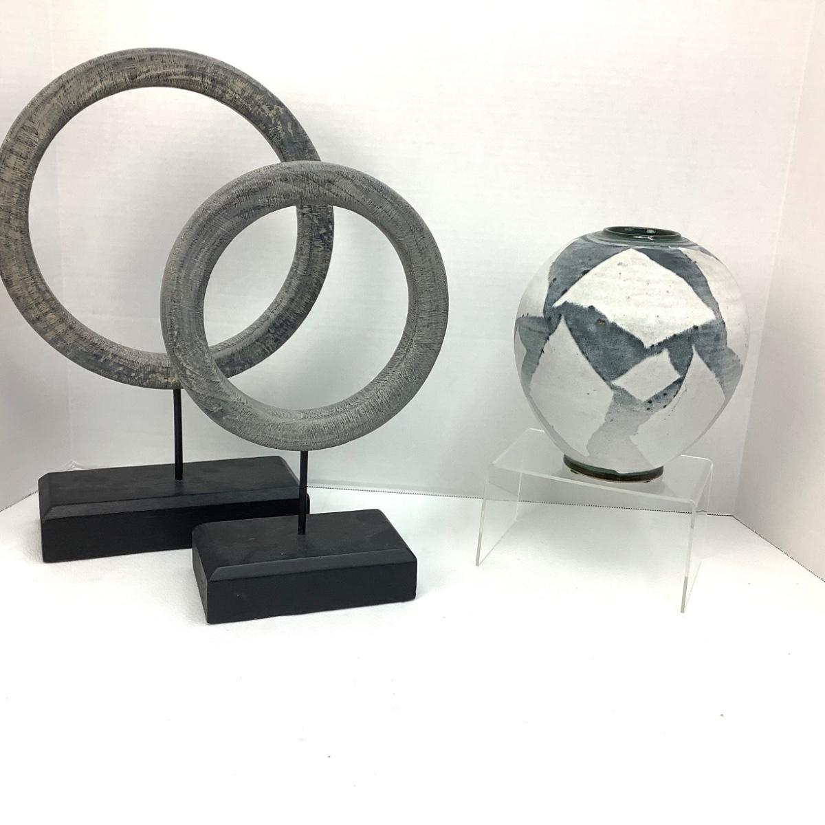 The pottery urn style vase is 7" tall and 7" at its widest-signed by artist on the bottom. The wooden grey circle decor are 15" x 9.5" and 12" x 7.5".