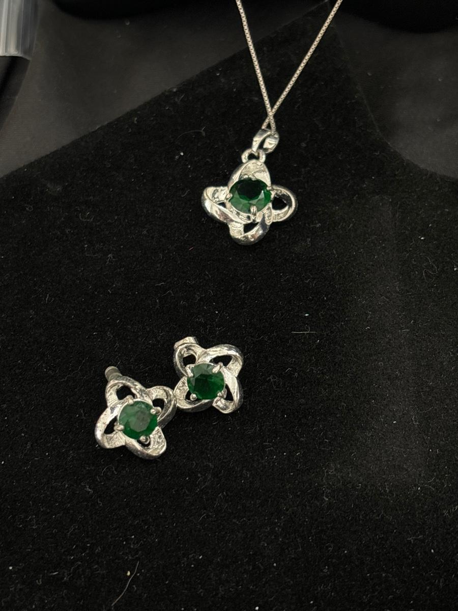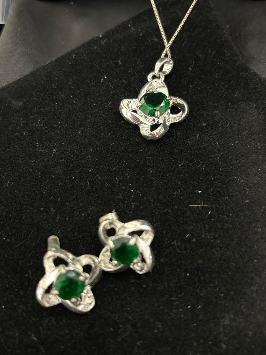 925 silver earrings and necklace with green middle gem