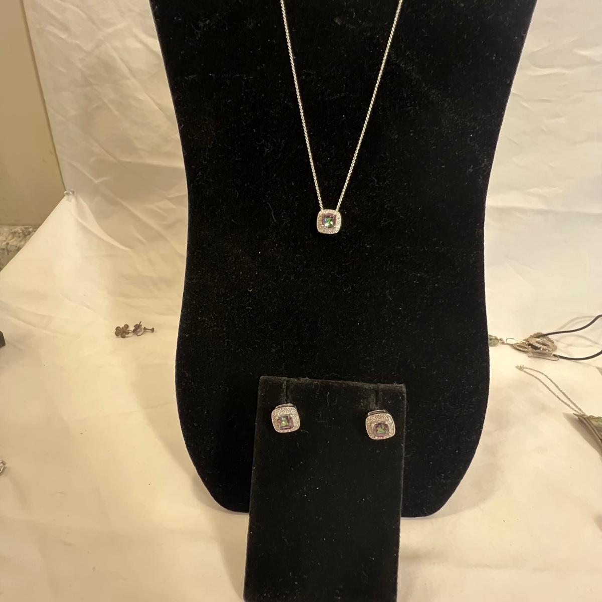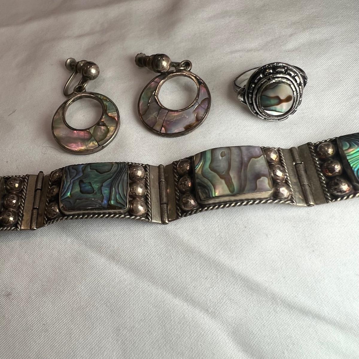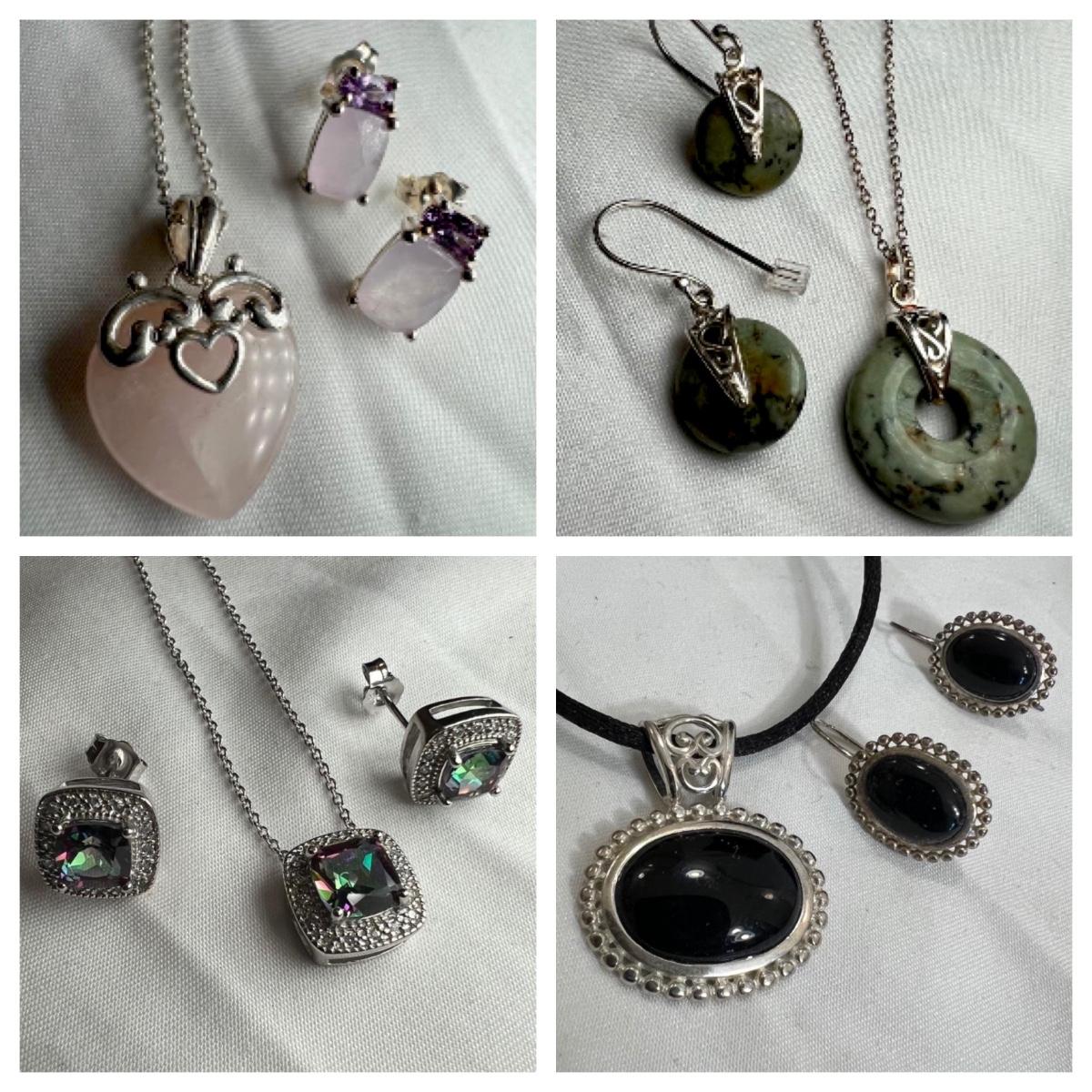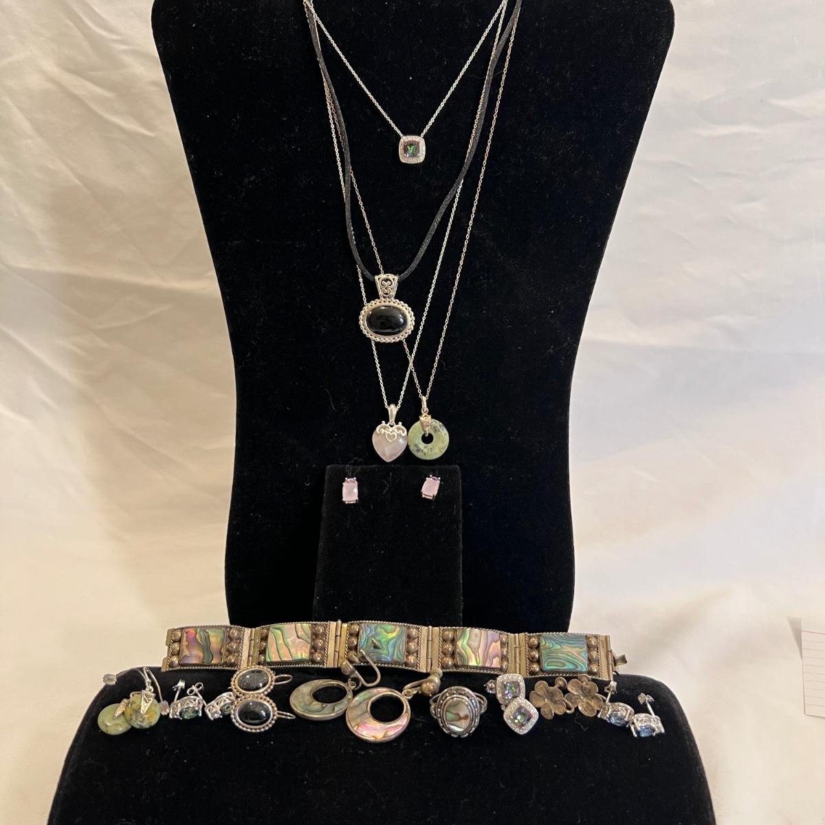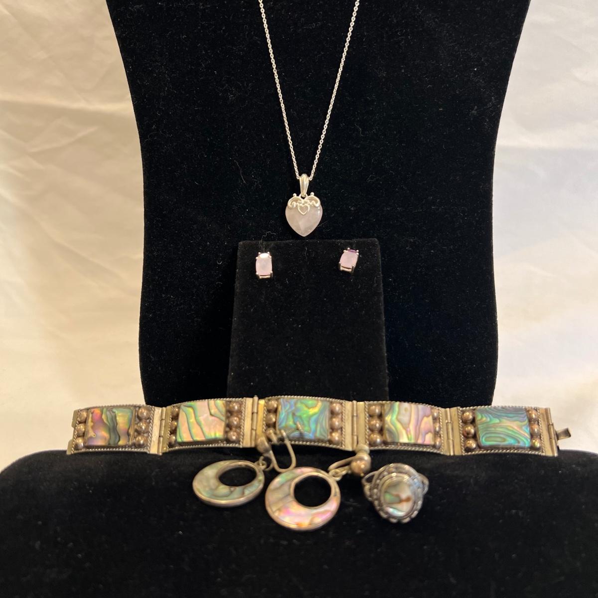 Four sets of necklaces with matching post earrings, plus an abalone bracelet with matching earrings (note that the ring is not an exact match but close). The abalone ring is the only item in this entire lot that is not stamped 925/sterling. Three extra pairs of earrings are also included. Of the nine pairs of earrings, all but the flower shaped earrings are for pierced ears. See images for marks and sizes.