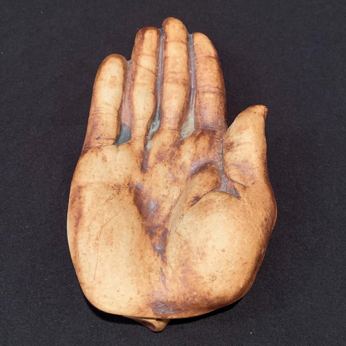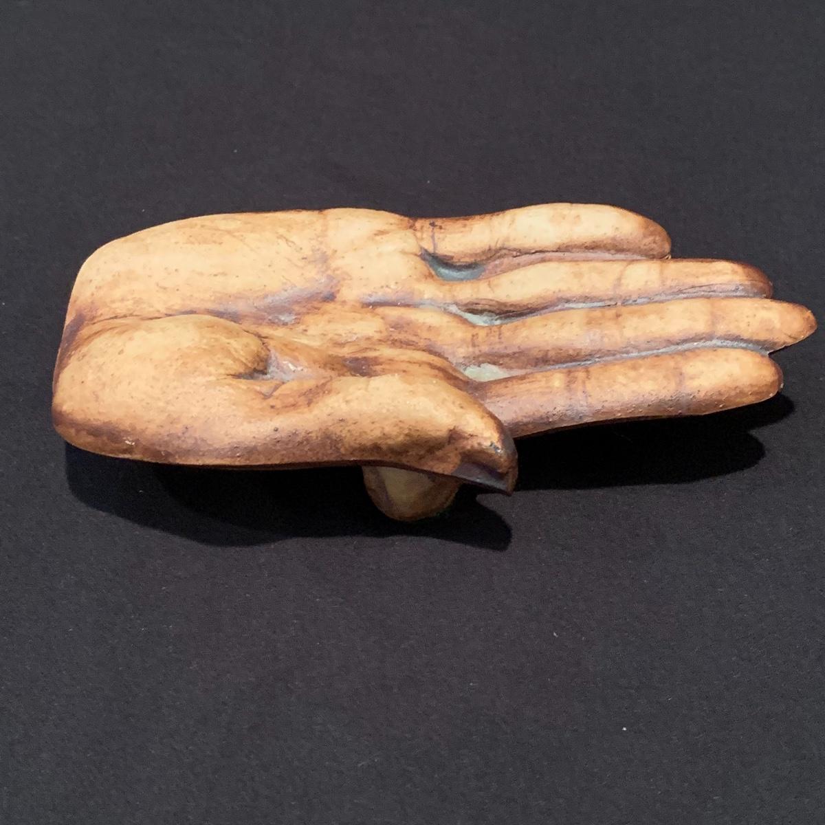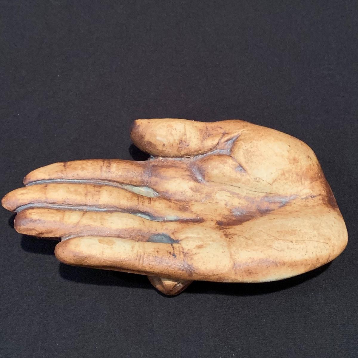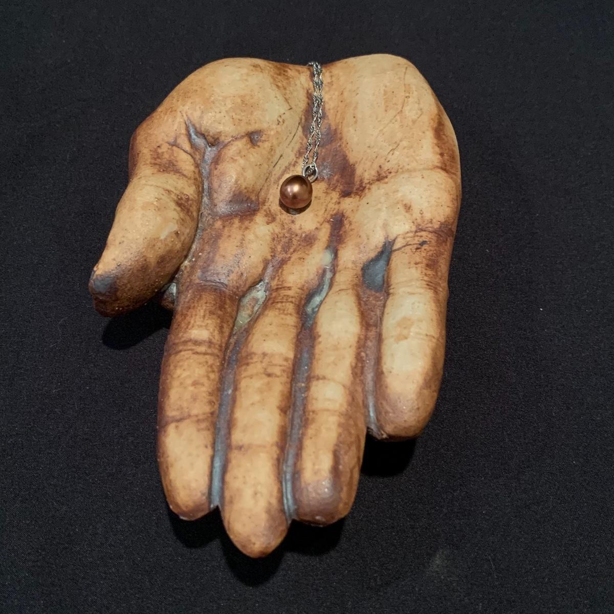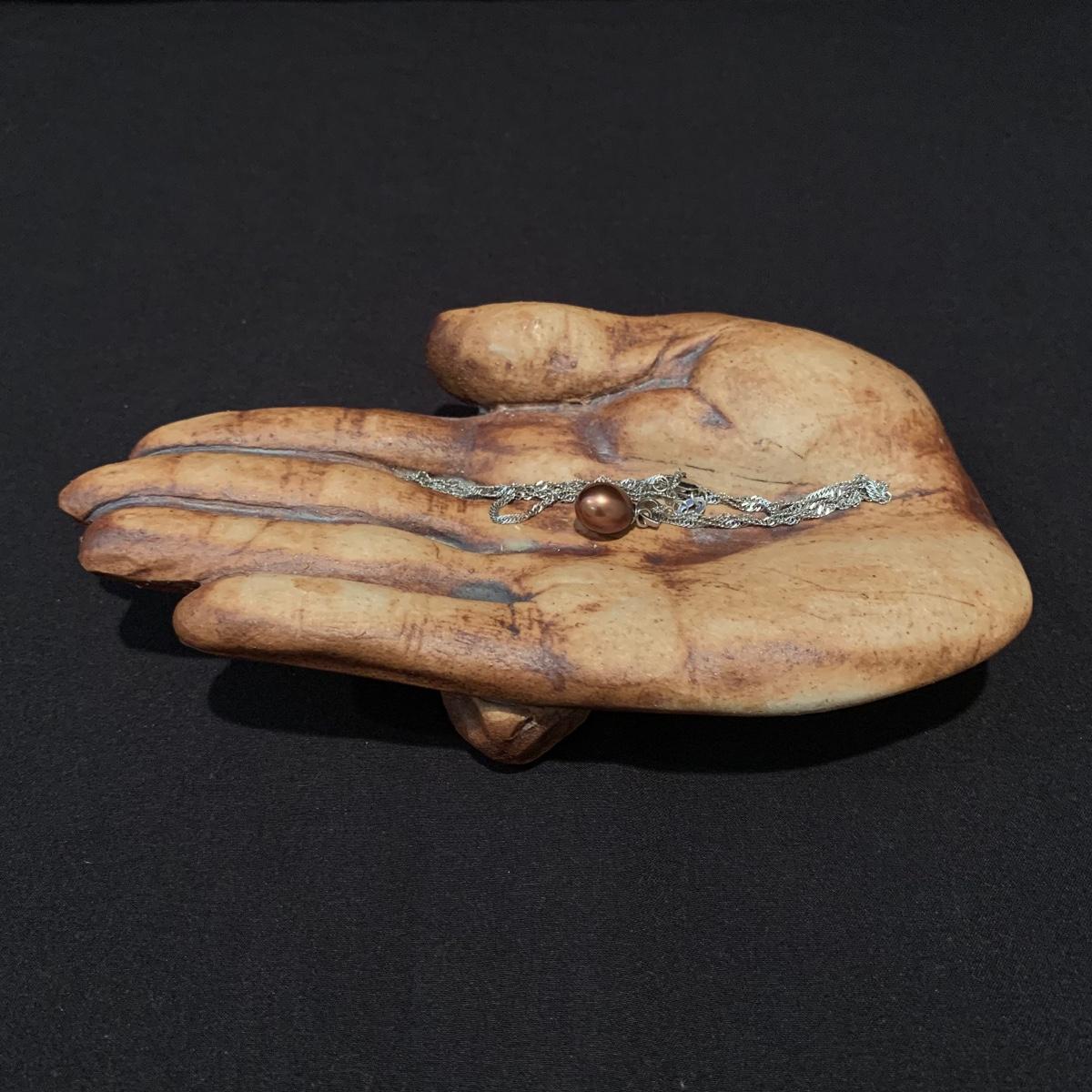 This lot includes a 925 Sterling silver spiral chain necklace with a pearlescent pendant as well as a ceramic hand. The necklace chain is 18” and comes with a cocoa colored pearlescent pendant. The ceramic hand has a makers mark that reads “ Ben Behunin , Wild Rooster Artworks “ on Salt Lake City. It also reads that it was “handmade by humans in the free world”. It is approximately 7” x 4”. Shipping Available