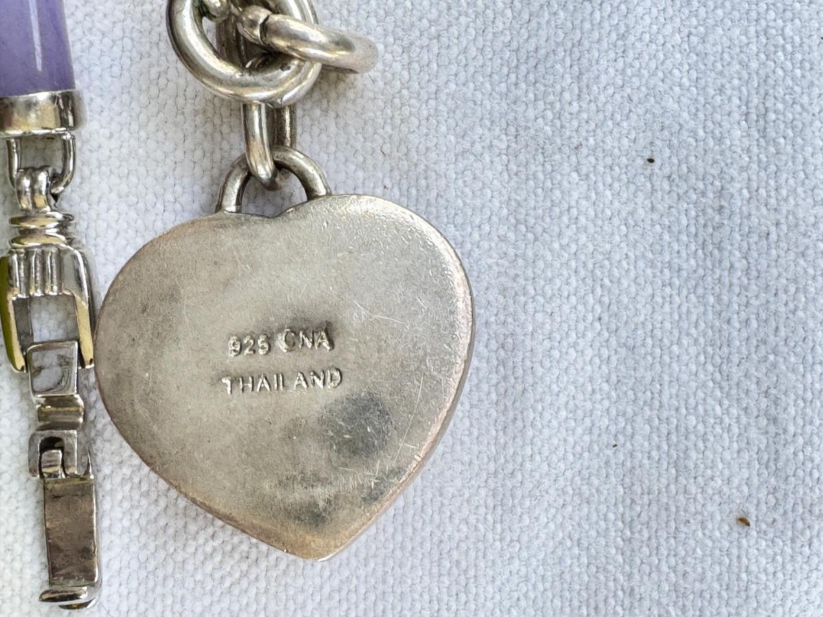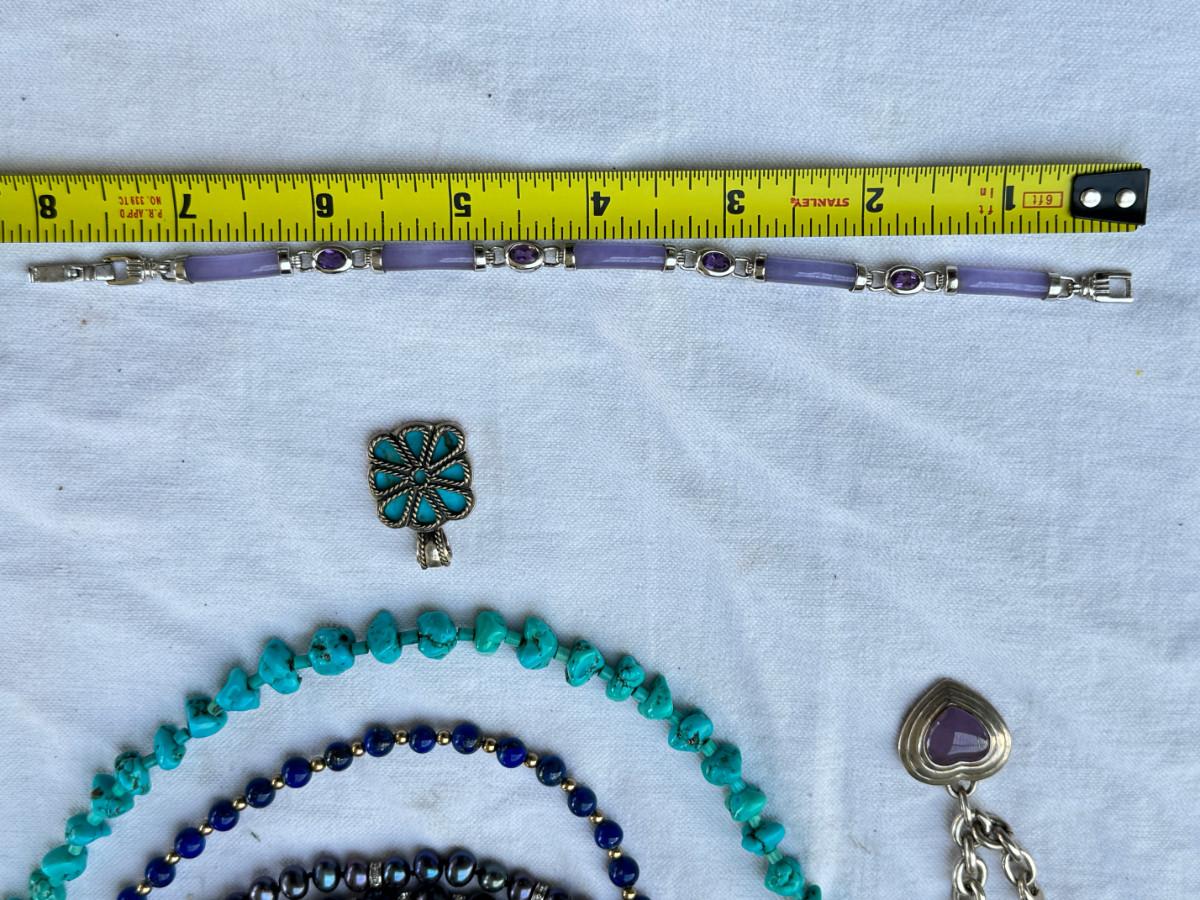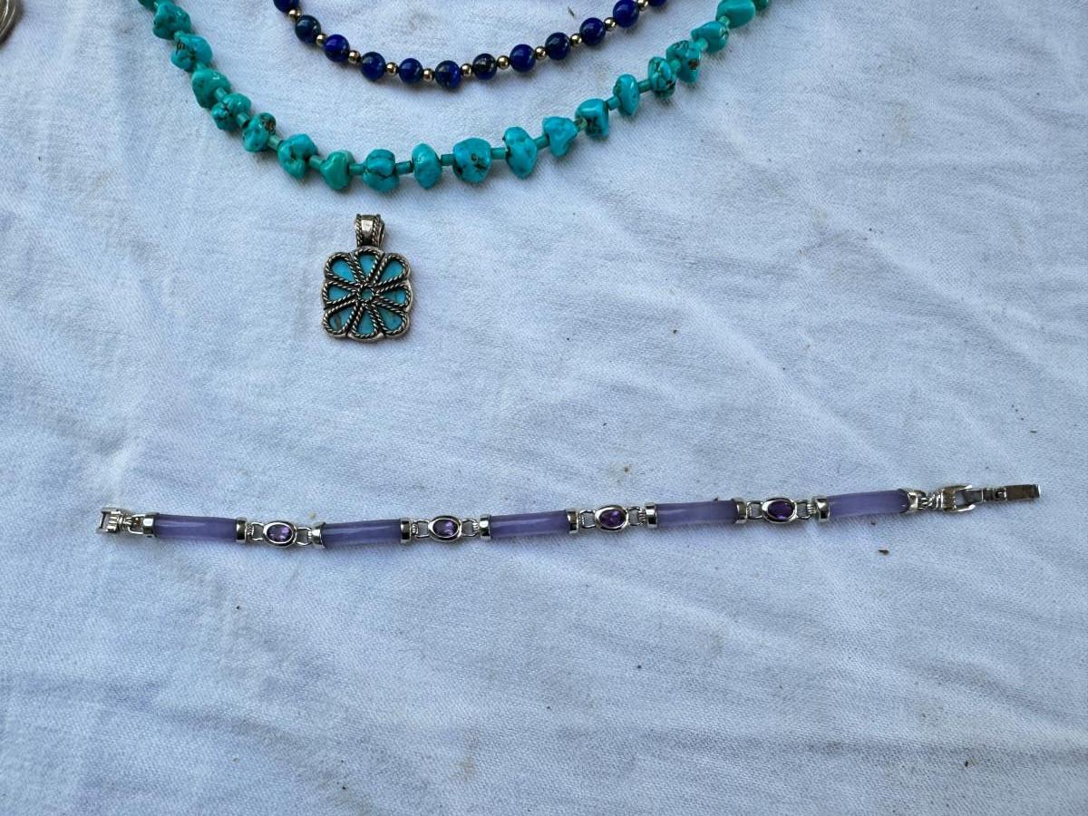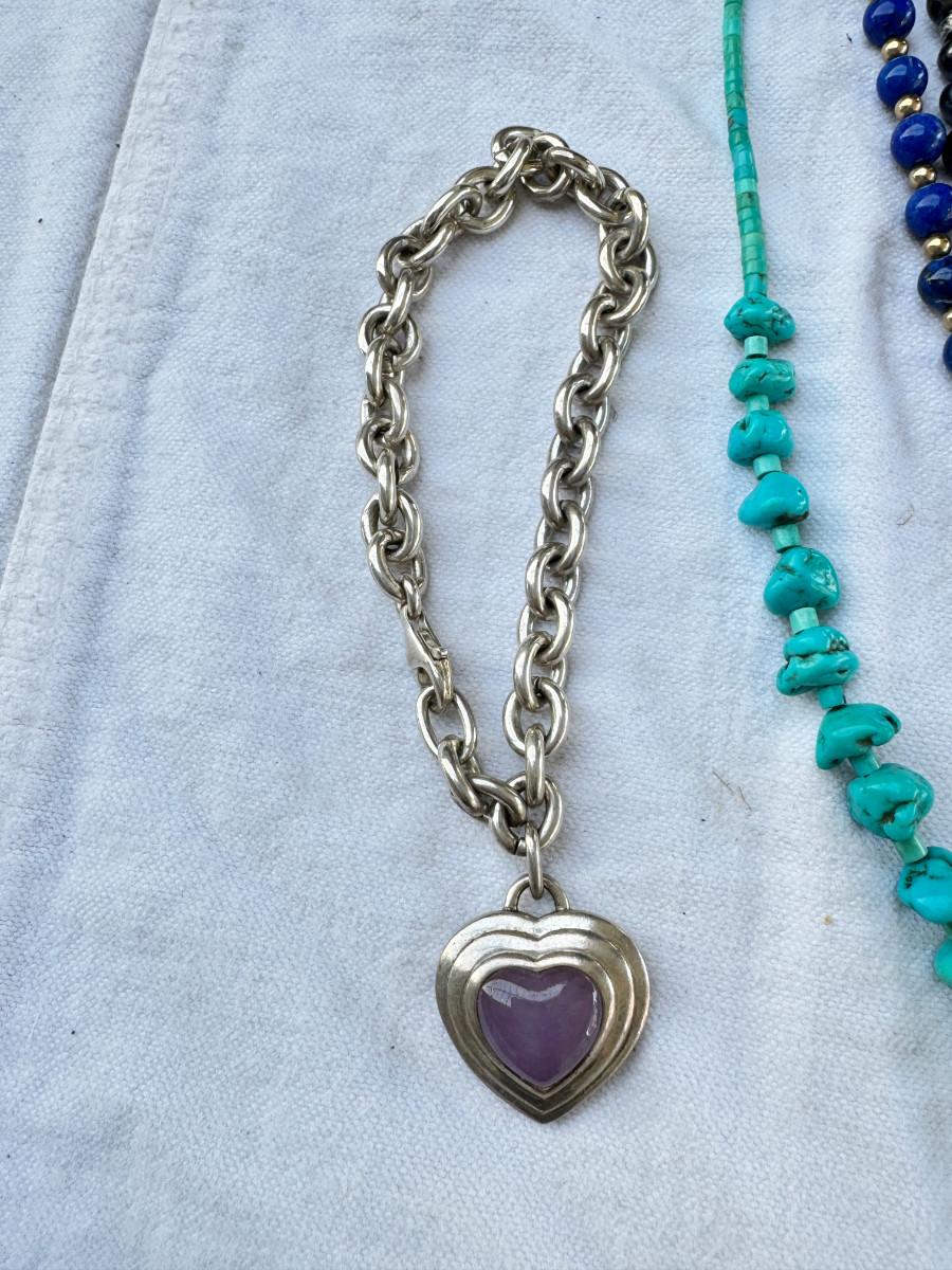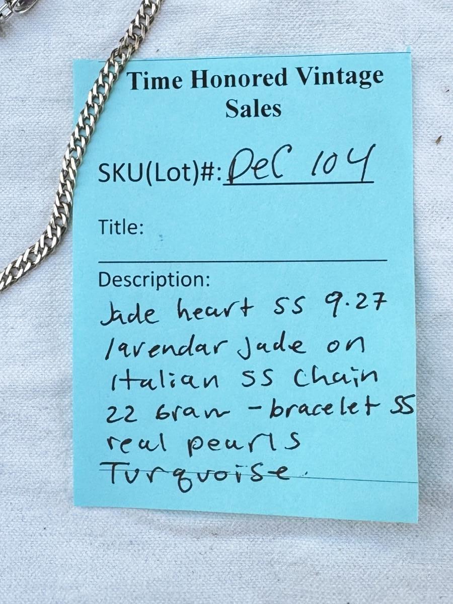 Lavender jade on a 26" Italian 925 chain, pendant is also Sterling and marked. Lavender jade bracelet, Lavender jade Silver heart bracelet ( Chain did not test sterling and is not marked) Real colored Freshwater pearls necklaces and bracelet. Display NOT included.