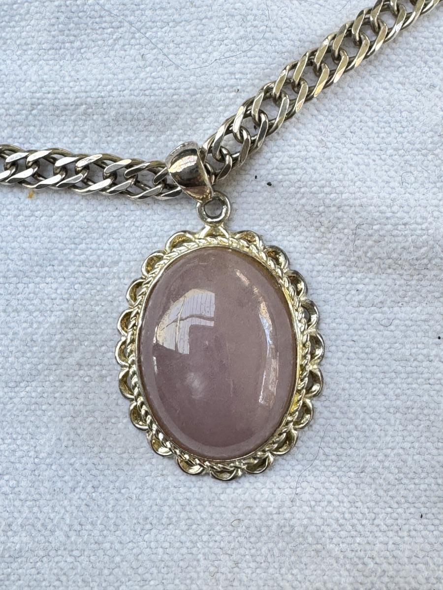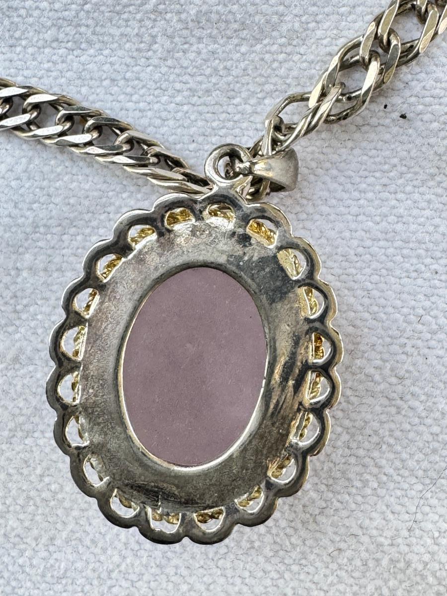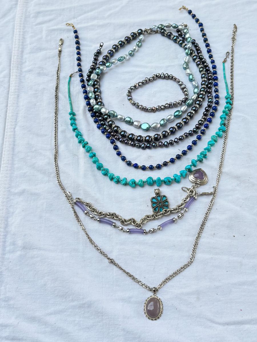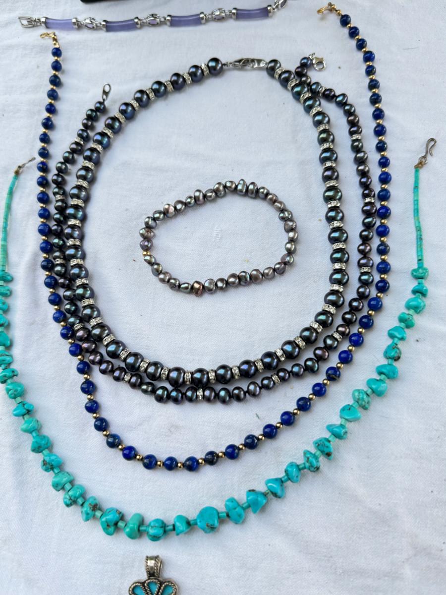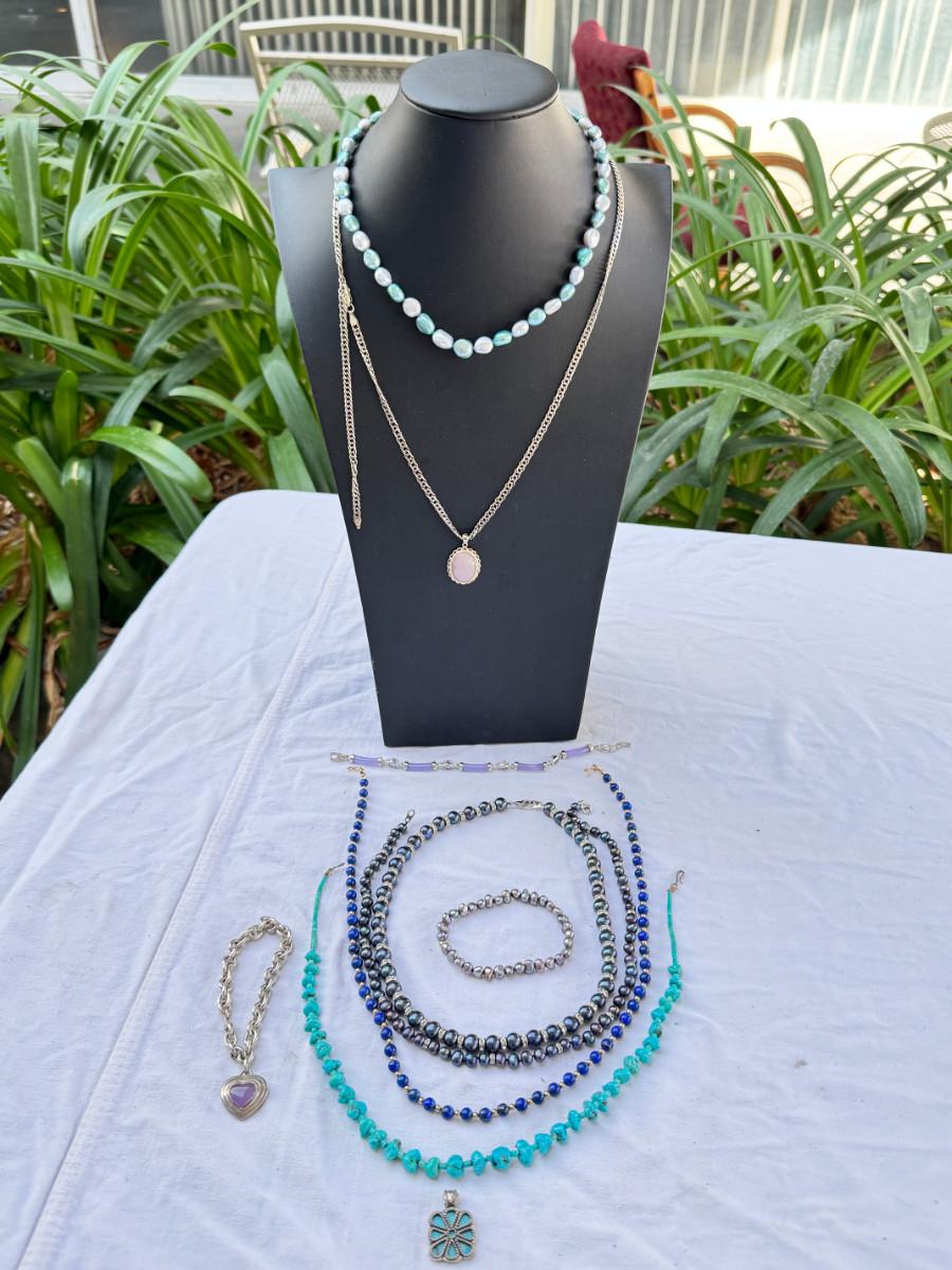 Lavender jade on a 26" Italian 925 chain, pendant is also Sterling and marked. Lavender jade bracelet, Lavender jade Silver heart bracelet ( Chain did not test sterling and is not marked) Real colored Freshwater pearls necklaces and bracelet. Display NOT included.