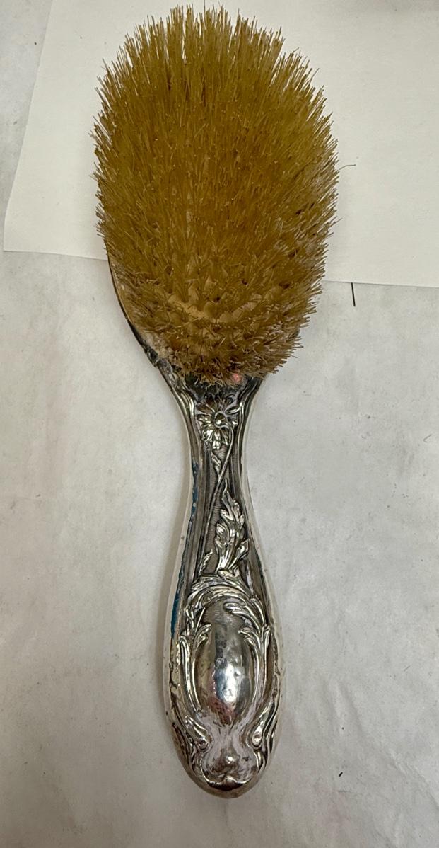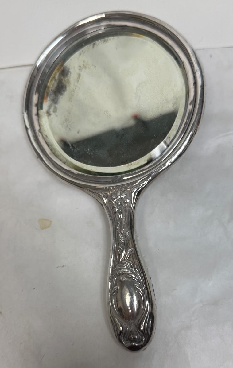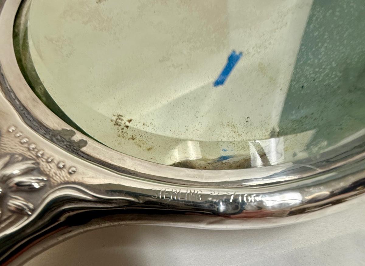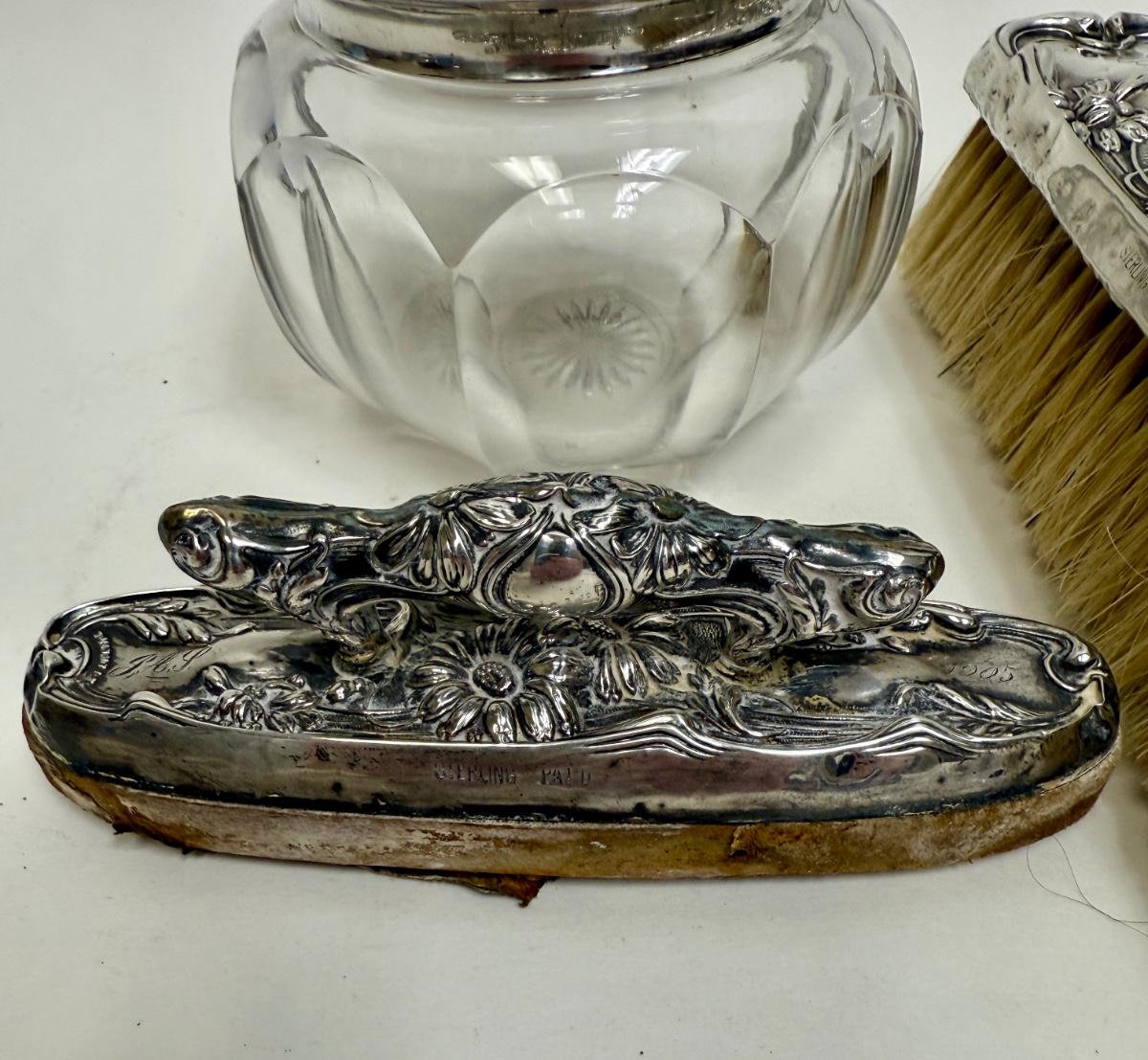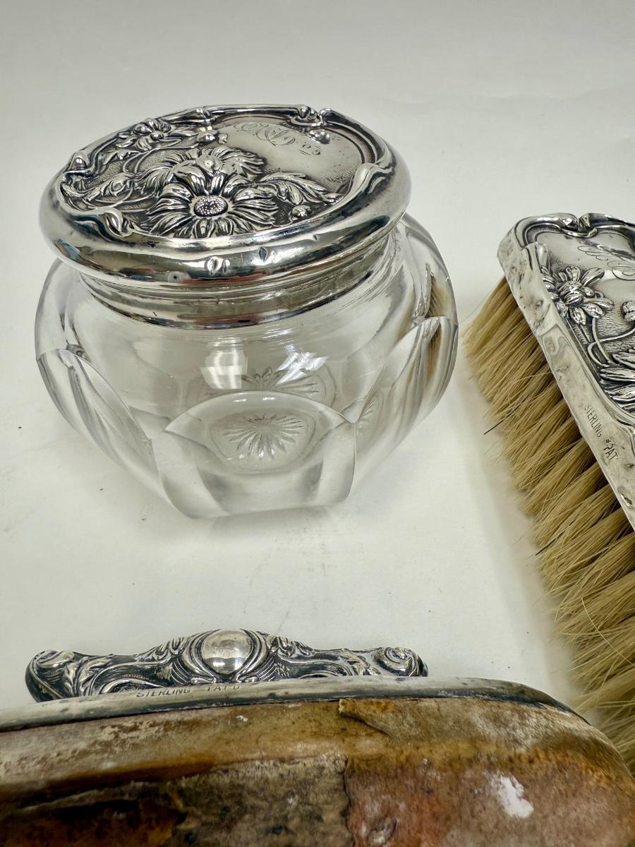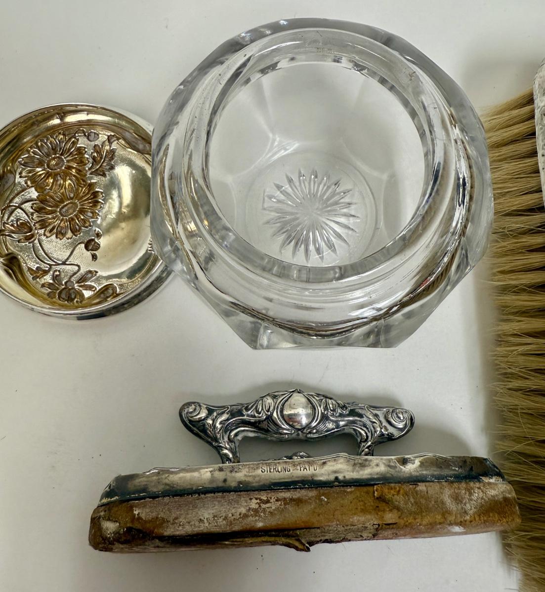 Hand mirror, brushes, nail buffer, dresser Jar, Soap Box. fair to good condition - there are dings and dents, and some deterioration of nail buffer pad, mirror clarity which is normal for the age of the pieces.. See photos for condition. All pieces are marked Sterling except for jar lid, but it looks like the other pieces. Total Weight for all pieces except glass jar is 782g.