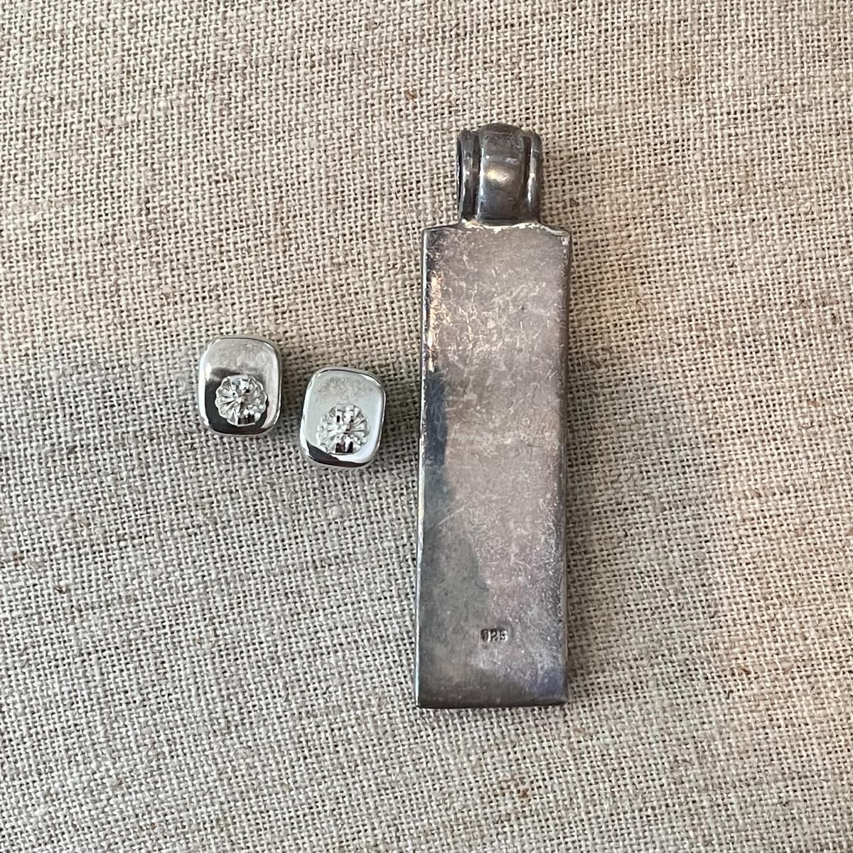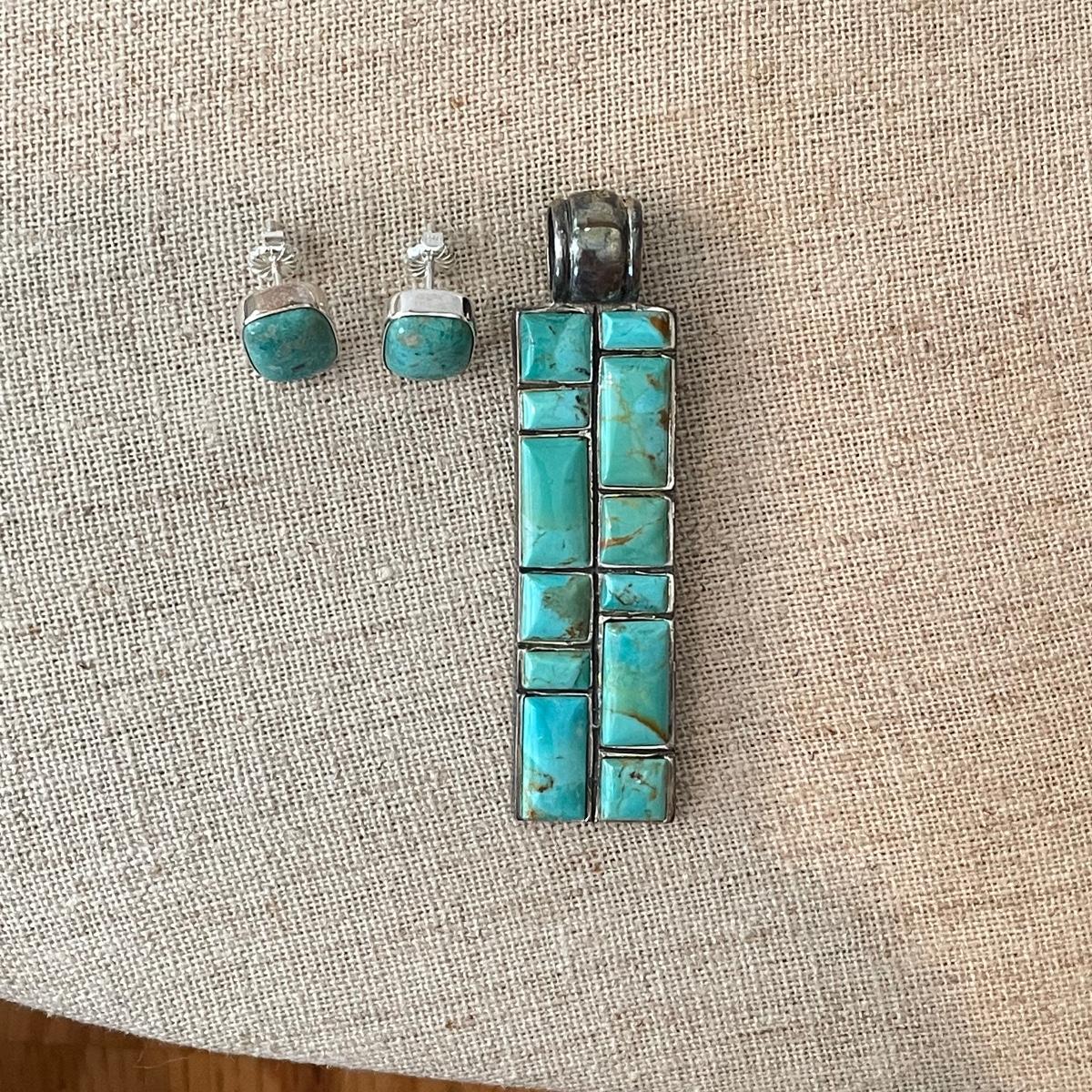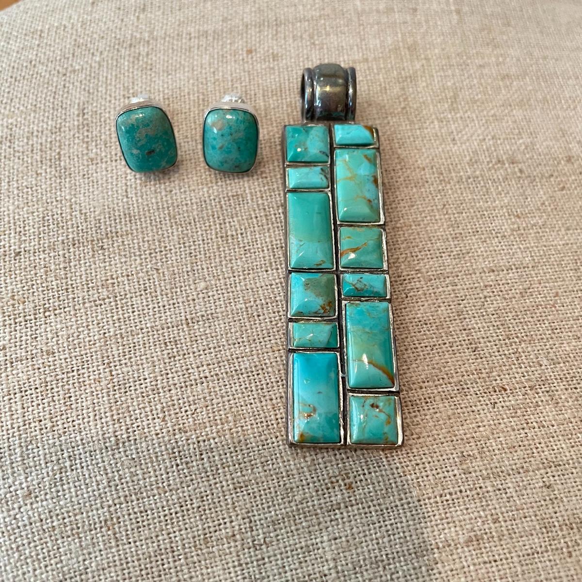 Turquoise pendant marked 925 with complementing earrings marked 925 on post. Shipping available.