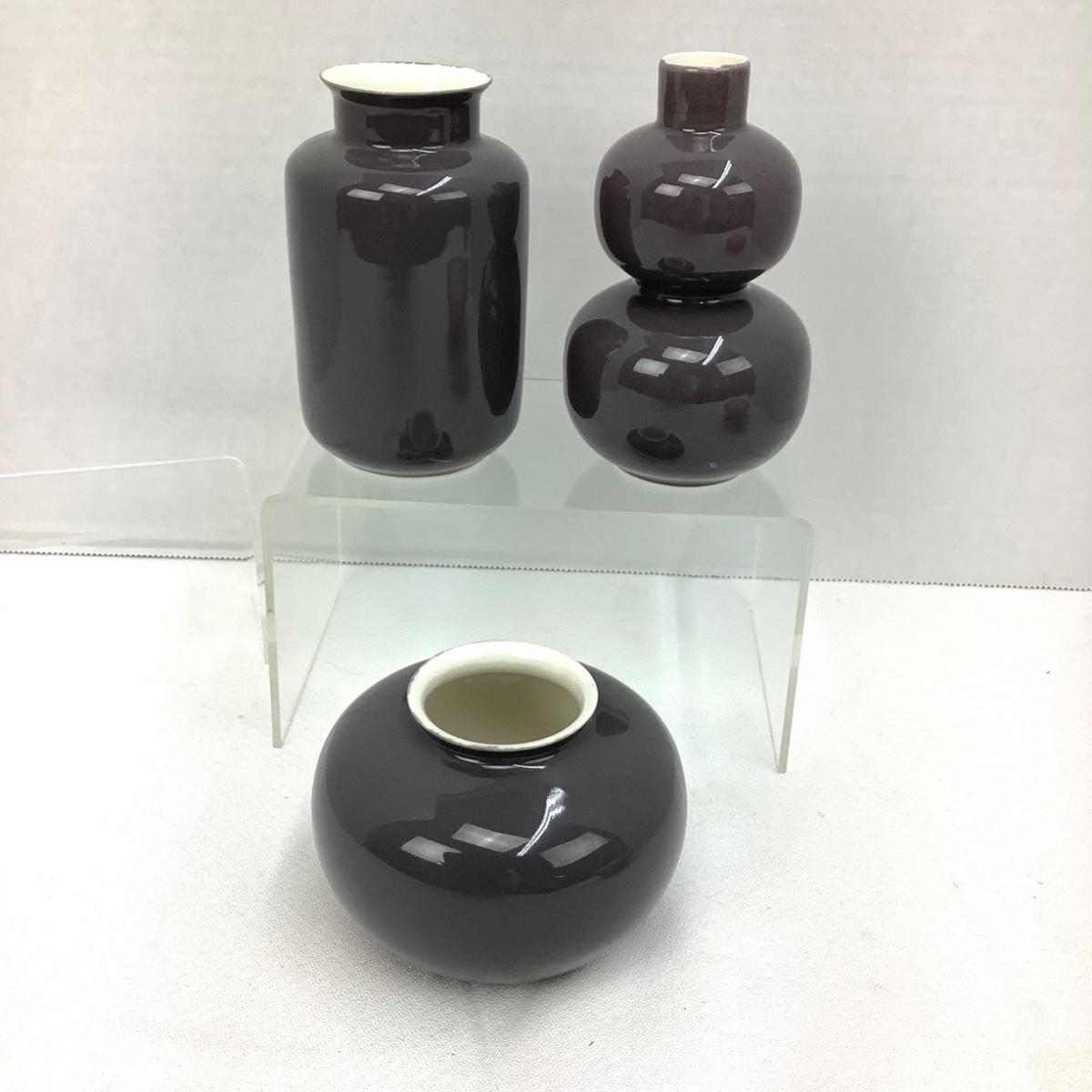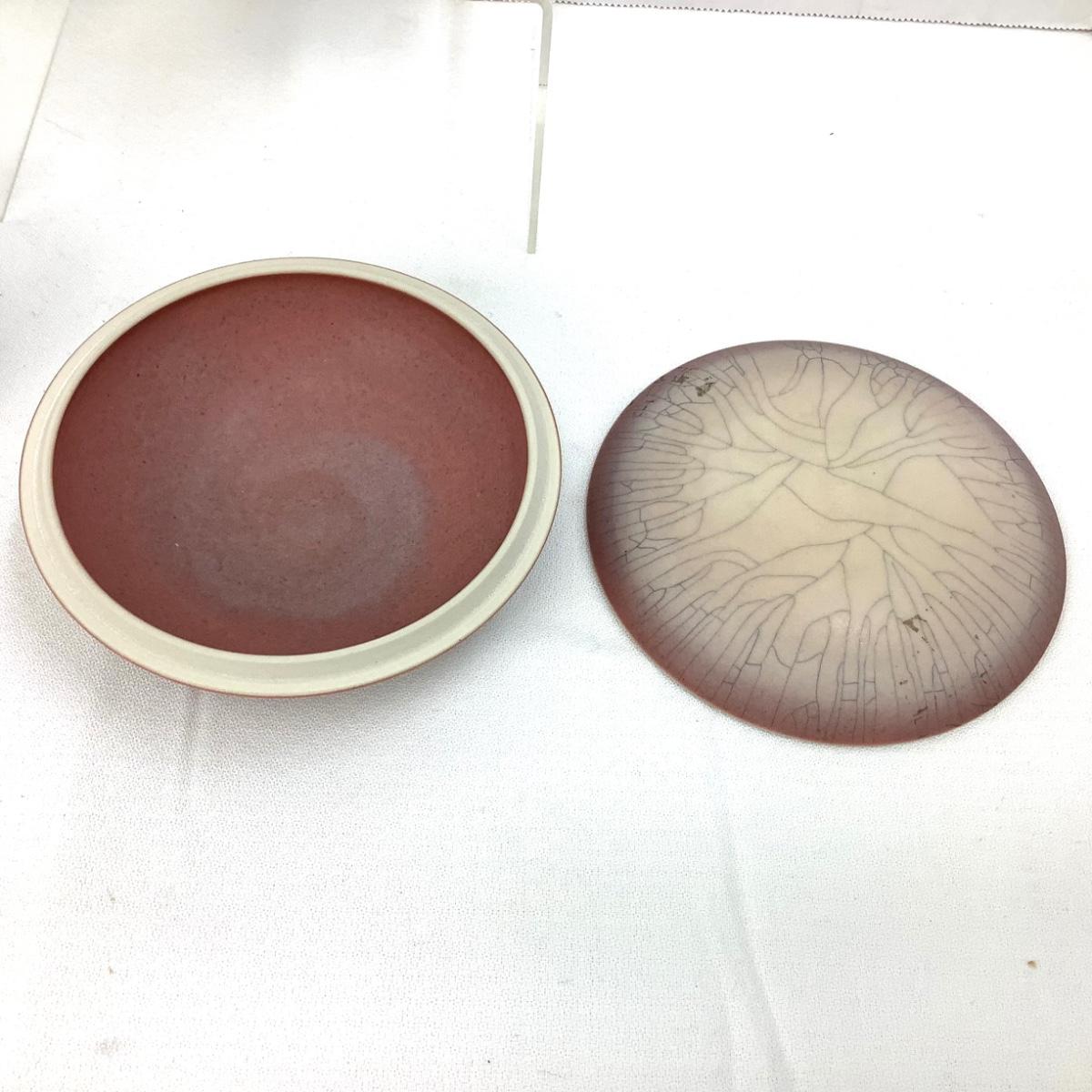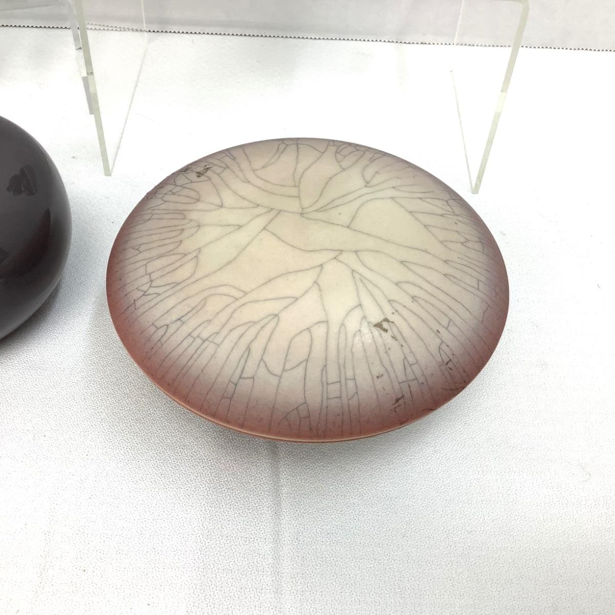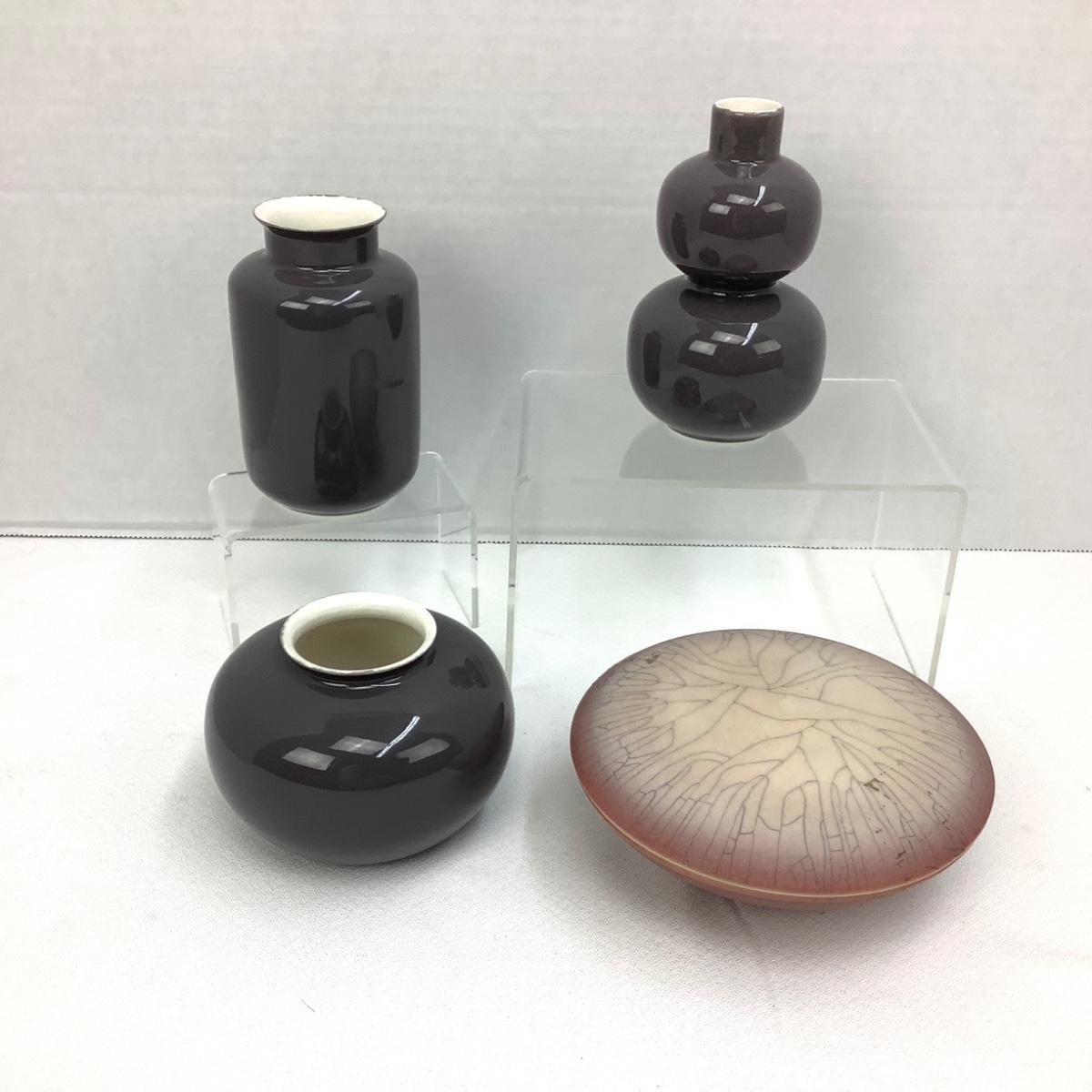 The vases range in size from 2.5"-4.5", the pink covered dish has grey details, artisan signed and measures 5" in diameter and 2" tall.