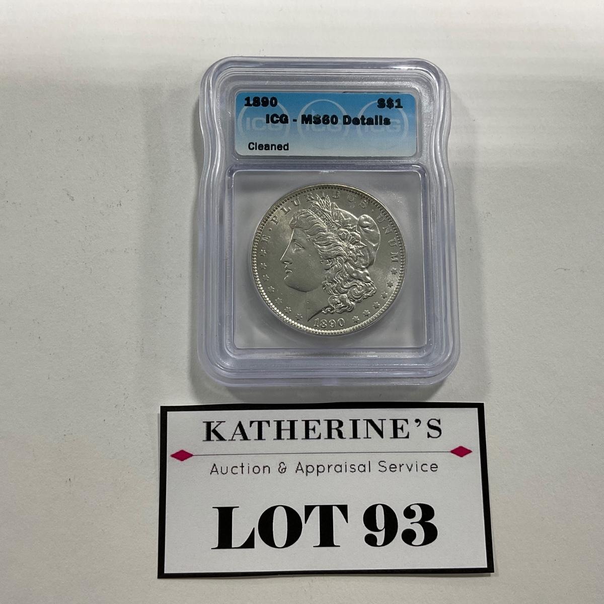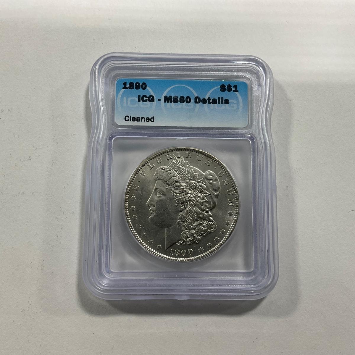 One graded 1890 Morgan ICG MS60 (Cleaned) Coin. Please see photos for details and condition. ::: Shipping is available on this lot. If you require shipping you must let us know at the close of the auction. We will coordinate with you after the item has been won. Shipping fees will include insurance up to or exceeding the value of all items being mailed. If you have any questions regarding this lot please contact the auctioneer either via this website, by direct email or by phone. PICK UP TIMES and other important information can be found in the TERMS and DESCRIPTION of the auction. Please take a look for pertinent information. Thanks!