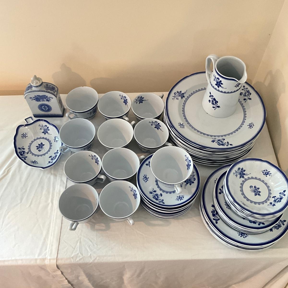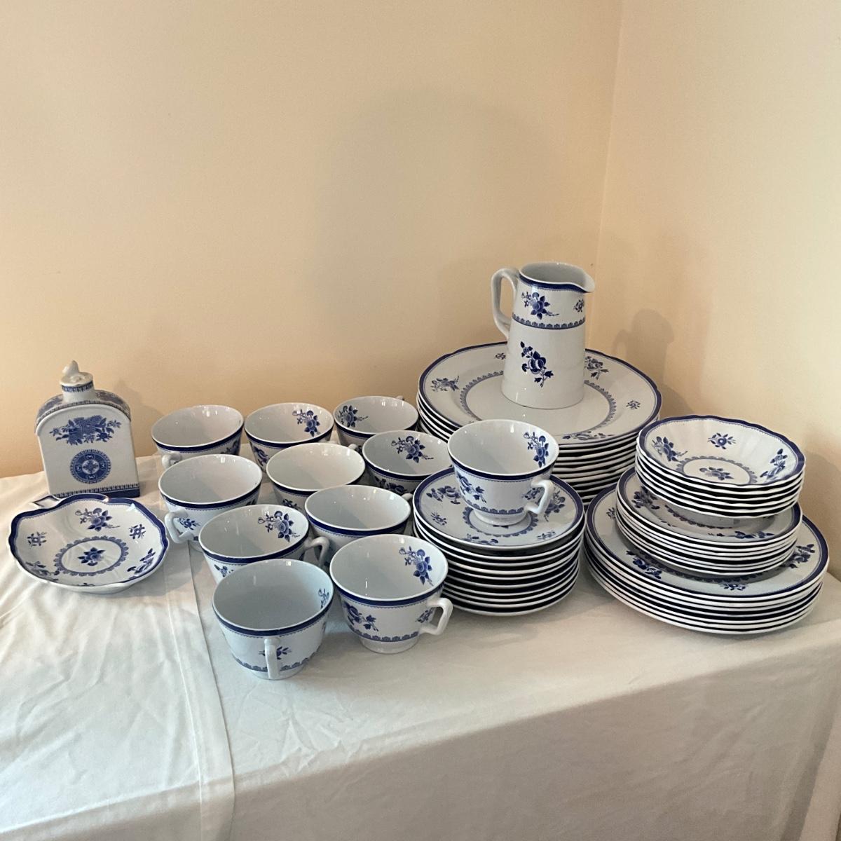 This lot includes 11 dinner plates, 7 salad plates, 7 bread and butter plates, 6 fruit bowls, 10 saucers, 11 cups, 1 leaf plate, 1 bottle, and one of the cups is chipped please refer to photo