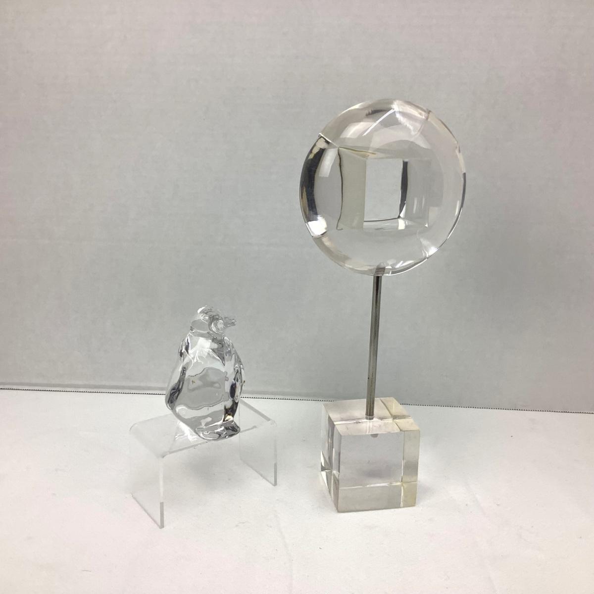 The lucite art sculpture is 11" x 4.5" and the penguin is 4" tall.