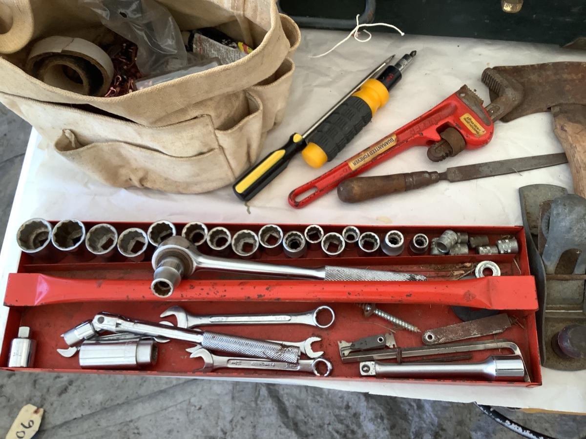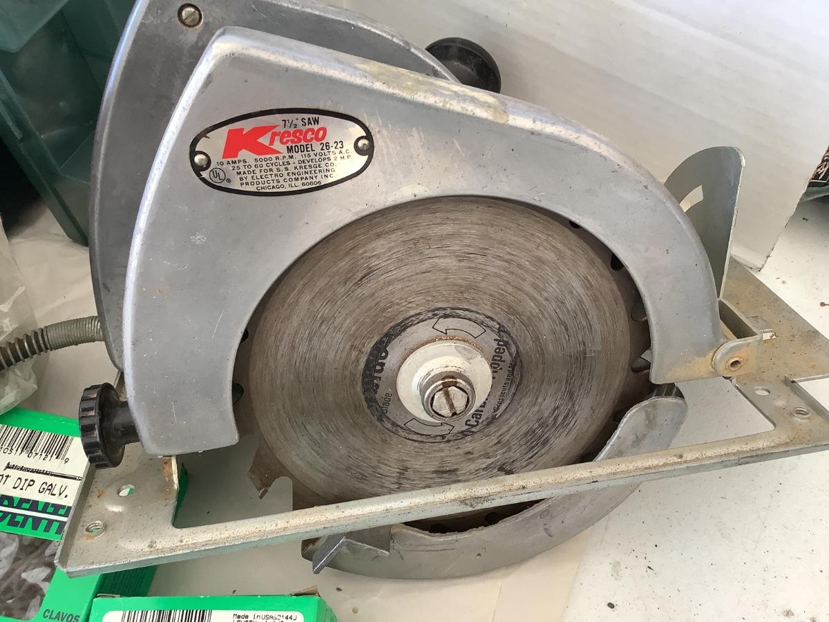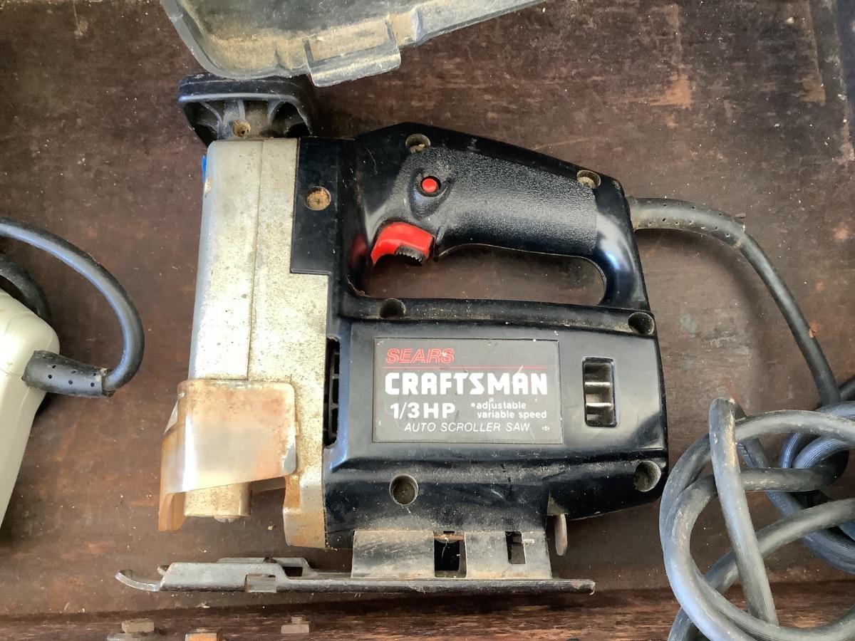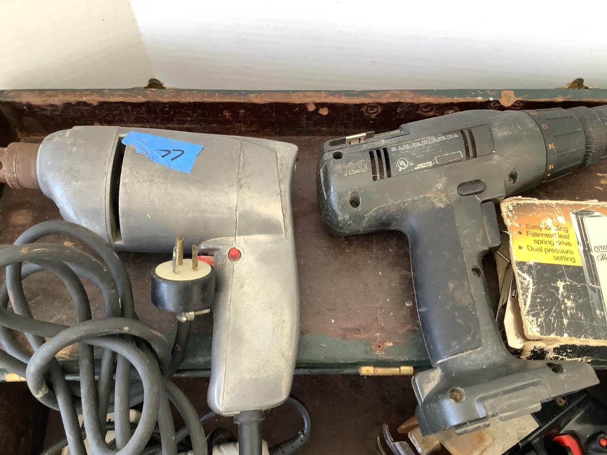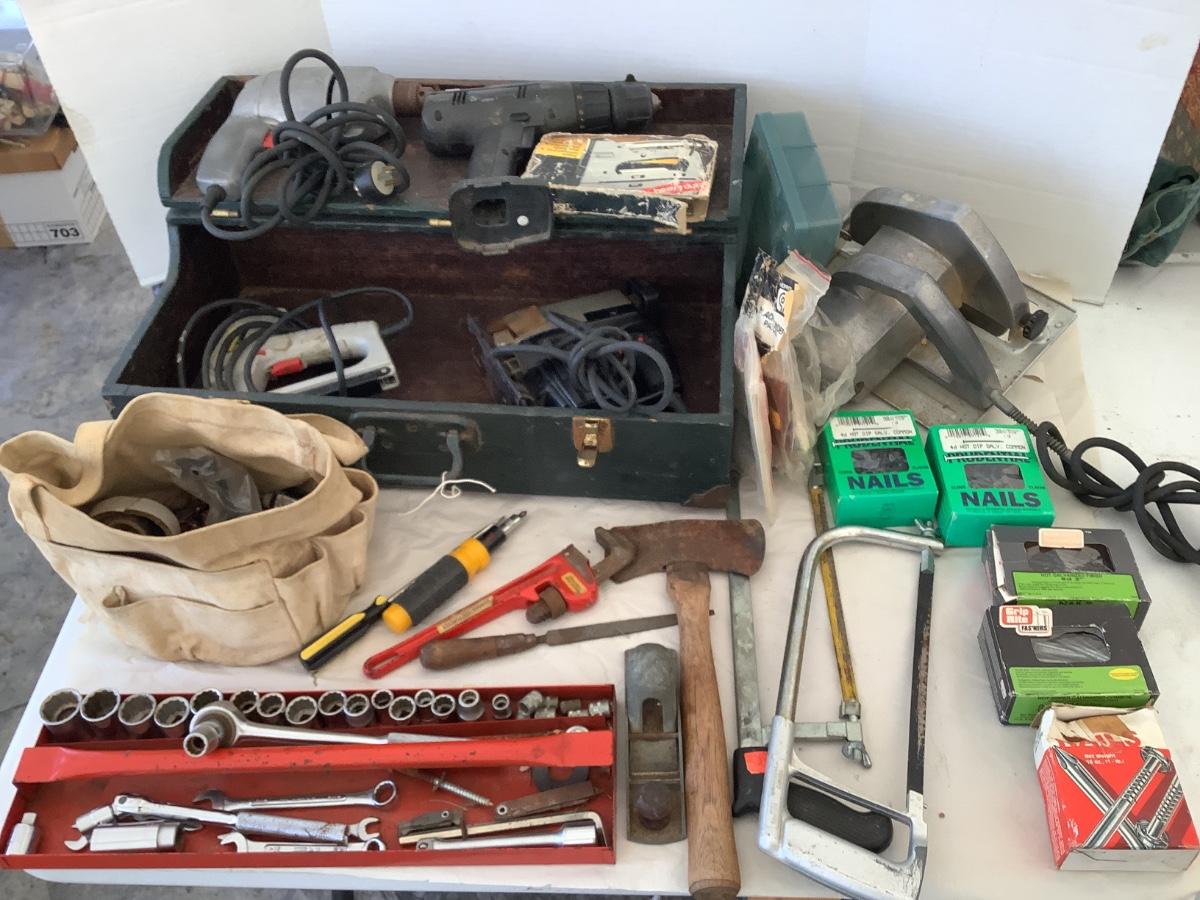 Vintage Wooden Toolbox, Power tool, Socket set-mixed U.S and metric, Hardware LOT, qty (2) hack saws, See pics for details, model numbers, etc....?