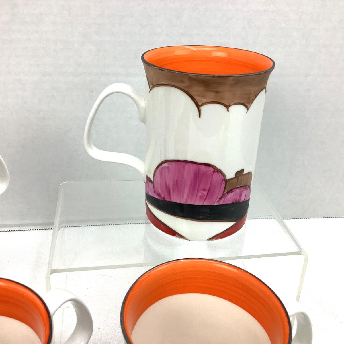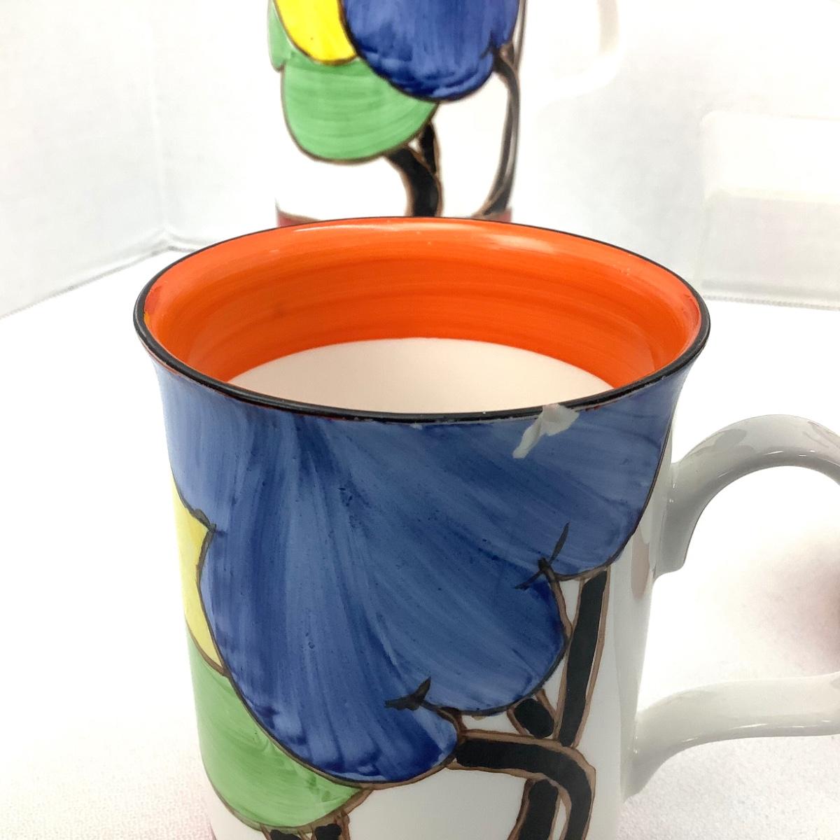 The mugs are in CLarice Cliff art deco style, they are 4" x 3"d.