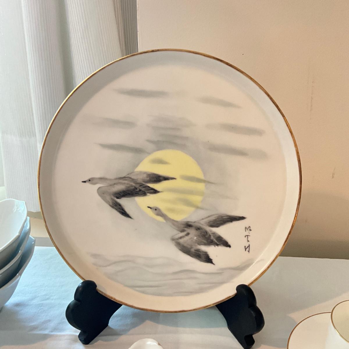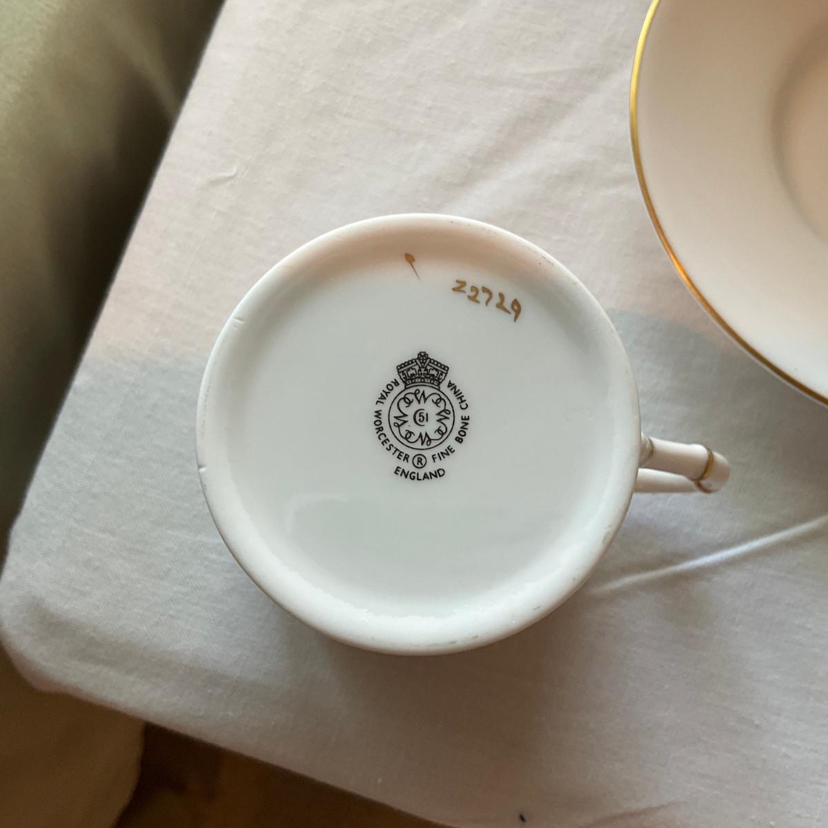 Has royal worcester, cups, flower bowls, saucers, cow-shaped creamer, large bird plater