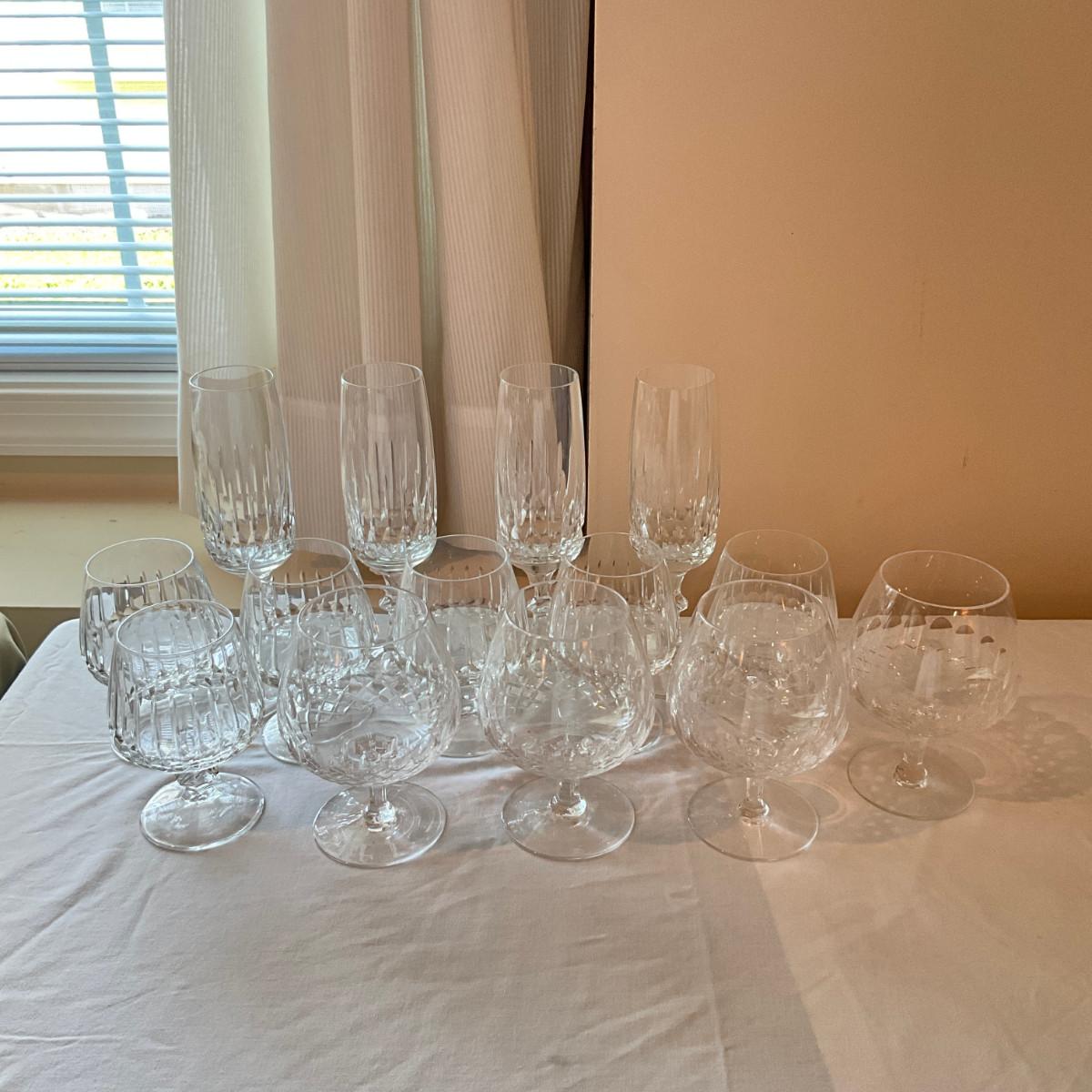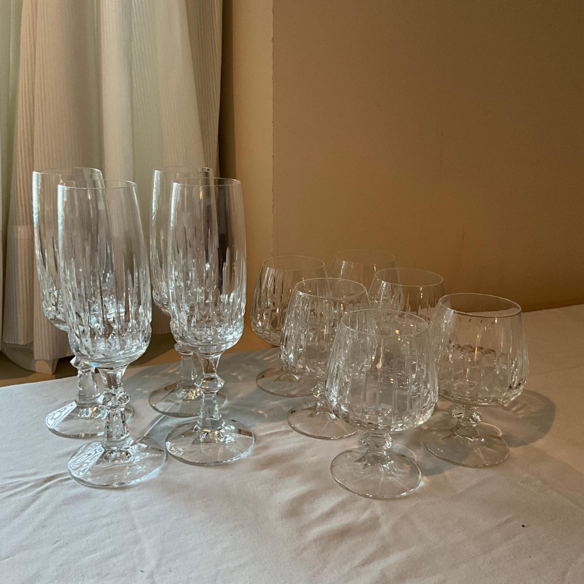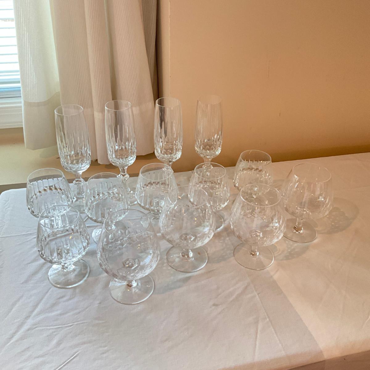 Four champagne flutes, six brandy glasses, four medium brandy glasses