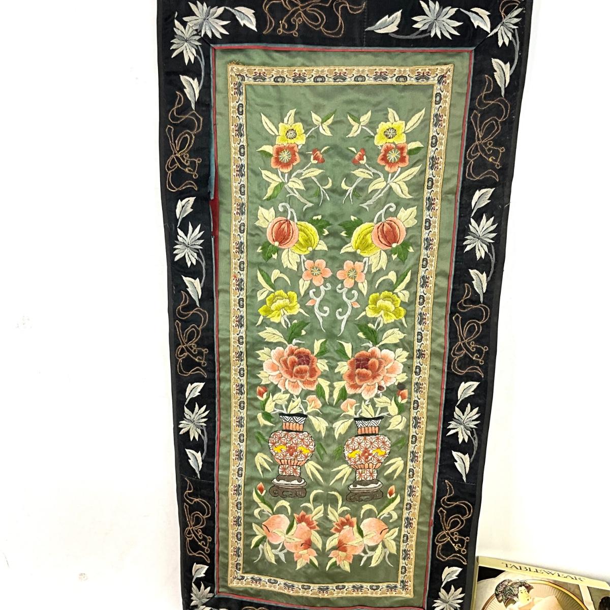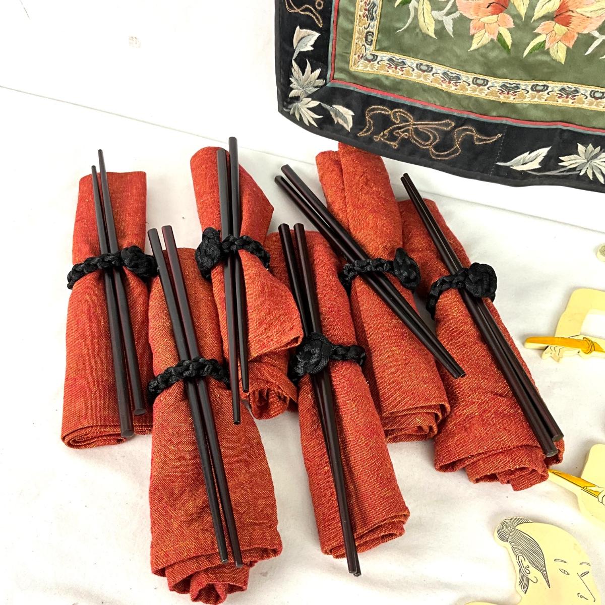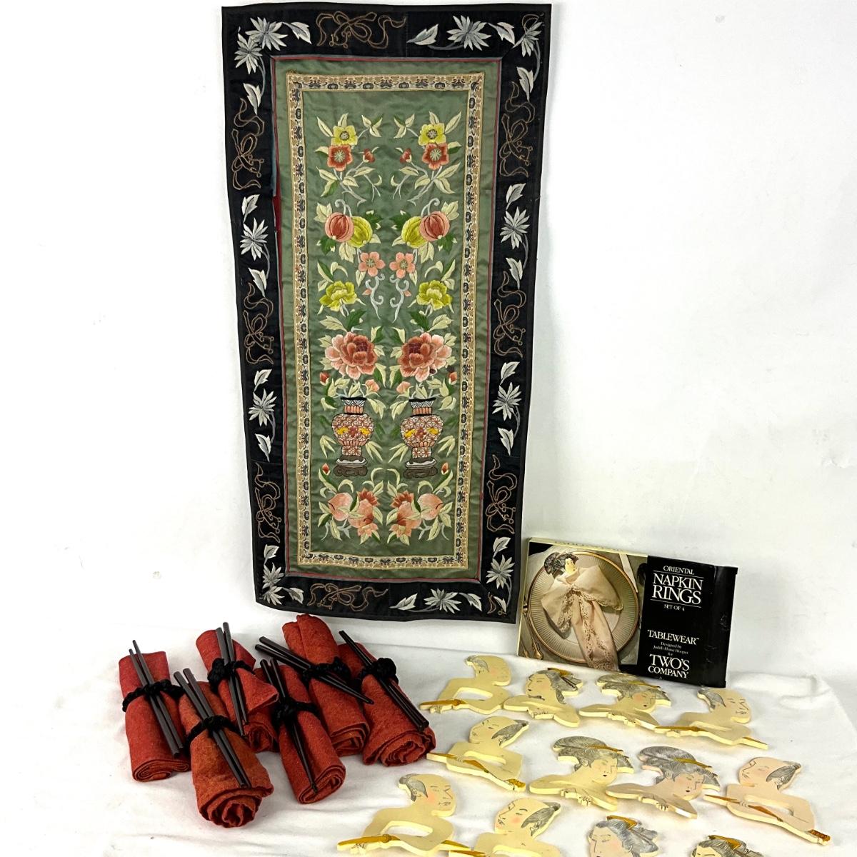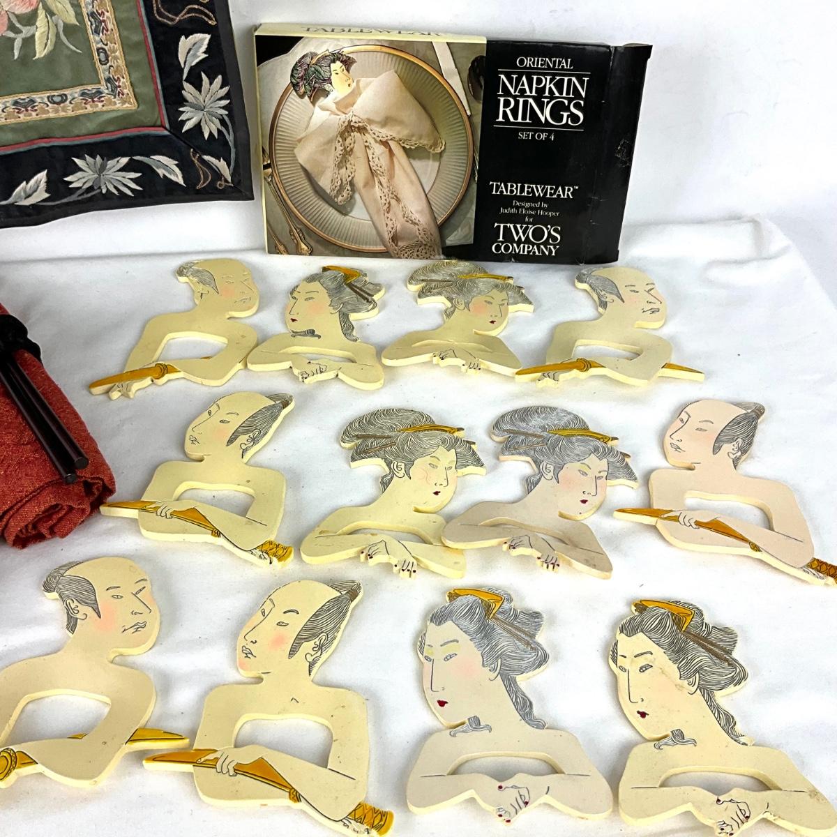 The lot contains 6 burnt orange napkins with braided holders and chopsticks, Silk embroidered table runner that measure 25"L x 12"w. Two's Company Oriental Napkin Ring holders to create people-6 women and 6 men.