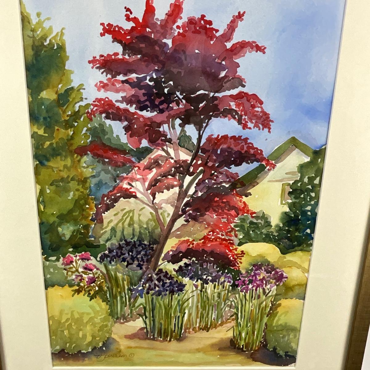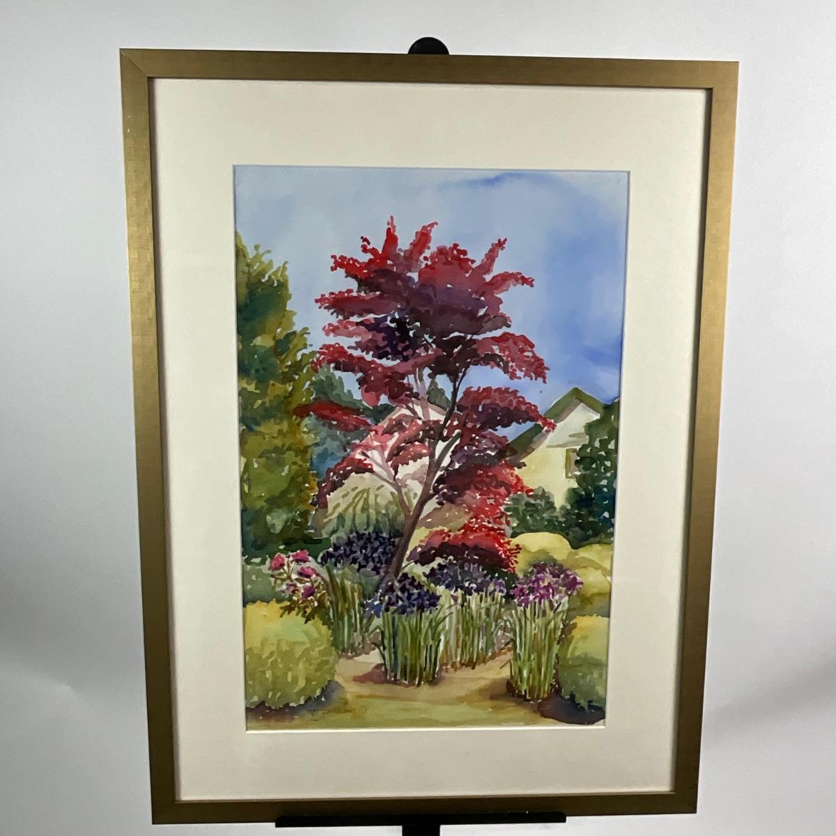 939 Original Watercolor of Red Maple Tree in Garden by Virginia Perram