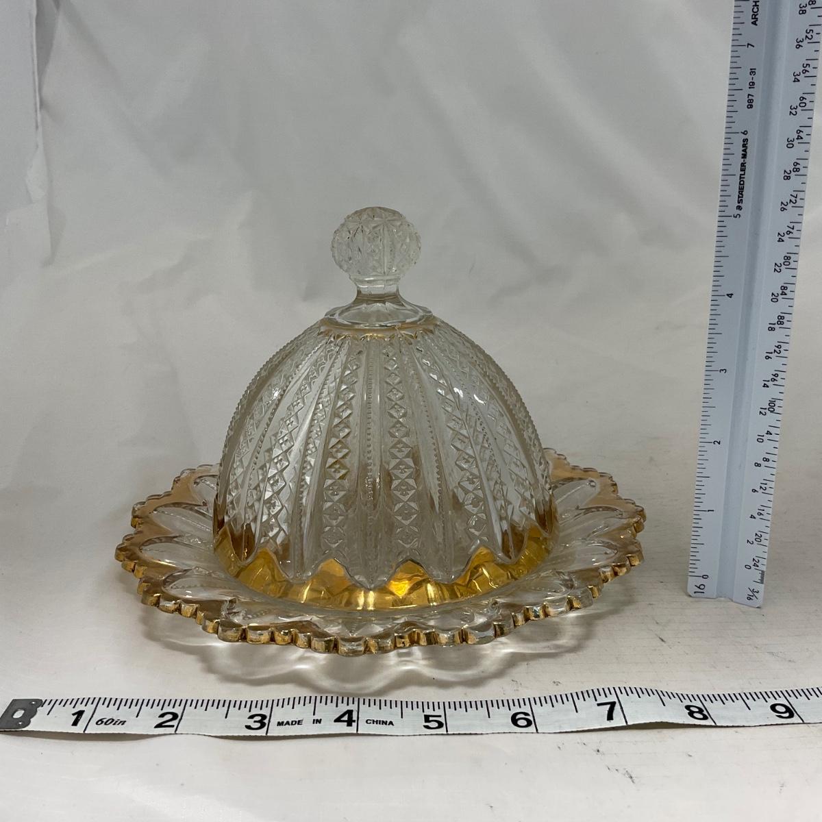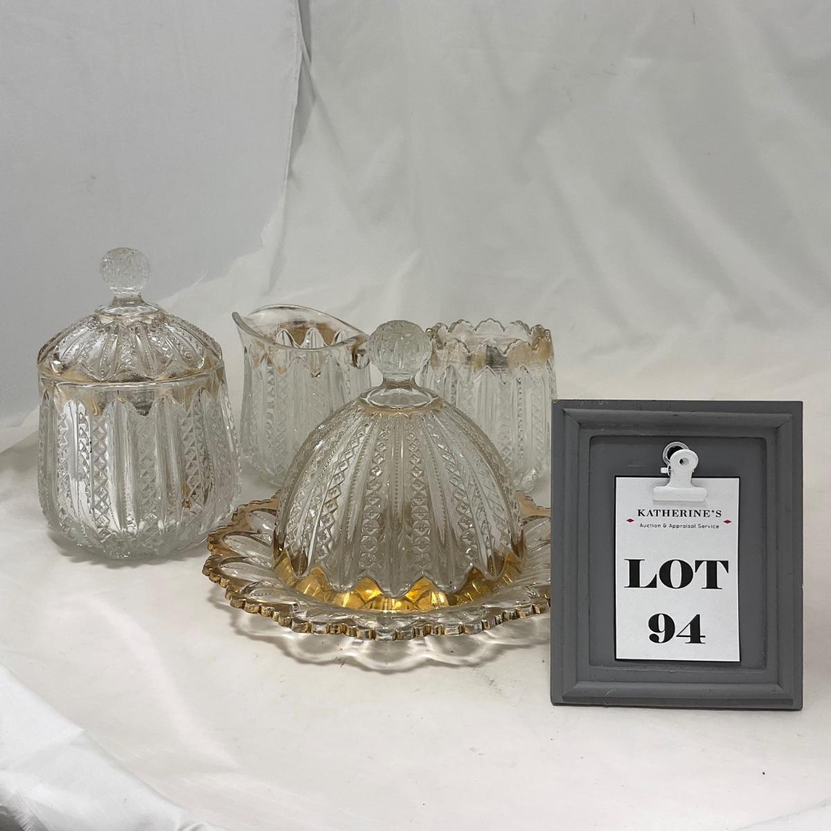 -94- Clear Glass with Gold Accents | Covered Butter Dish | Creamer & Sugar | Lidded Jar