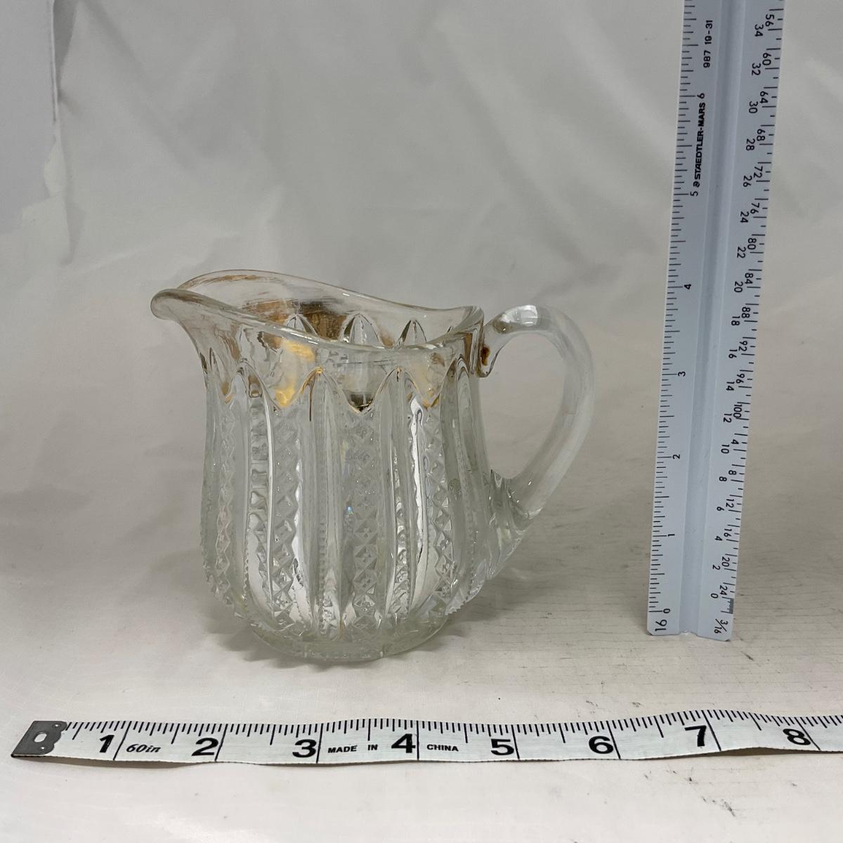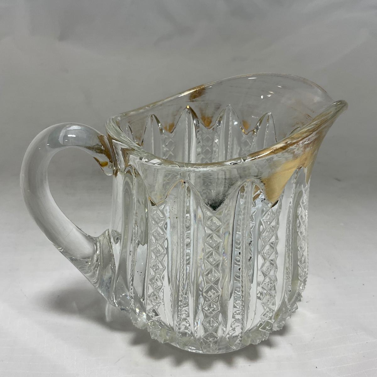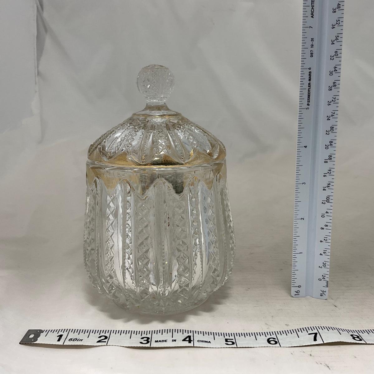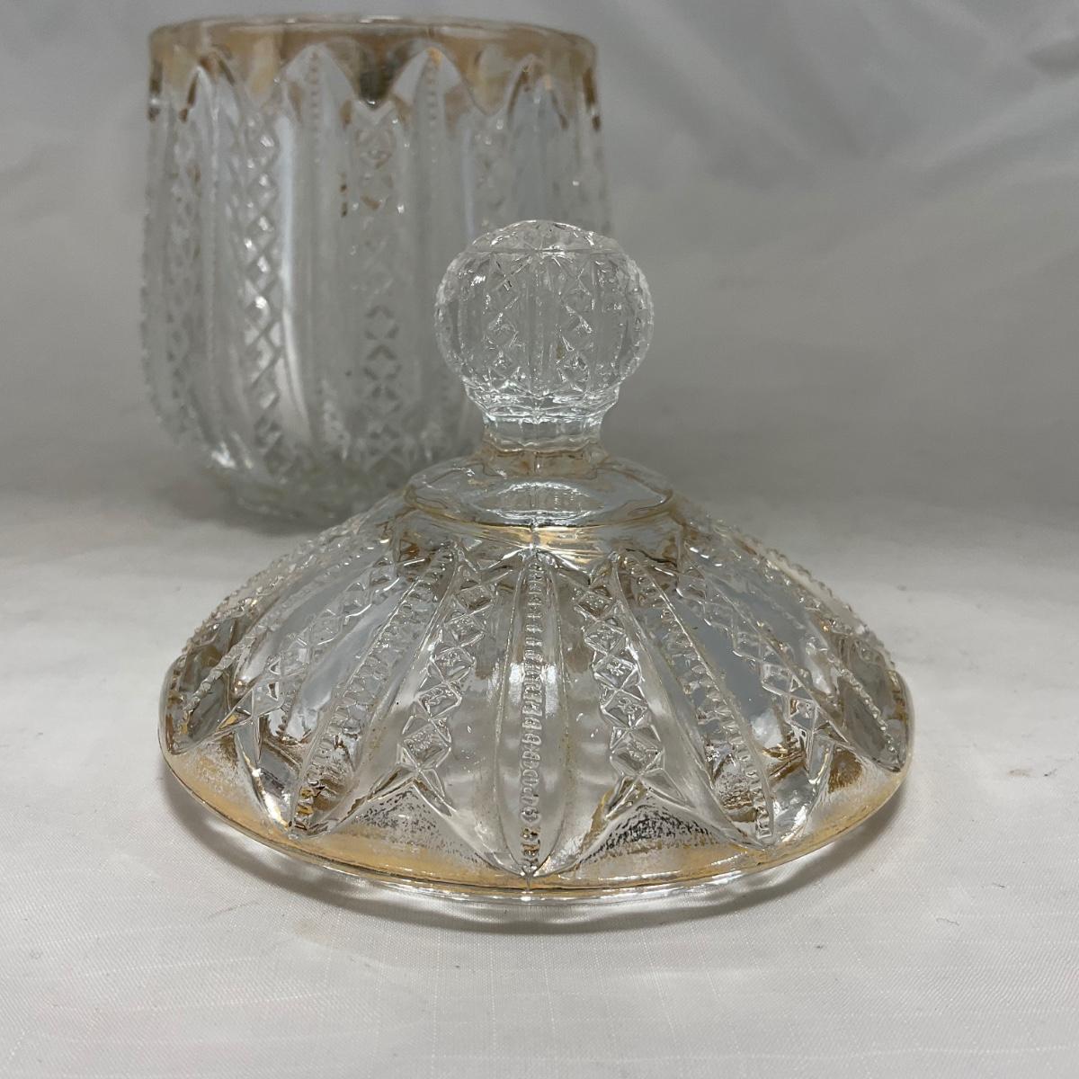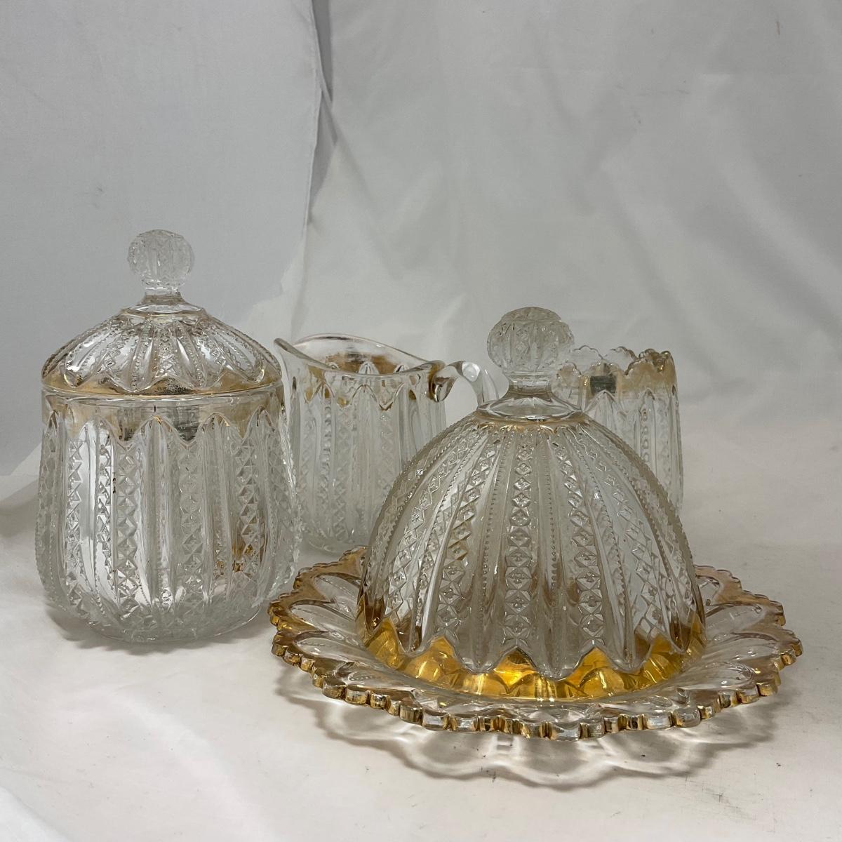 Clear glass with gold accents set. With gold accents and a cross checked type pattern this set has a classic elegant look. Set includes covered butter dish, lidded jar, creamer and sugar set. Please see photos for details and condition. ::: Shipping is available on this lot. If you require shipping you must let us know at the close of the auction. We will coordinate with you after the item has been won. Shipping fees will include insurance up to or exceeding the value of all items being mailed. If you have any questions regarding this lot please contact the auctioneer either via this website, by direct email or by phone. PICK UP TIMES and other important information can be found in the TERMS and DESCRIPTION of the auction. Please take a look for pertinent information. Thanks!