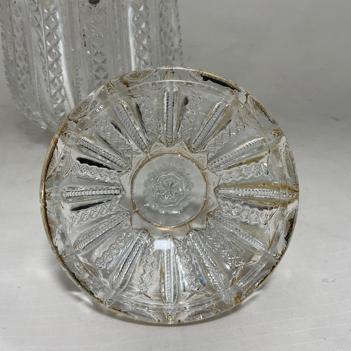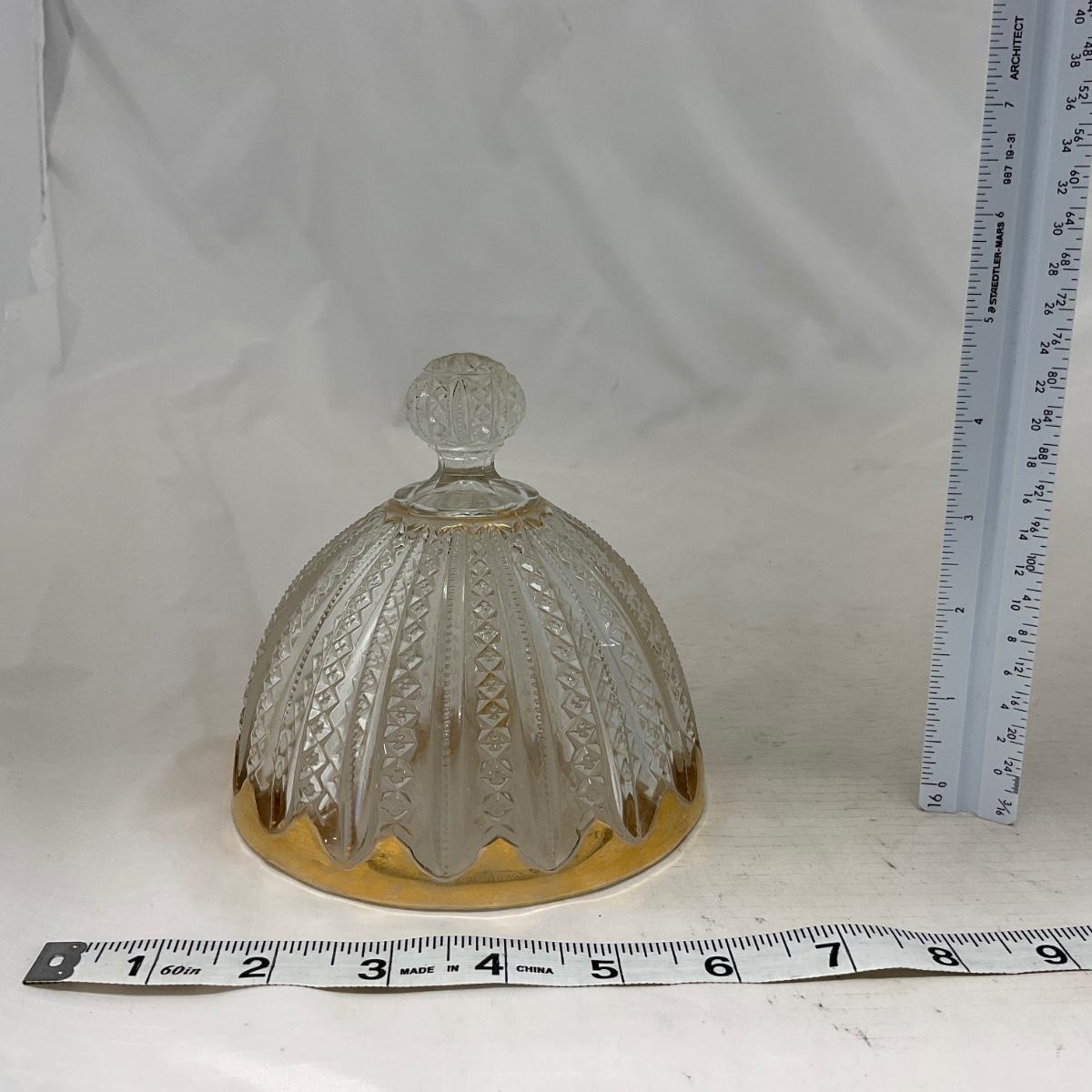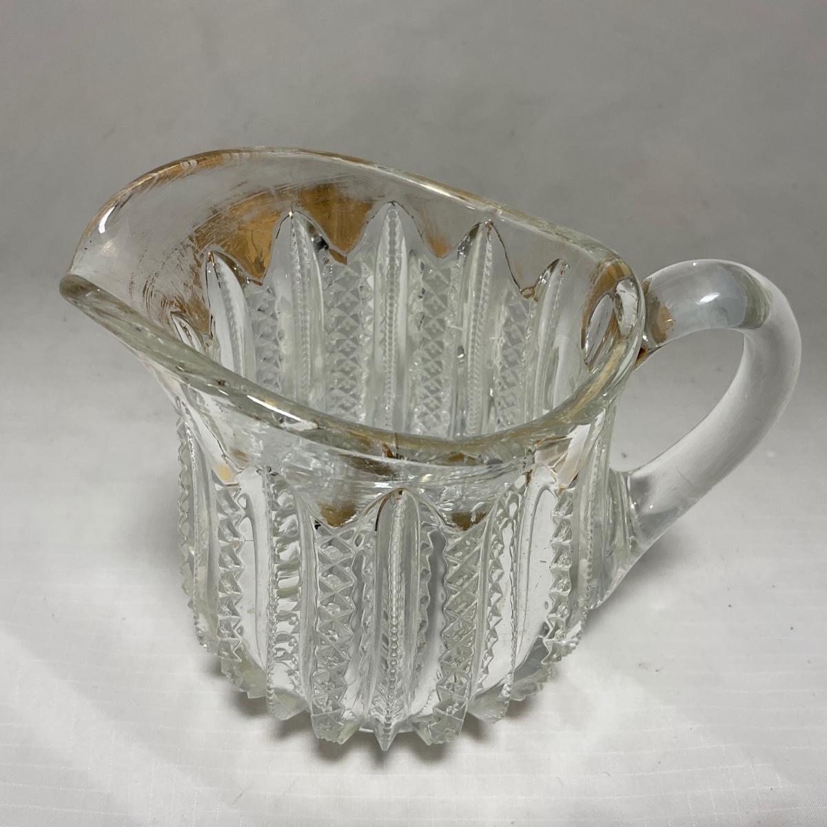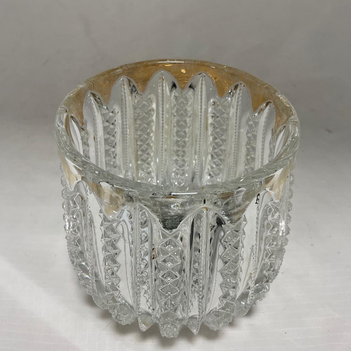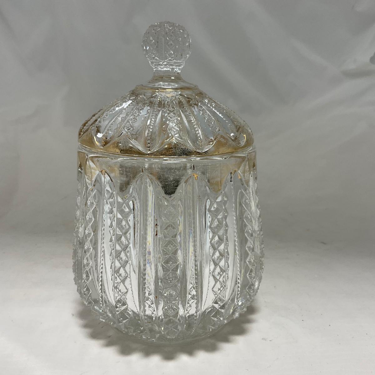 Clear glass with gold accents set. With gold accents and a cross checked type pattern this set has a classic elegant look. Set includes covered butter dish, lidded jar, creamer and sugar set. Please see photos for details and condition. ::: Shipping is available on this lot. If you require shipping you must let us know at the close of the auction. We will coordinate with you after the item has been won. Shipping fees will include insurance up to or exceeding the value of all items being mailed. If you have any questions regarding this lot please contact the auctioneer either via this website, by direct email or by phone. PICK UP TIMES and other important information can be found in the TERMS and DESCRIPTION of the auction. Please take a look for pertinent information. Thanks!
