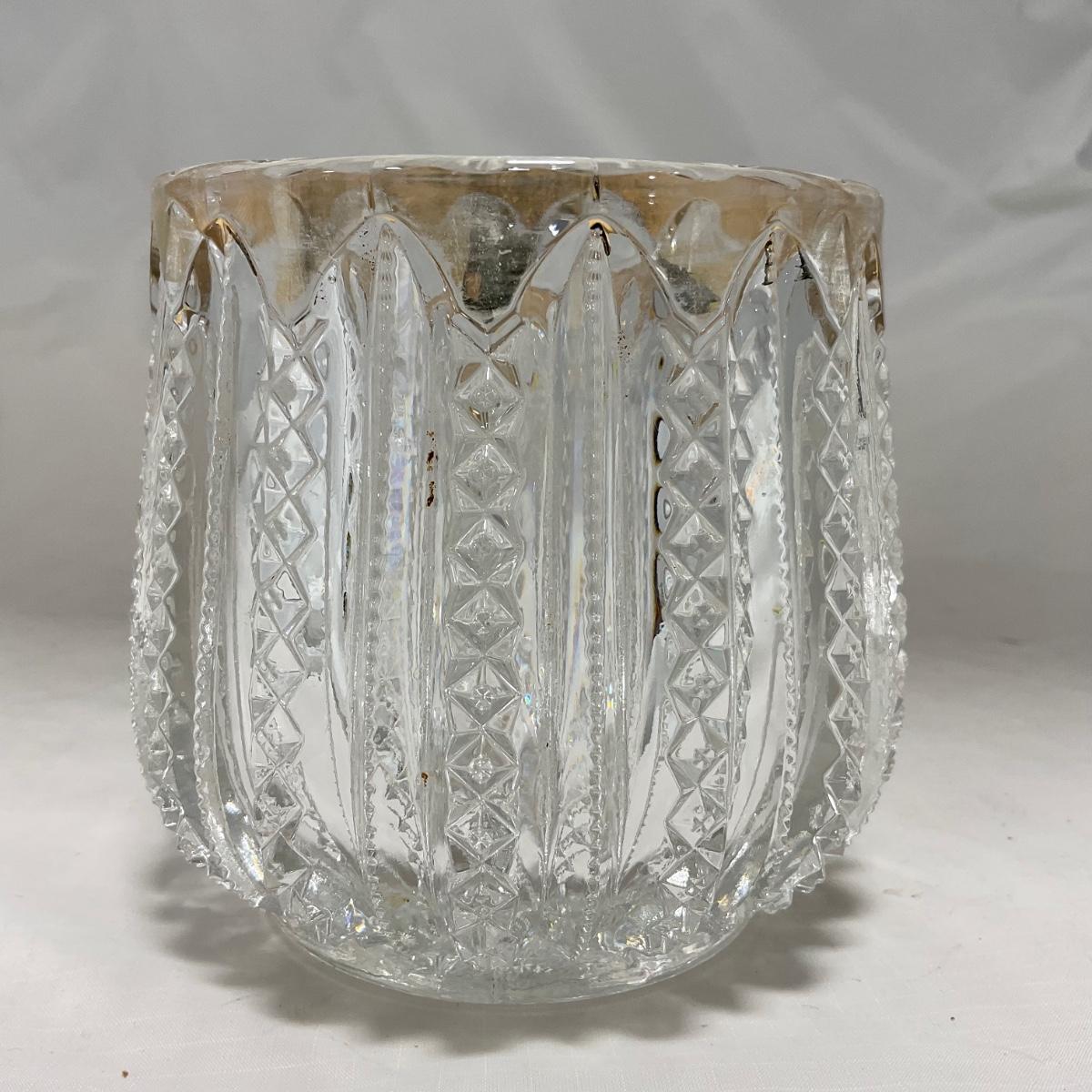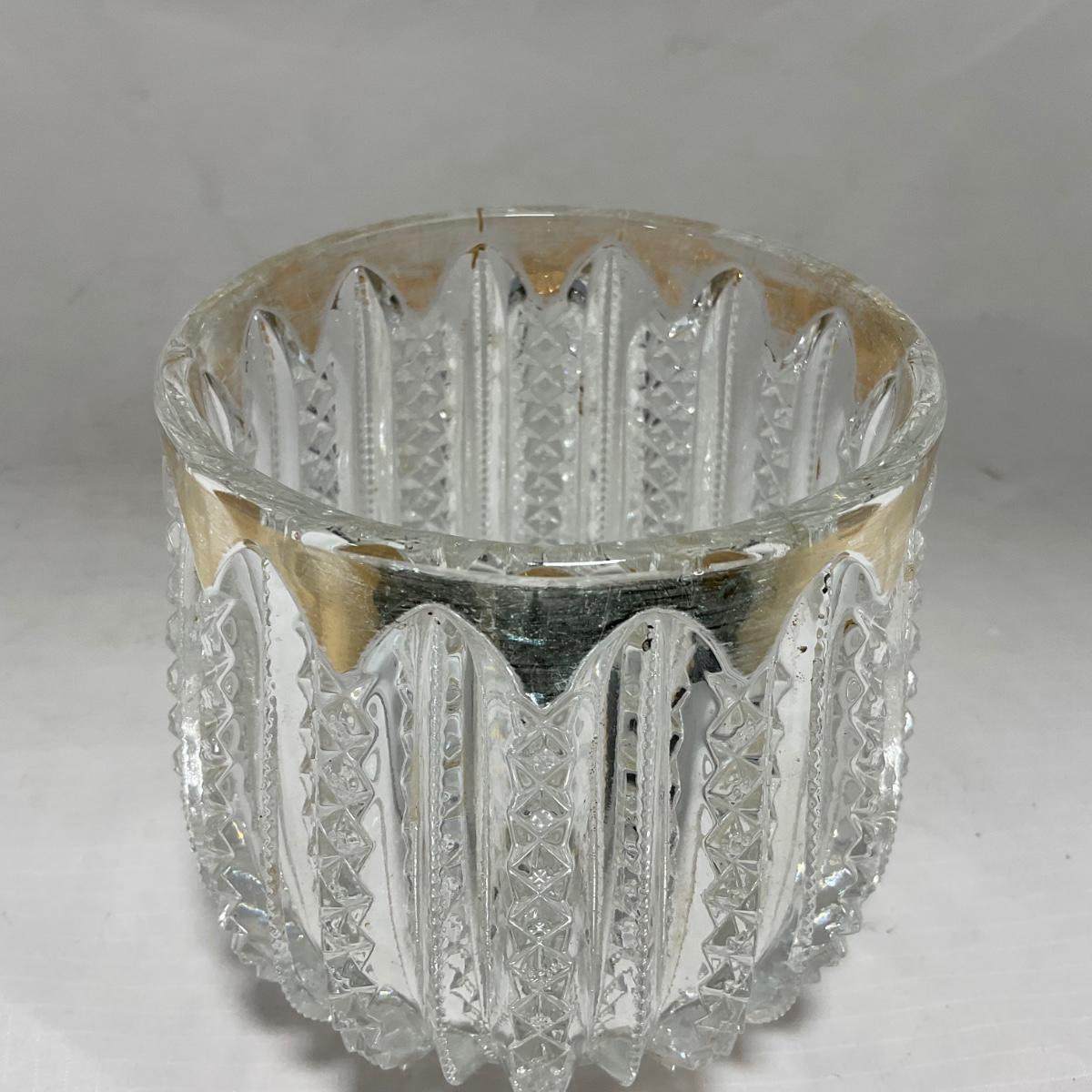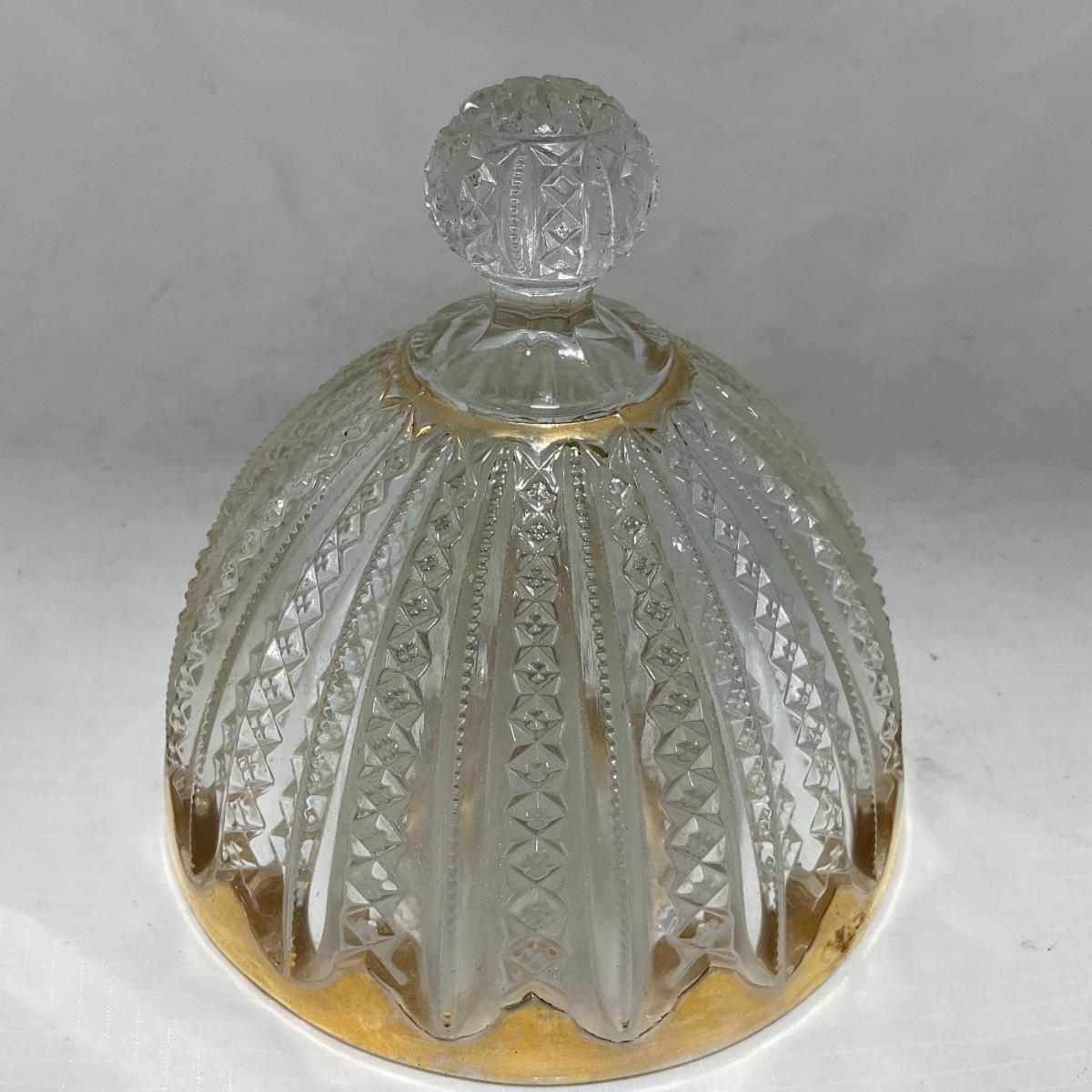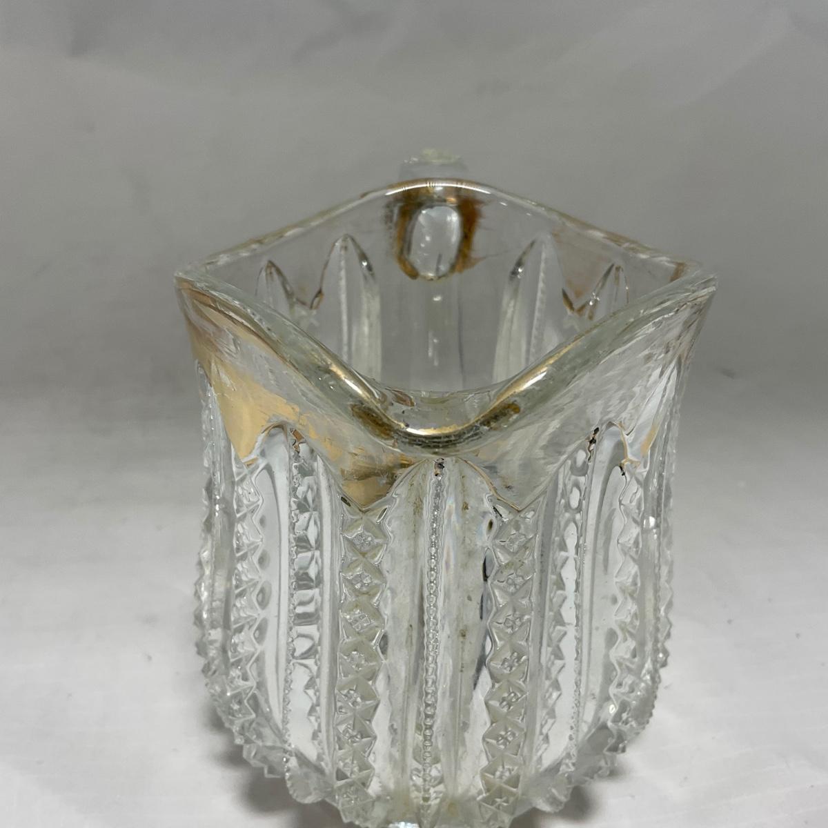 Clear glass with gold accents set. With gold accents and a cross checked type pattern this set has a classic elegant look. Set includes covered butter dish, lidded jar, creamer and sugar set. Please see photos for details and condition. ::: Shipping is available on this lot. If you require shipping you must let us know at the close of the auction. We will coordinate with you after the item has been won. Shipping fees will include insurance up to or exceeding the value of all items being mailed. If you have any questions regarding this lot please contact the auctioneer either via this website, by direct email or by phone. PICK UP TIMES and other important information can be found in the TERMS and DESCRIPTION of the auction. Please take a look for pertinent information. Thanks!