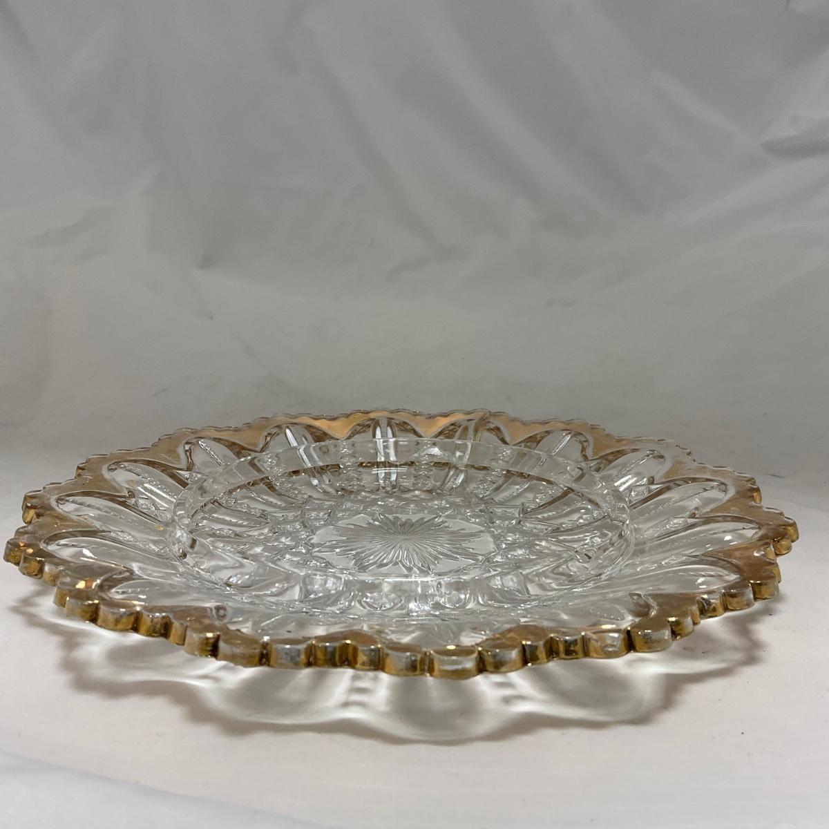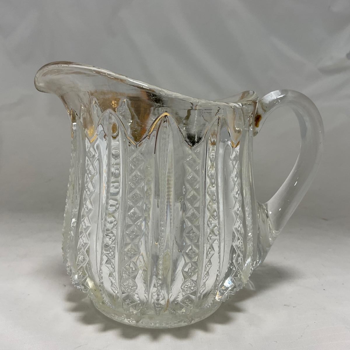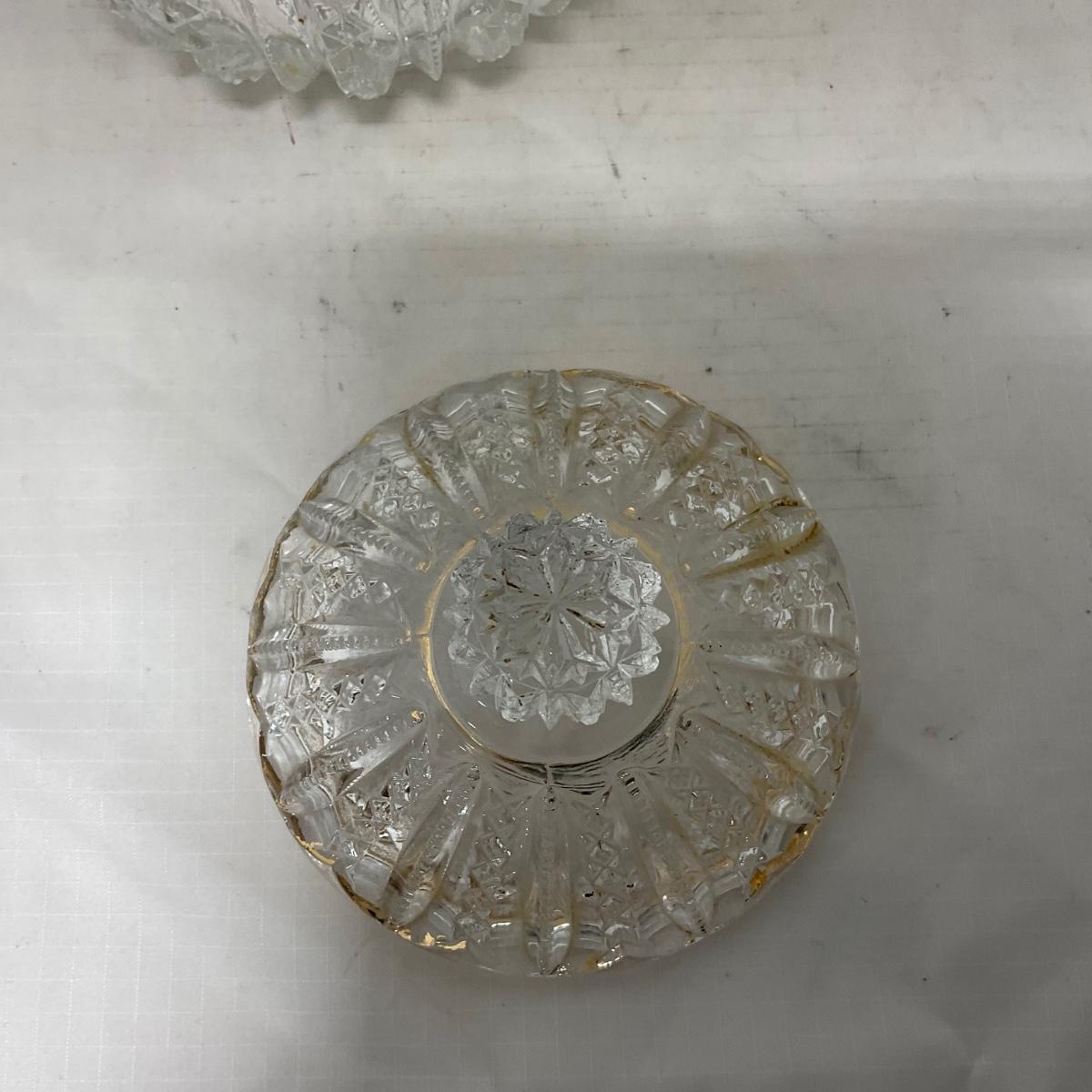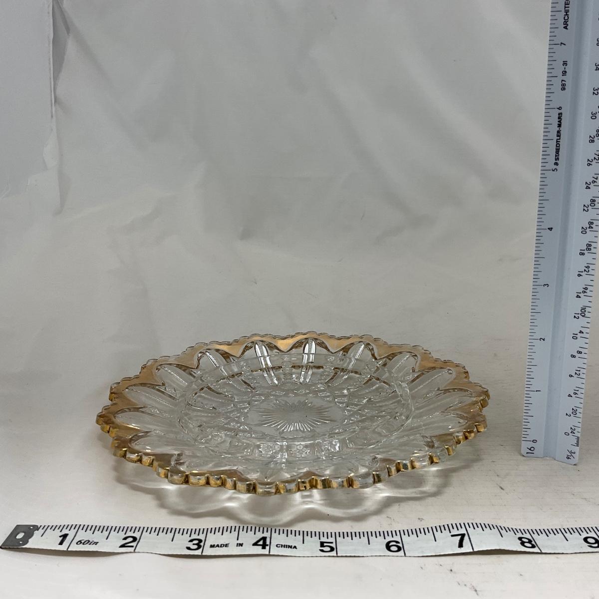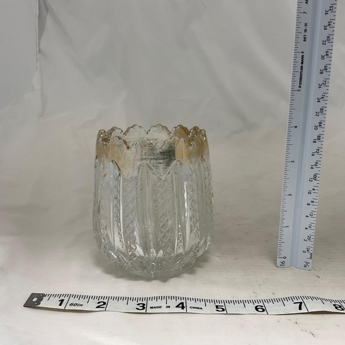 Clear glass with gold accents set. With gold accents and a cross checked type pattern this set has a classic elegant look. Set includes covered butter dish, lidded jar, creamer and sugar set. Please see photos for details and condition. ::: Shipping is available on this lot. If you require shipping you must let us know at the close of the auction. We will coordinate with you after the item has been won. Shipping fees will include insurance up to or exceeding the value of all items being mailed. If you have any questions regarding this lot please contact the auctioneer either via this website, by direct email or by phone. PICK UP TIMES and other important information can be found in the TERMS and DESCRIPTION of the auction. Please take a look for pertinent information. Thanks!