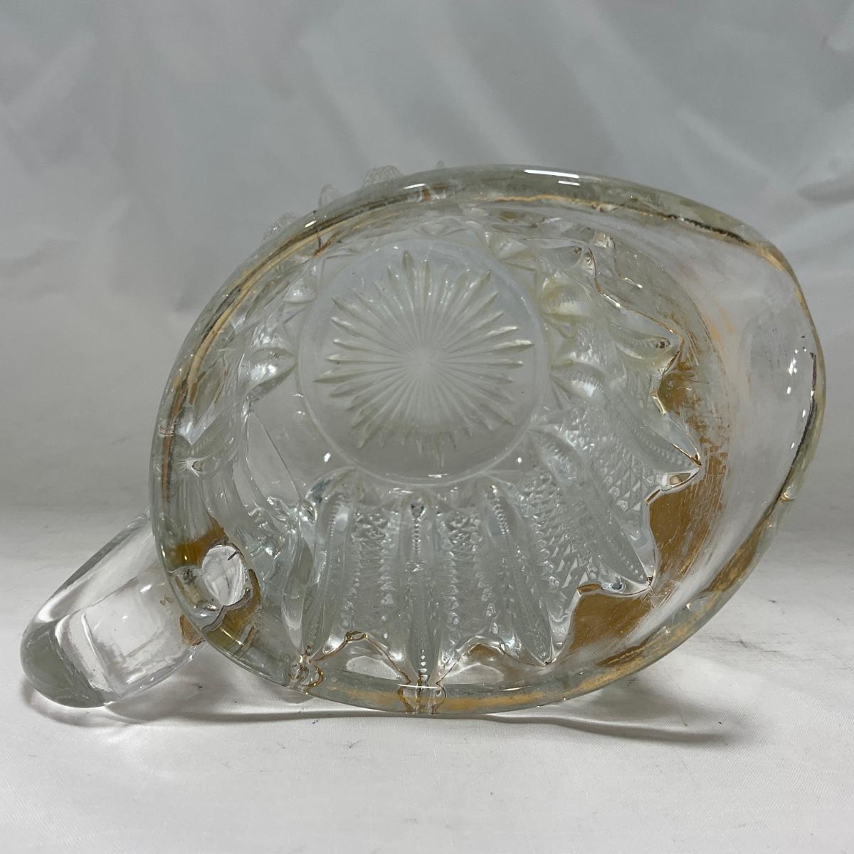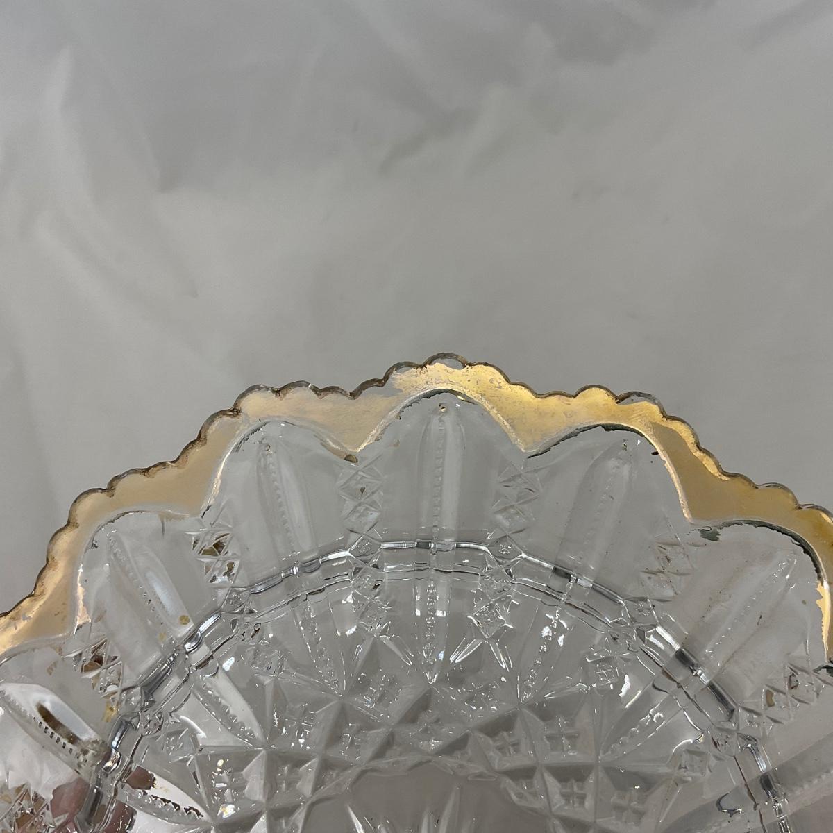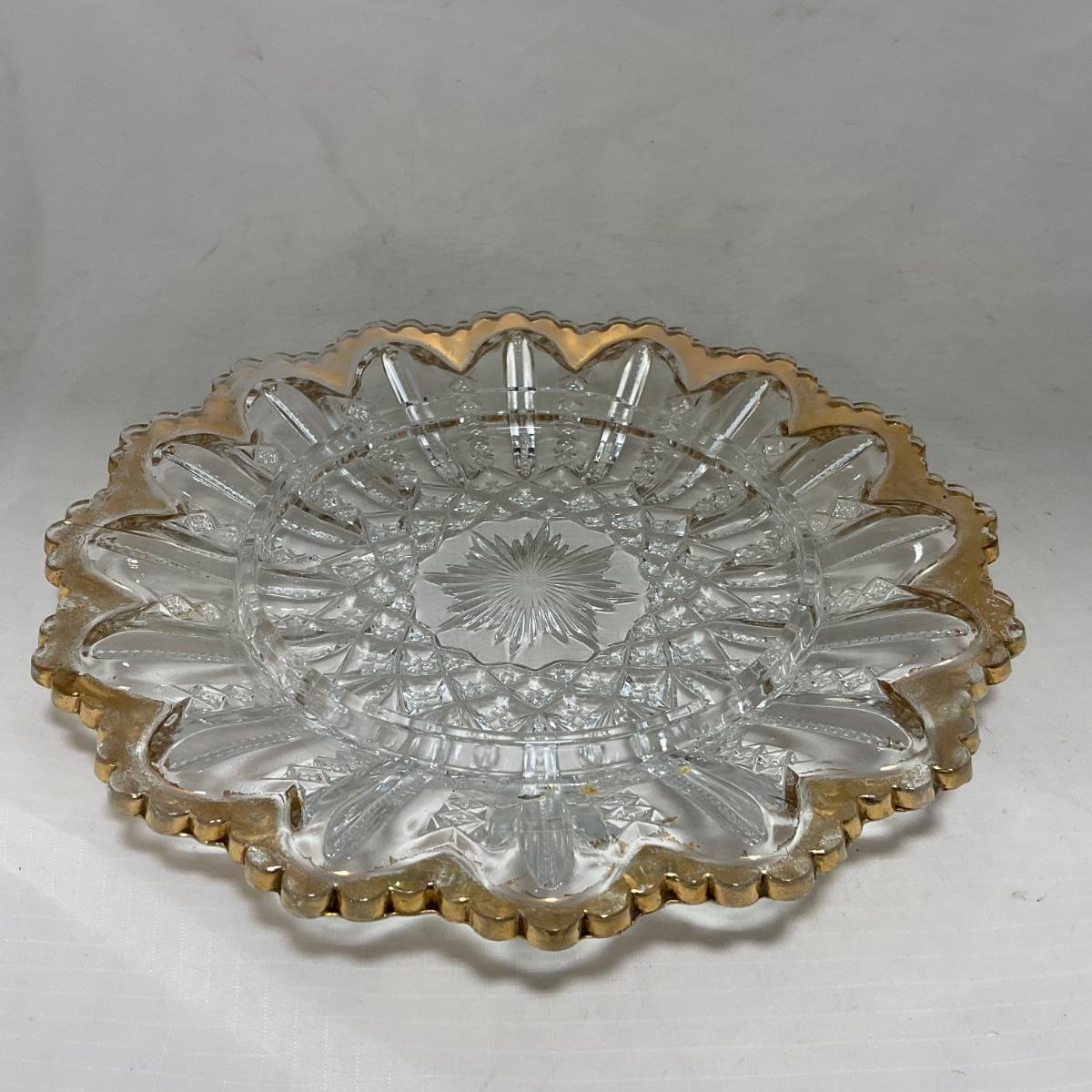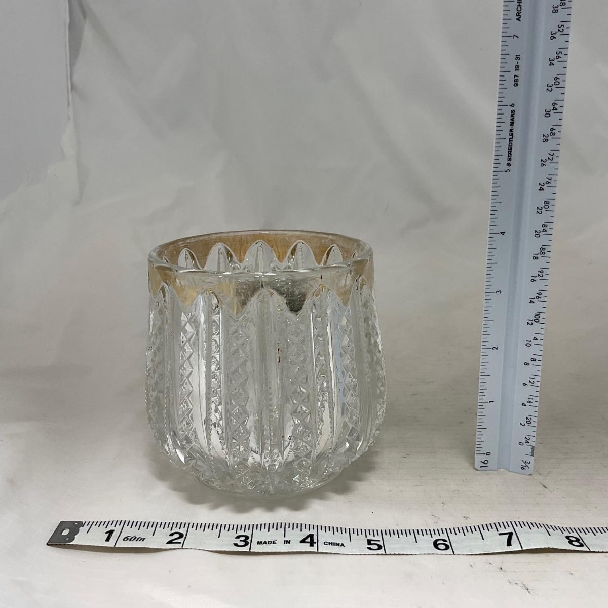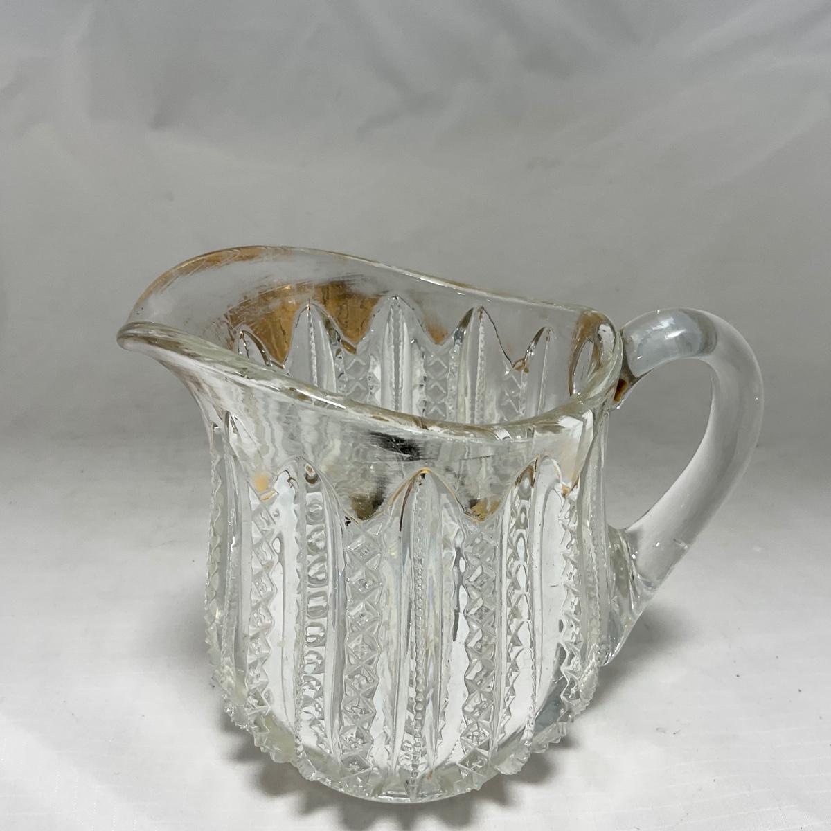 Clear glass with gold accents set. With gold accents and a cross checked type pattern this set has a classic elegant look. Set includes covered butter dish, lidded jar, creamer and sugar set. Please see photos for details and condition. ::: Shipping is available on this lot. If you require shipping you must let us know at the close of the auction. We will coordinate with you after the item has been won. Shipping fees will include insurance up to or exceeding the value of all items being mailed. If you have any questions regarding this lot please contact the auctioneer either via this website, by direct email or by phone. PICK UP TIMES and other important information can be found in the TERMS and DESCRIPTION of the auction. Please take a look for pertinent information. Thanks!