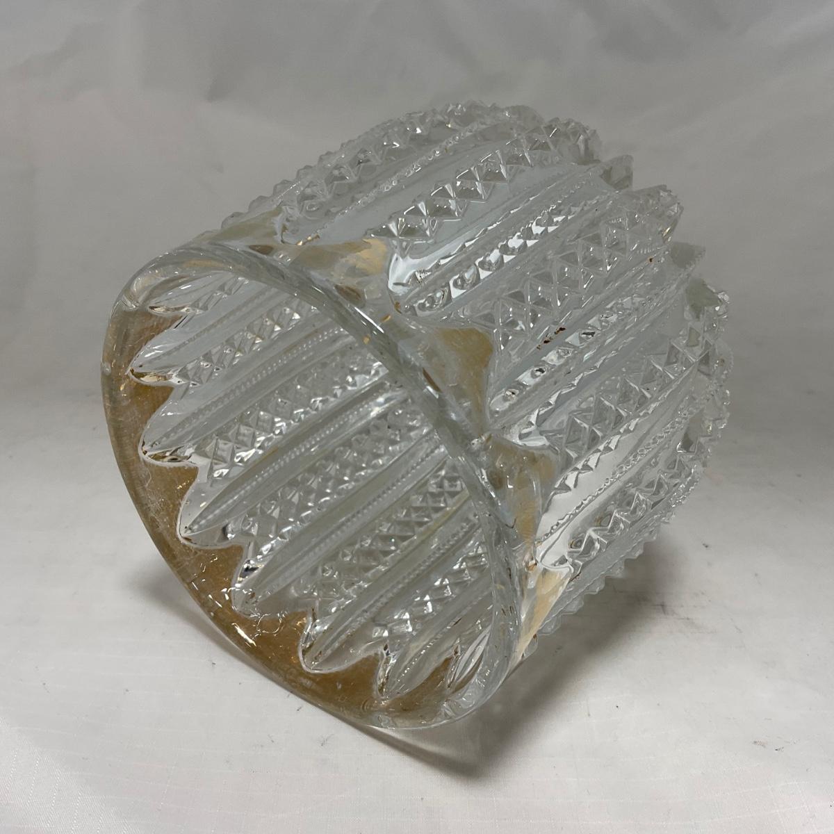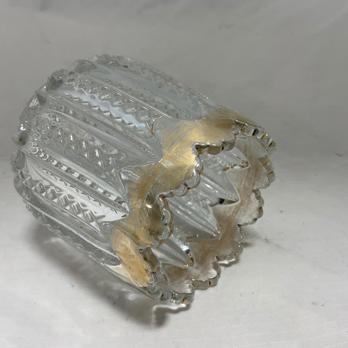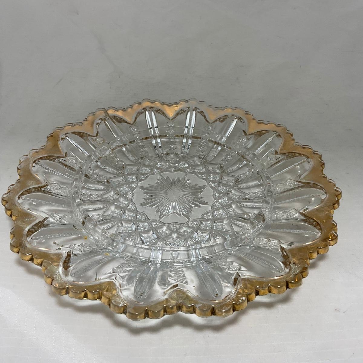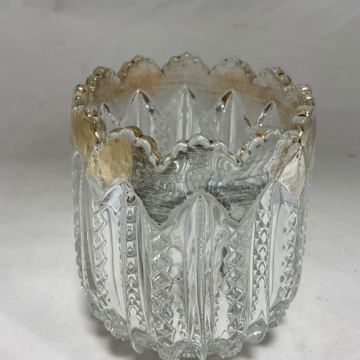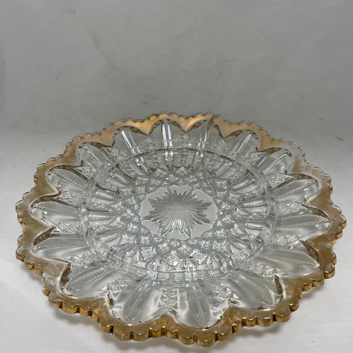 Clear glass with gold accents set. With gold accents and a cross checked type pattern this set has a classic elegant look. Set includes covered butter dish, lidded jar, creamer and sugar set. Please see photos for details and condition. ::: Shipping is available on this lot. If you require shipping you must let us know at the close of the auction. We will coordinate with you after the item has been won. Shipping fees will include insurance up to or exceeding the value of all items being mailed. If you have any questions regarding this lot please contact the auctioneer either via this website, by direct email or by phone. PICK UP TIMES and other important information can be found in the TERMS and DESCRIPTION of the auction. Please take a look for pertinent information. Thanks!