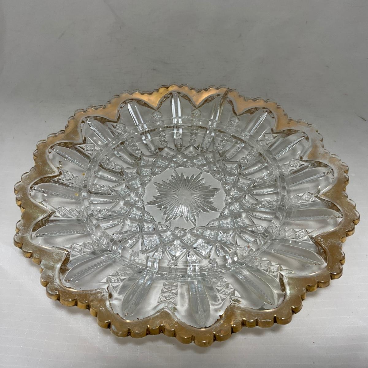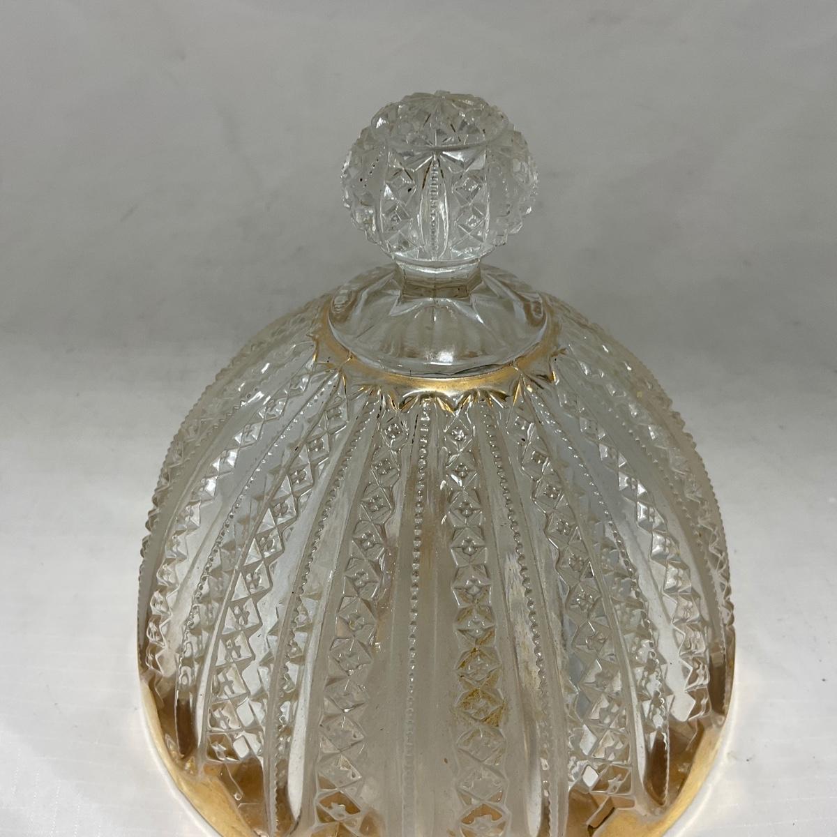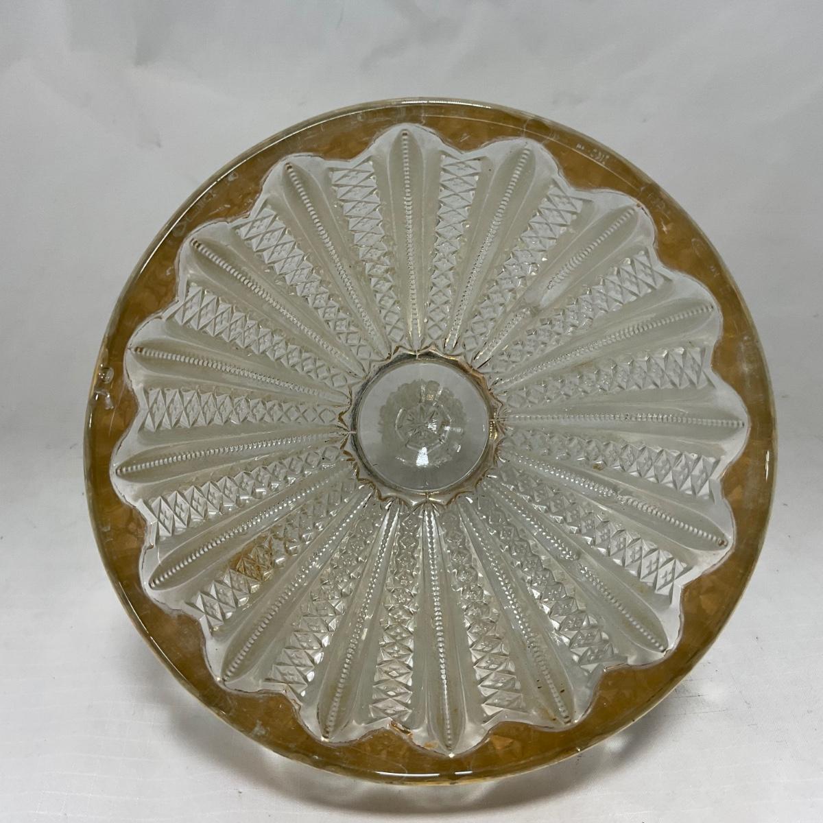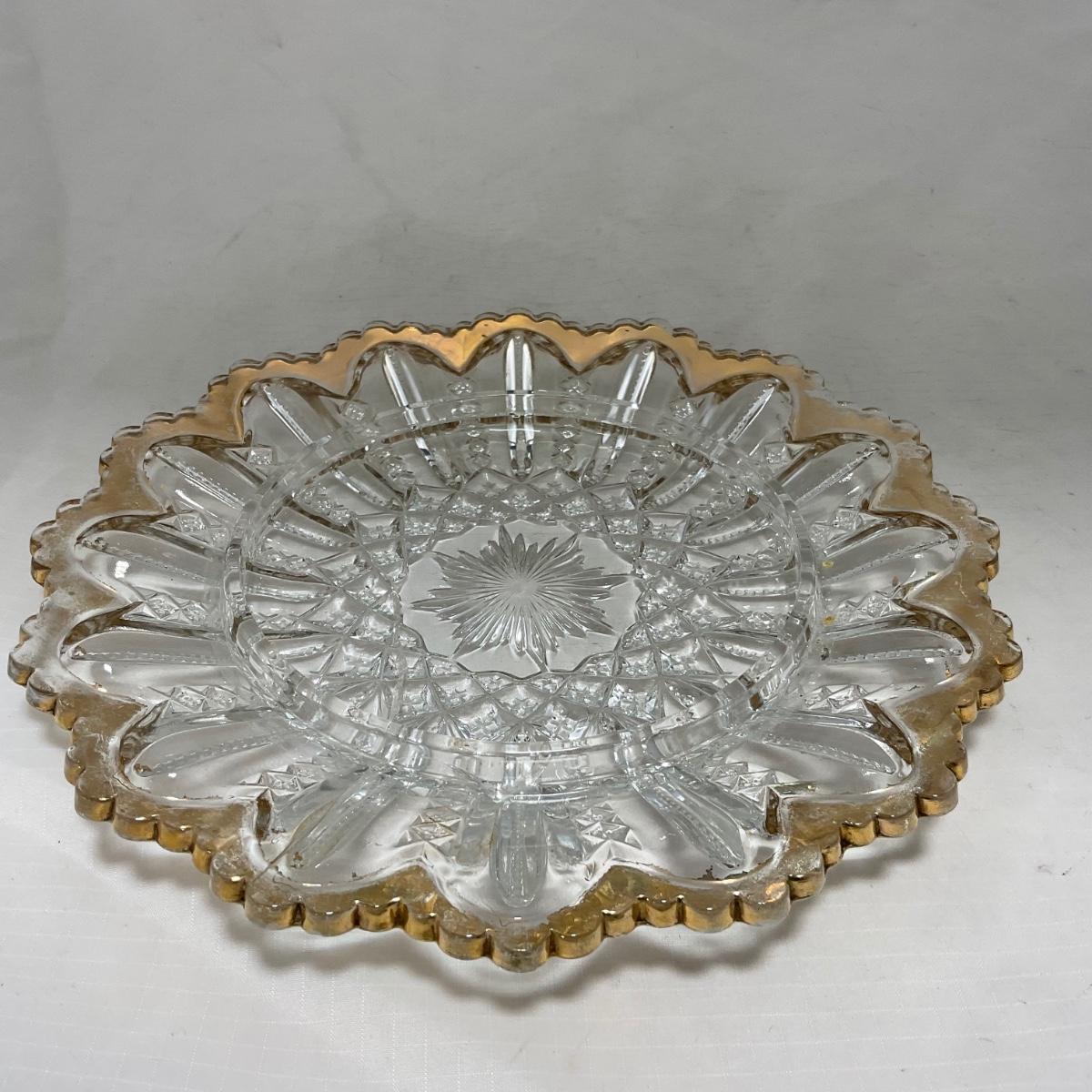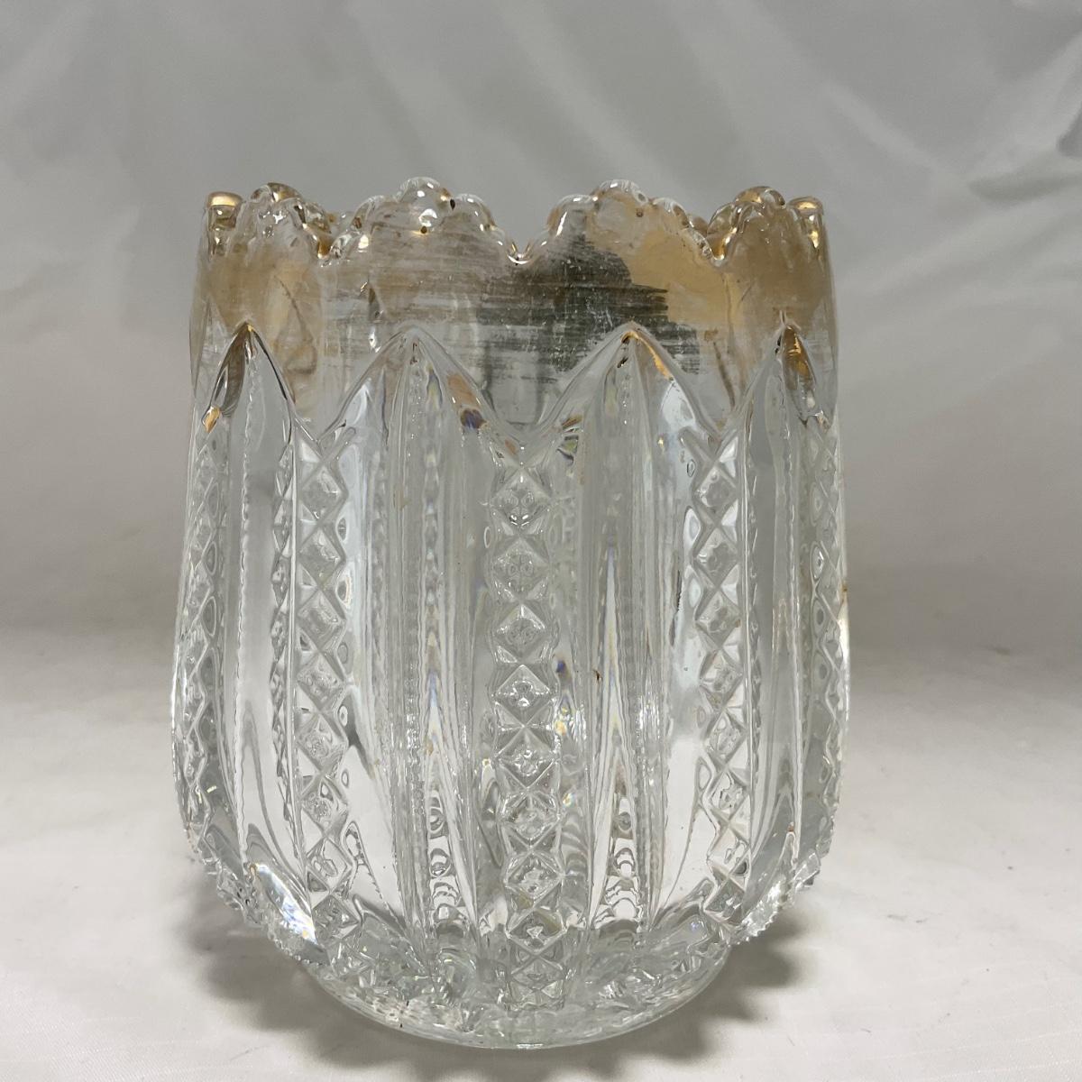 Clear glass with gold accents set. With gold accents and a cross checked type pattern this set has a classic elegant look. Set includes covered butter dish, lidded jar, creamer and sugar set. Please see photos for details and condition. ::: Shipping is available on this lot. If you require shipping you must let us know at the close of the auction. We will coordinate with you after the item has been won. Shipping fees will include insurance up to or exceeding the value of all items being mailed. If you have any questions regarding this lot please contact the auctioneer either via this website, by direct email or by phone. PICK UP TIMES and other important information can be found in the TERMS and DESCRIPTION of the auction. Please take a look for pertinent information. Thanks!